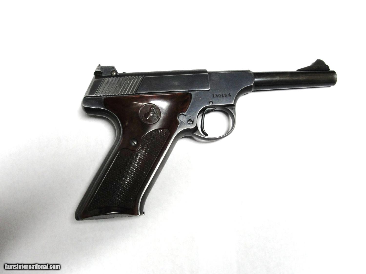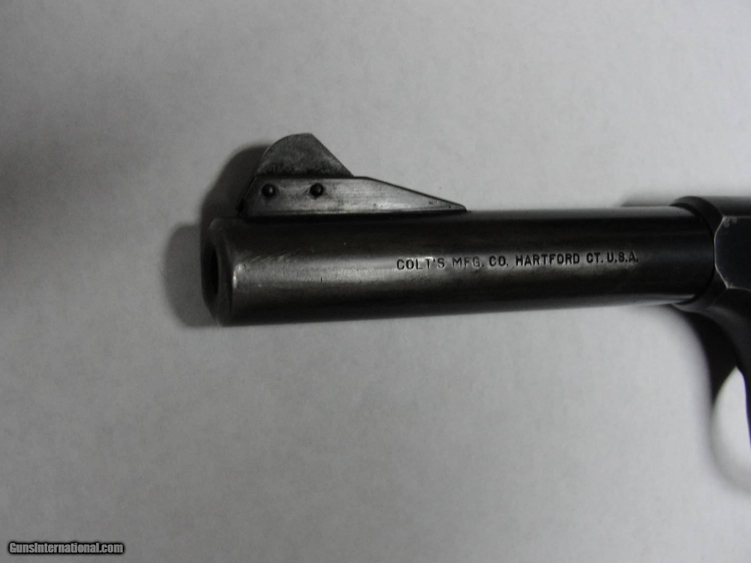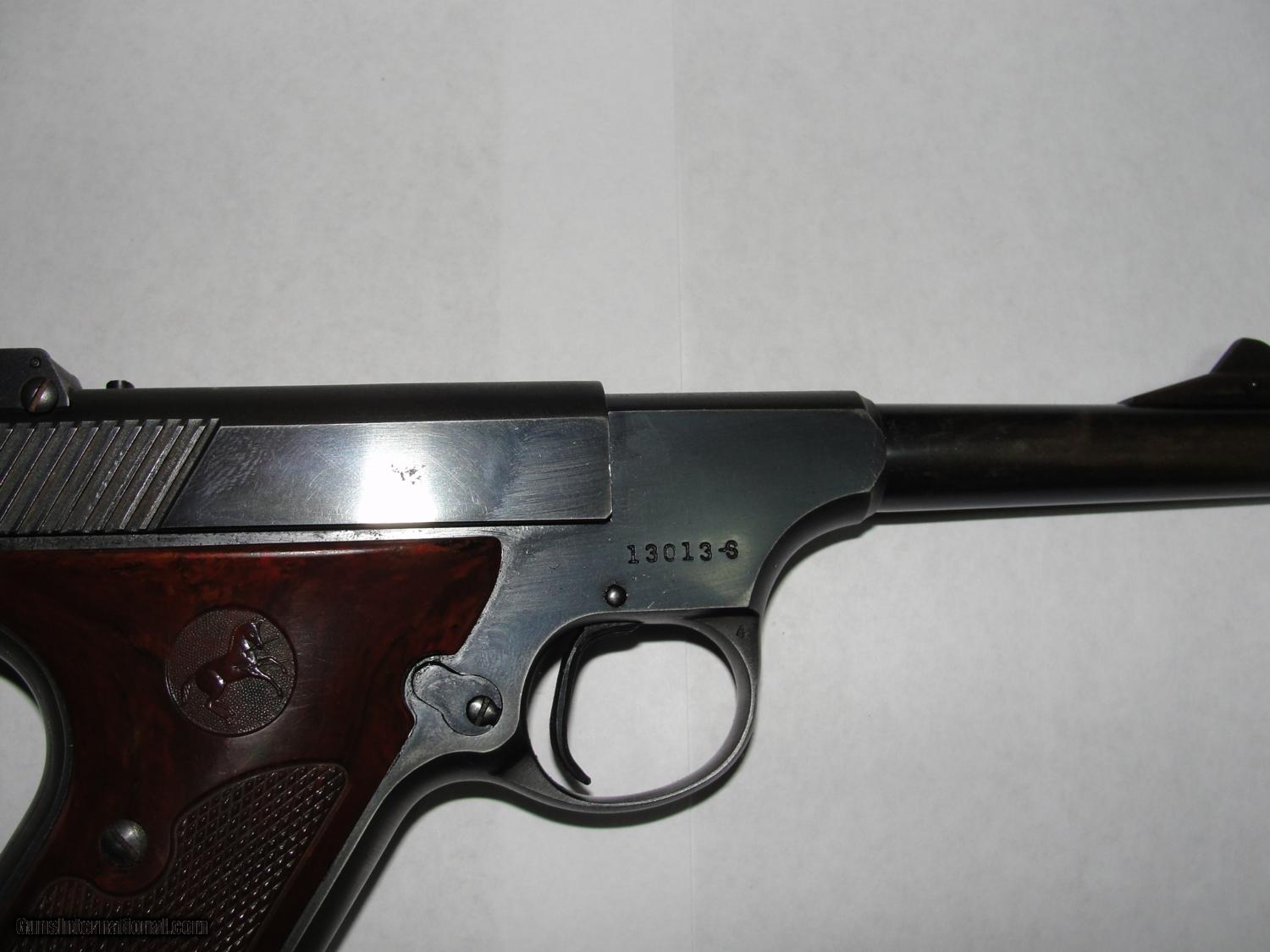 Description: 50's series Colt Woodsman .22lr. 4" barrel, colt plastic grips, adjustable sights, and push button mag release. Gun is mechanically good, but shows blue wear on barrel, and slight pitting around the colt logo. SOLD |