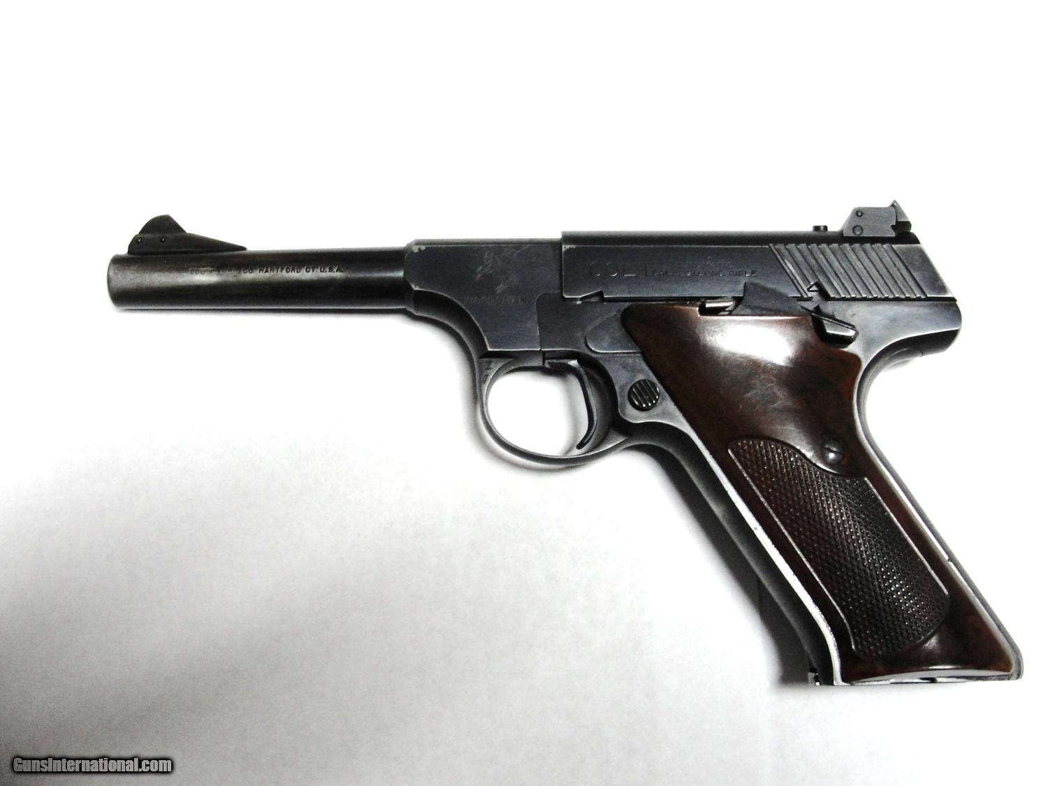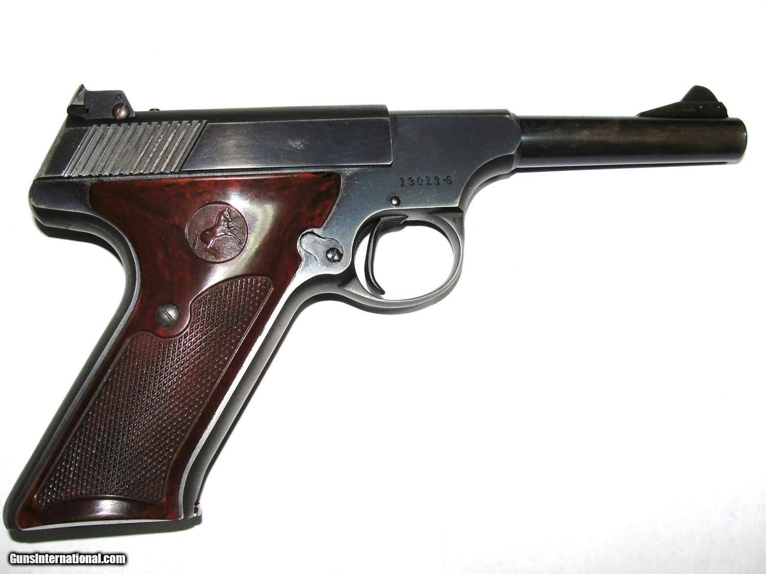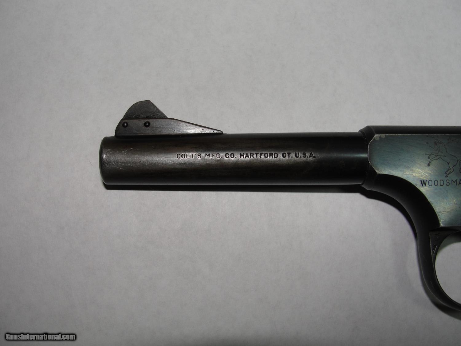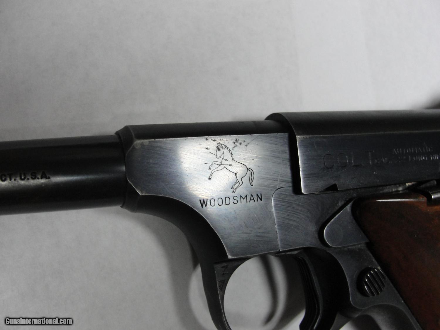 Description: 50's series Colt Woodsman .22lr. 4" barrel, colt plastic grips, adjustable sights, and push button mag release. Gun is mechanically good, but shows blue wear on barrel, and slight pitting around the colt logo. SOLD |