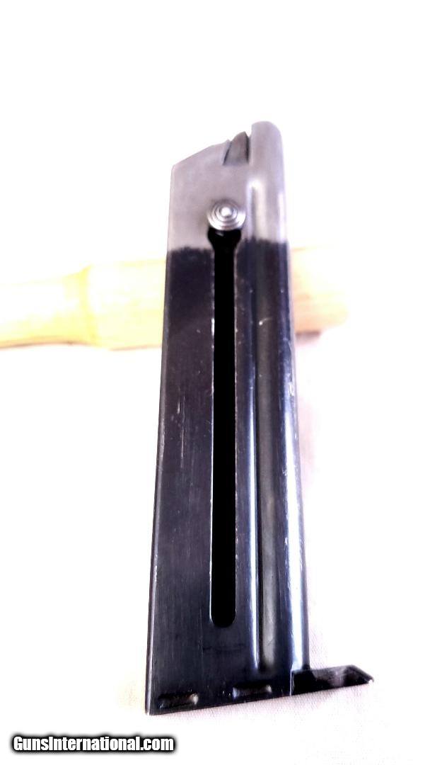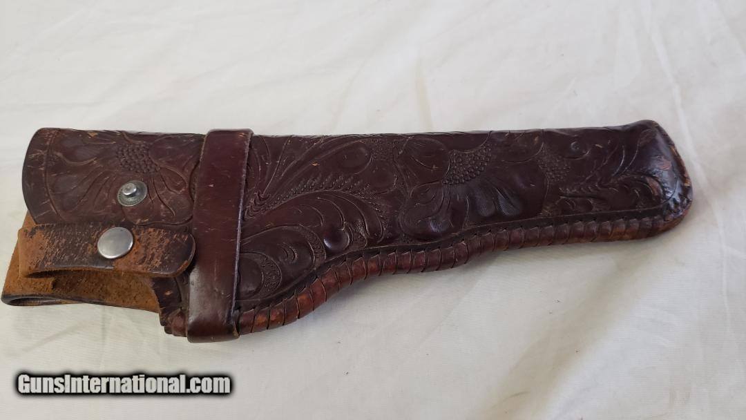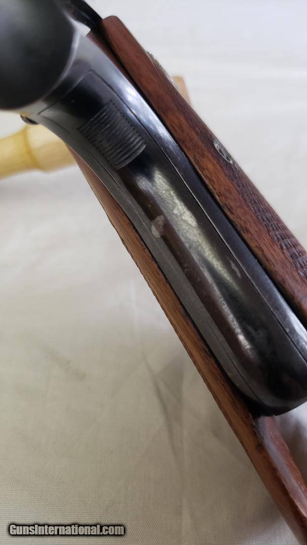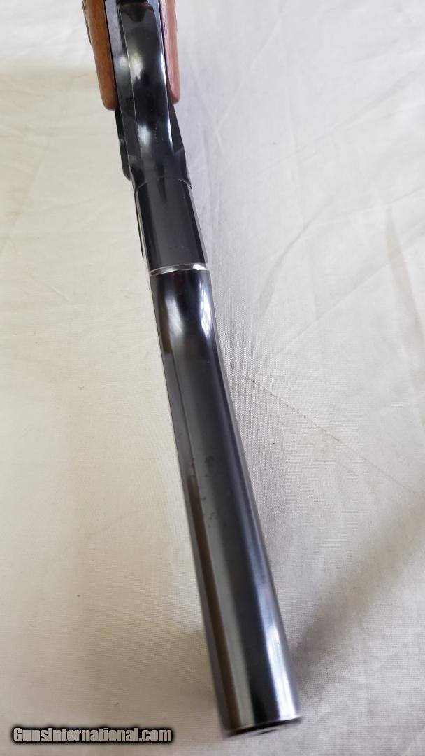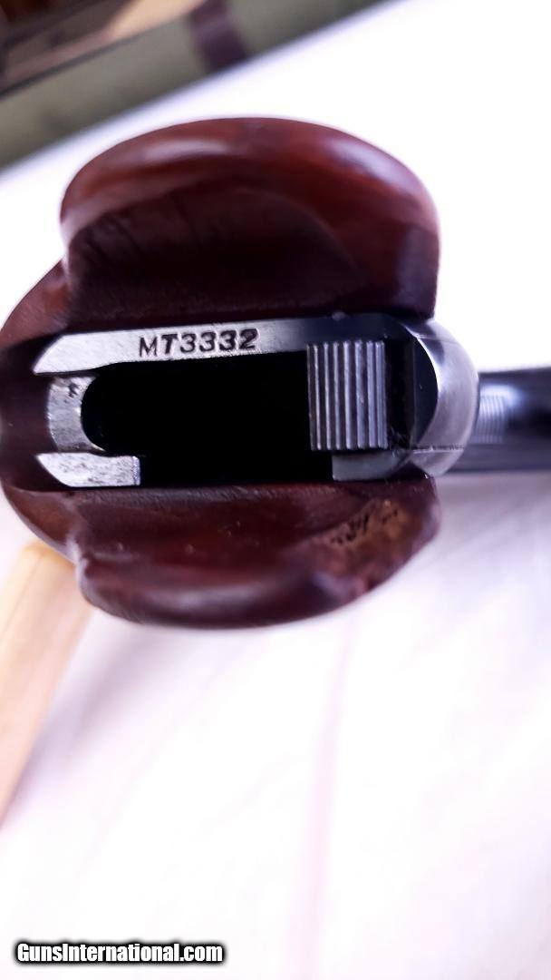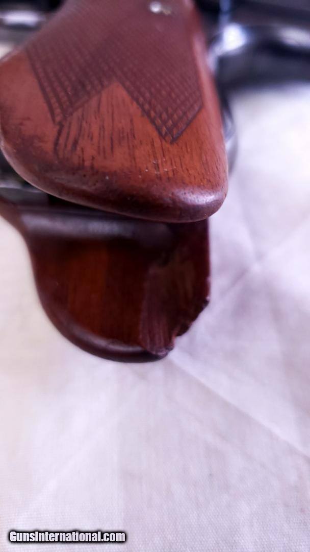 Description: This is a Colt Woodsman first series Match Target model, with the iconic elephant ear grips. This particular example was built in late 1938, or early 1939 with S/N MT3332. This variation of the Woodsman was introduced in 1938, so this is one of the first produced. This gun is quite nice, and carries a strong 85% original blue finish with a few blems from use, and being carried in what is most likely the H.H.Heiser holster purchased with it when new. This gun carries it's original sight package, and has a mint bore. The gun has the original and correct M/T magazine in two tone, with 3 lines of information on the base, also in excellent condition. There is a small chip missing from the base of the grip which I photographed, but no cracks or anything other then normal wear to the rest of the grip. Comes with the beautiful vintage Heiser holster pictured, a $200 value in itself. I do not have the box or manual for this piece. $1995 plus $40 S&I to lower 48. Only Postal money orders accepted, unless otherwise agreed. SOLD Manufacturer: Colt Model: Woodsman Match Target Serial Number: MT3332 Caliber Info: 22 |