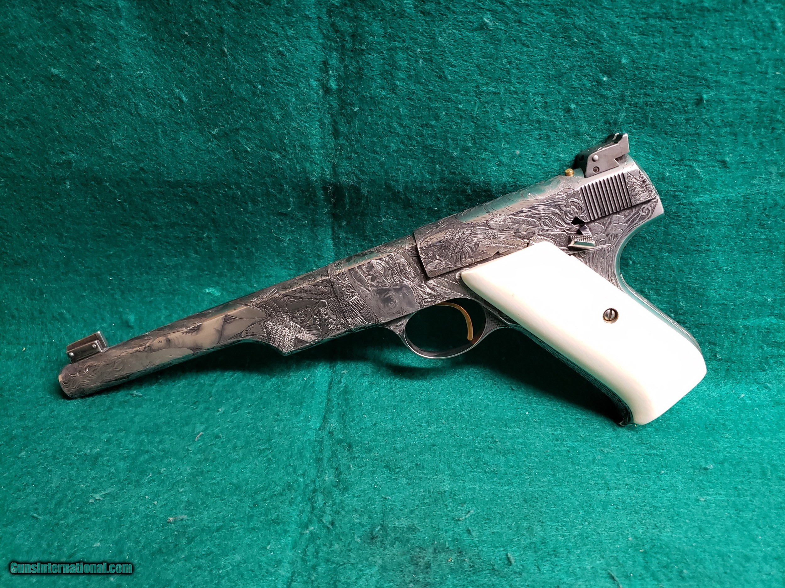 Description: This is a very unique Colt Woodsman Match Target that has been completely engraved by the expert engraver Jim Sornberger in a fantasy style with beautiful murals all around including eagles and a few naked ladies. Finishing off this beautiful pistol are a pair of handmade elephant ivory grips. The barrel is 6.5" with a minty bore that has sharp crisp rifling. In excellent condition with a tight action a nice crisp trigger. Comes with one OEM Colt magazine that is marked "Colt Woodsman Cal 22 L.R." Has the factory adjustable Match Target sights. Chambered in .22 LR. Built in 1940. See our pictures of this gorgeous piece of art and if you have any questions please call Justin or Ben at Olde West (530)243-8334. Buyer will pay actual shipping cost insured within the USA. -Payment Must be Received Within 15 Days or Item Will be Relisted -There Will Be a 3% Processing Fee Applied to all Credit Card Transactions -California Residents Will be Required to Pay Sales Tax of 7.25% -All Firearms Shipped and Insured Within the USA. Shipping Fees Calculated to Lower 48 States. Alaska and Hawaii May Cost Extra -NO INTERNATIONAL SALES -Generally Handguns Ship USPS Priority and Long Guns Ship UPS Ground -Shipping Can be Combined to Save You Money if You Purchase Multiple Guns of the Same Type (E.G. Pistols or Long Guns) -Please Message me for a Shipping Quote if the Listing Does not Specify a Rate -Many Handguns are Not Legal for Sale in California. Please Check the Item Description and California DOJ Handgun Roster -C&R Eligible Firearms May not be Shipped to C&R Holders Within California. They Must be Shipped to an FFL Dealer and Picked Up From There. We can Ship C&R eligible firearms directly to C&R Holders in all Other States -Antique Firearms (Firearms Made Before 1899) May be Shipped Direct Without an FFL Required. We do Require Photo Identification Proving That you are at Least 21 Years of age for Antique Firearms to be Shipped Direct. For Antique Firearms, we Also Require a Statement That you May Legally own Firearms -Please Check Your Local and State Laws Regarding Firearms and Magazine Restrictions Before Buying SOLD Curio/Relic: Yes Manufacturer: COLT Model: WOODSMAN MATCH TARGET 1ST SERIES Serial Number: MT8059 Caliber Info: .22 LR Condition: EXCELLENT Bore Condition: EXCELLENT WITH CRISP RIFLING Action: SEMI-AUTO Finish: STEEL IN-THE-WHITE Manufacture Date: 1940 Engraving: ENGRAVED BY JIM SORNBERGER FANTASY STYLE Extras: W-ONE ORIGINAL MAGAZINE |