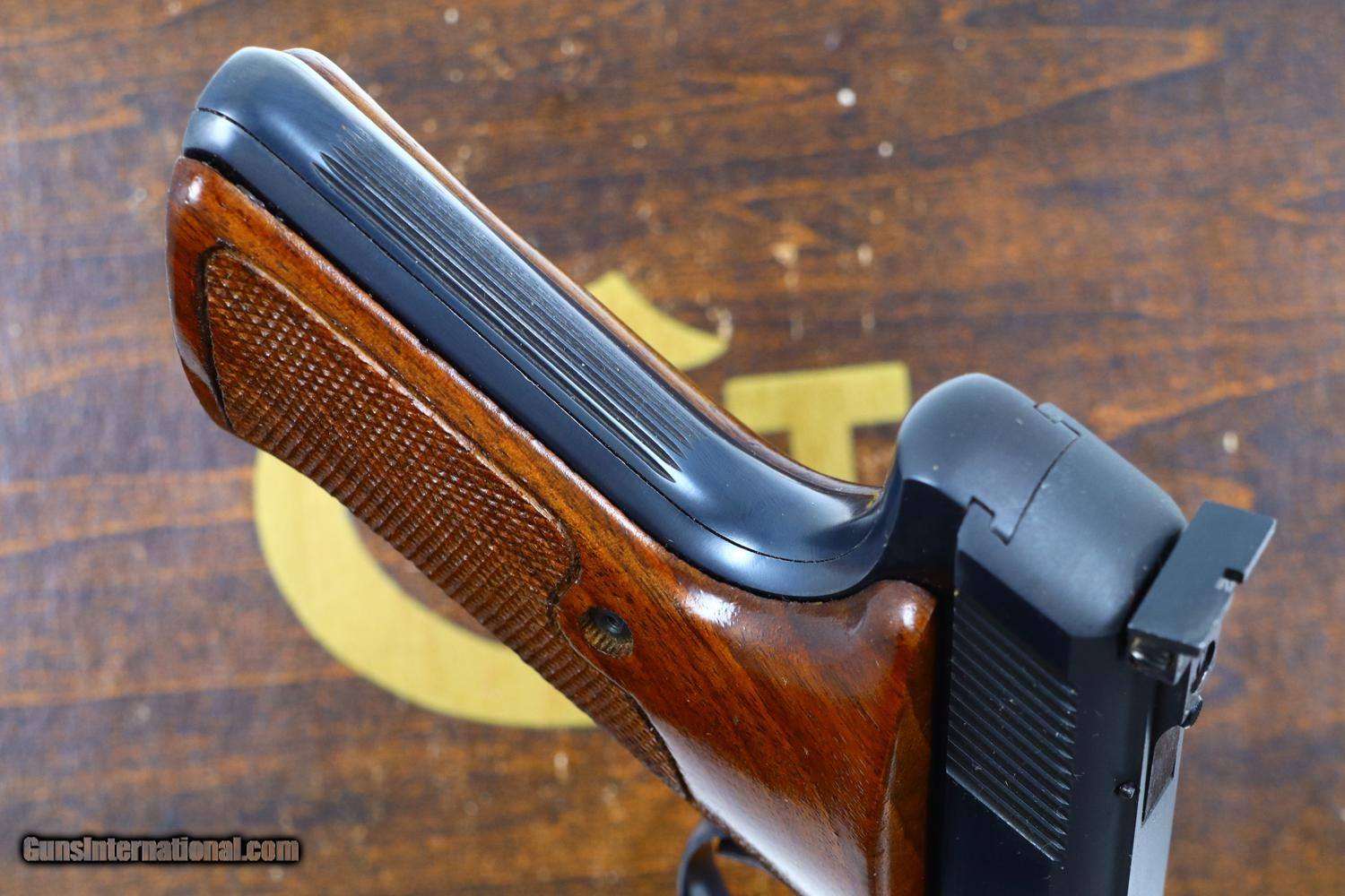 Description: Synopsis: Colt Woodsman, Match Target, 6” barrel, Original Shipping Box Description: Standard configuration Colt Match Target, third series with a 6 inch barrel having ramped patridge front sight and fully adjustable Elliason rear sight. Colt address and model on left side of barrel. Caliber on left side of slide. Serial number on right side of frame reflecting production in 1974. Vertically serrated front and backstrap. Fitted with wood grips, partially checkered, the left panel having a shallow thumb rest. Original magazine with a Colt marked floorplate. Complete with original and matching Colt shipping box with styrofoam insert. No literature or other accessories. Condition: Exc+ with 99+% high polish blue. Comparable condition grips. Mirror bore. Perfect manual mechanics. Box with considerable wear with scuffing and losses, one of the small side flaps, opposite side from the end lable, missing. ~~Insured shipping fee of $55; most packages shipped using FedEx 2nd Day.~~ SOLD Manufacturer: Colt Serial Number: 057777S Caliber Info: .22LR |