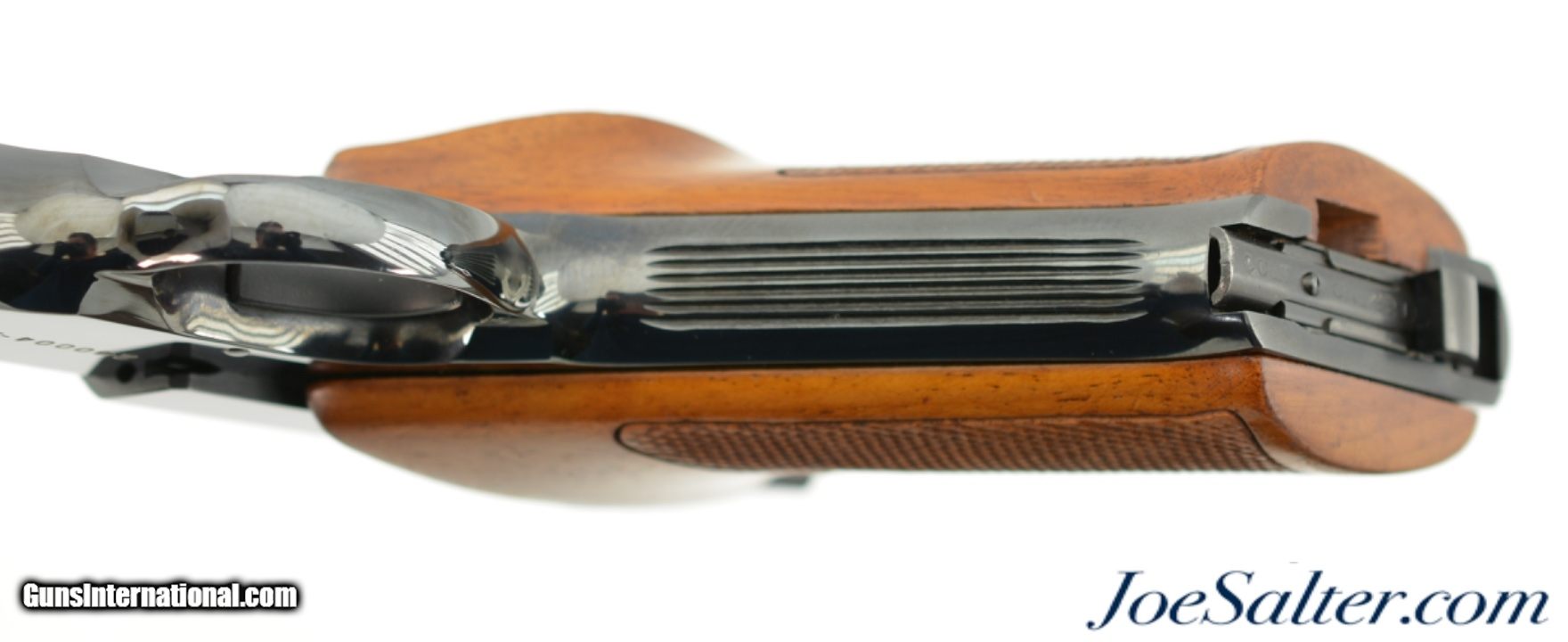 Description: Serial #240004-S, .22 LR, 6" heavy barrel with an excellent, bright bore. This is a 1968-made pistol that has 98-99% of the original blue remaining with only some hints of silvering at the muzzle and along a few of the high and exposed edges. Additionally, the markings have been filled with gold paint for legibility. The thumb-rest target grips are likewise in excellent shape with a few very minor handling marks and almost no flattening of the points. There is some small pieces of raised wood around the screw escutcheon on the RT side. The pistol is housed in its original, matching numbered Colt two-piece, woodgrain box with intact yellow end label. The box is a bit worn, with some corner separations, but is still in very good condition overall. This is an excellent, little-used example of a 3rd Series Match Target Woodsman, and would make a great addition to any collection. There are some reflections in the photographs. FFL or C&R; SOLD Curio/Relic: Yes |