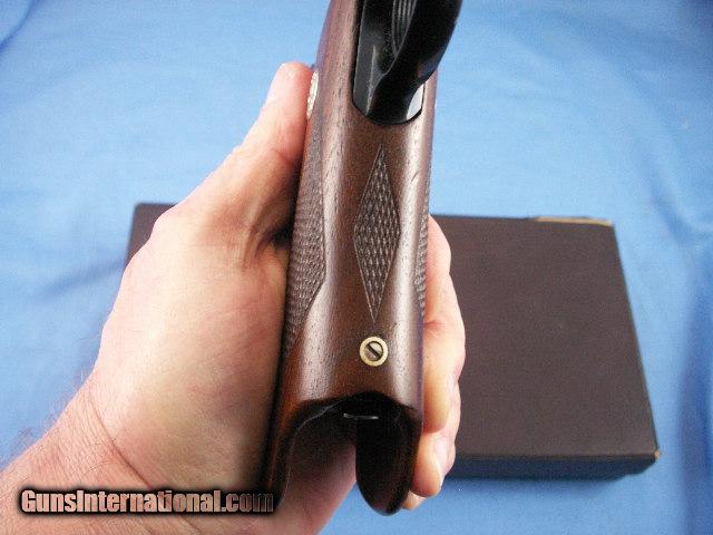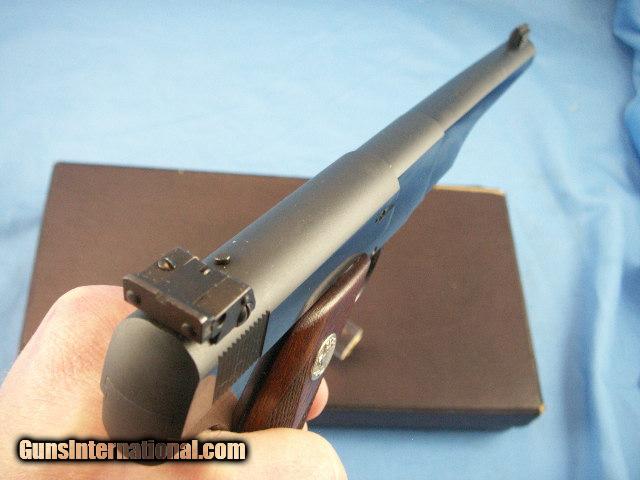 Description: For Sale: Colt 1st series Woodsman Match Target Bullseye pistol manufactured in 1941. This gun is in .22 LR caliber with a 6 5/8" barrel. It is rated at 99% original condition and comes with it's "numbered to gun" box,hang tags, screwdriver, manual, shooting suggestions pamphlet, proper ammunition pamphlet and cleaning brush in paper sleeve. The box is in excellent condition with a little paper separation on the top left corner. The box still has its original cardboard raised panels so the pistol with it "Elephant Ear" grips will set level. The bore and mechanics are perfect. The grips are free of cracks and are in super condition. If you are looking for one of the best examples of this Woodsman model for your collection this is it! Very difficult to find a pre-war Woodsman Match Target in this high condition and complete with all it's accoutraments. A beautiful Pistol and an excellent investment. SOLD Curio/Relic: Yes |