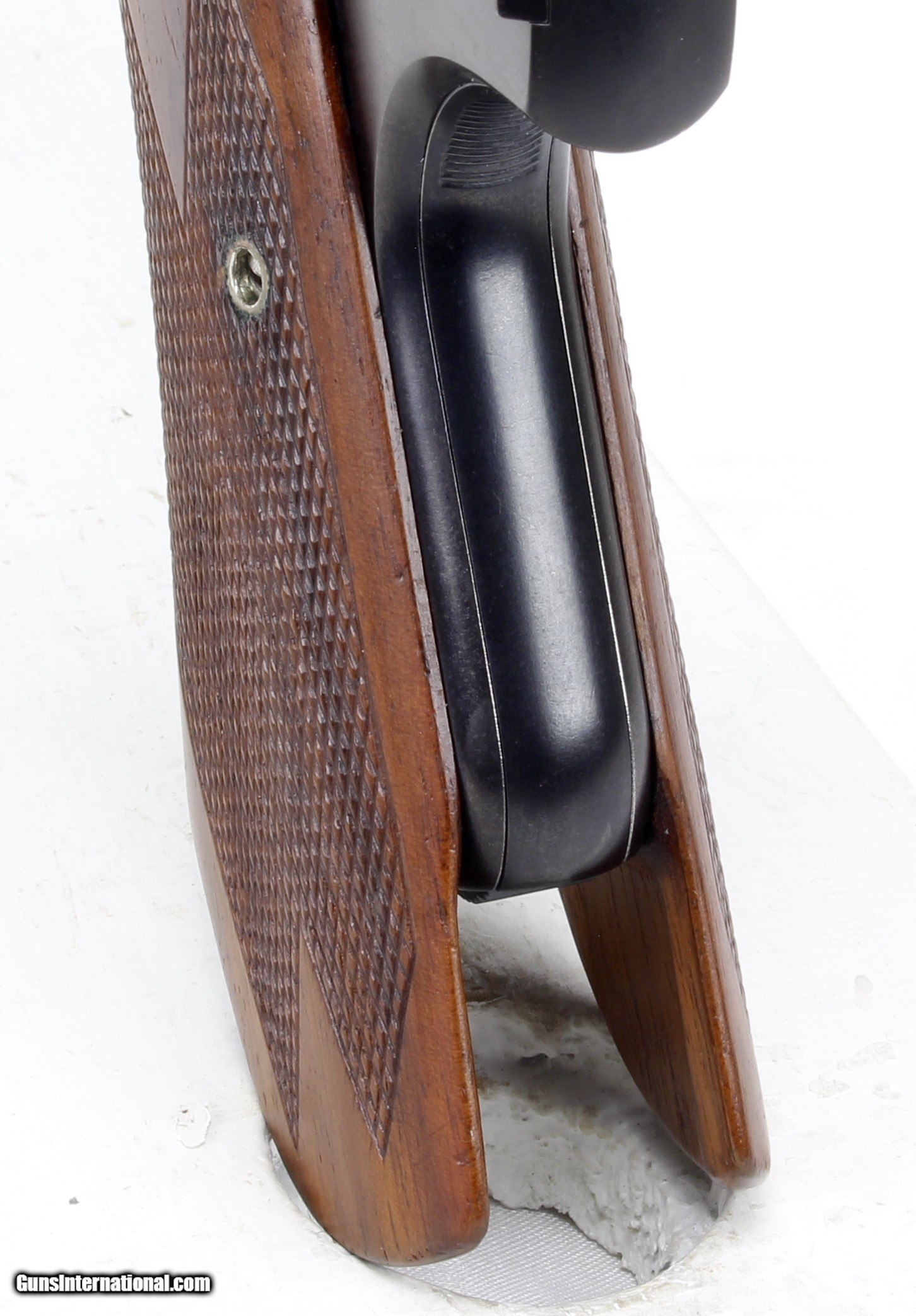 Description: Colt Woodsman Match Target Semi-Auto 1st Series Pistol in .22LR. SN #MT1227. Mfg. in 1938. COLT LETTER OF AUTHENTICITY INCLUDED. 6 5/8" Heavy Barrel with an EXCELLENT Bright Bore with STRONG RIFLING. The Blued Metal has been lightly TOUCHED UP by SHOOTER'S EXCHANGE and LOOKS GREAT. The Extended Walnut Grips, commonly referred to as Elephant Ears Grips, are in EXCELLENT condition. Original 10 round magazine with 3- line legend "COLT WOODSMAN", "CAL. 22LR", "MATCH TARGET MODEL". Comes in a Nice Red Felt Lined Wooden Display Box. Commonly referred to as the " Bullseye Match Target" and known to be real Tack Drivers. Would make a GREAT ADDITION to any COLT COLLECTION. Weight: 2.19 lbs. Trigger Pull: 2 1/4 lbs. More photos available upon request. Ships to Lower 48 W/ Insurance $40.00. PRICE REDUCED 3/13/22 SOLD Curio/Relic: Yes Handgun Caliber: .22 Long Rifle Manufacturer: Colt Model: Woodsman Match Target Serial Number: MT1227 Barrel Length: 6 5/8" Heavy Condition: Excellent Metal Condition: Refinished Wood Condition: Excellent Bore Condition: Excellent Action: Semi-Auto Finish: Blue Weight: 2.19 lbs. Manufacture Date: 1938 |