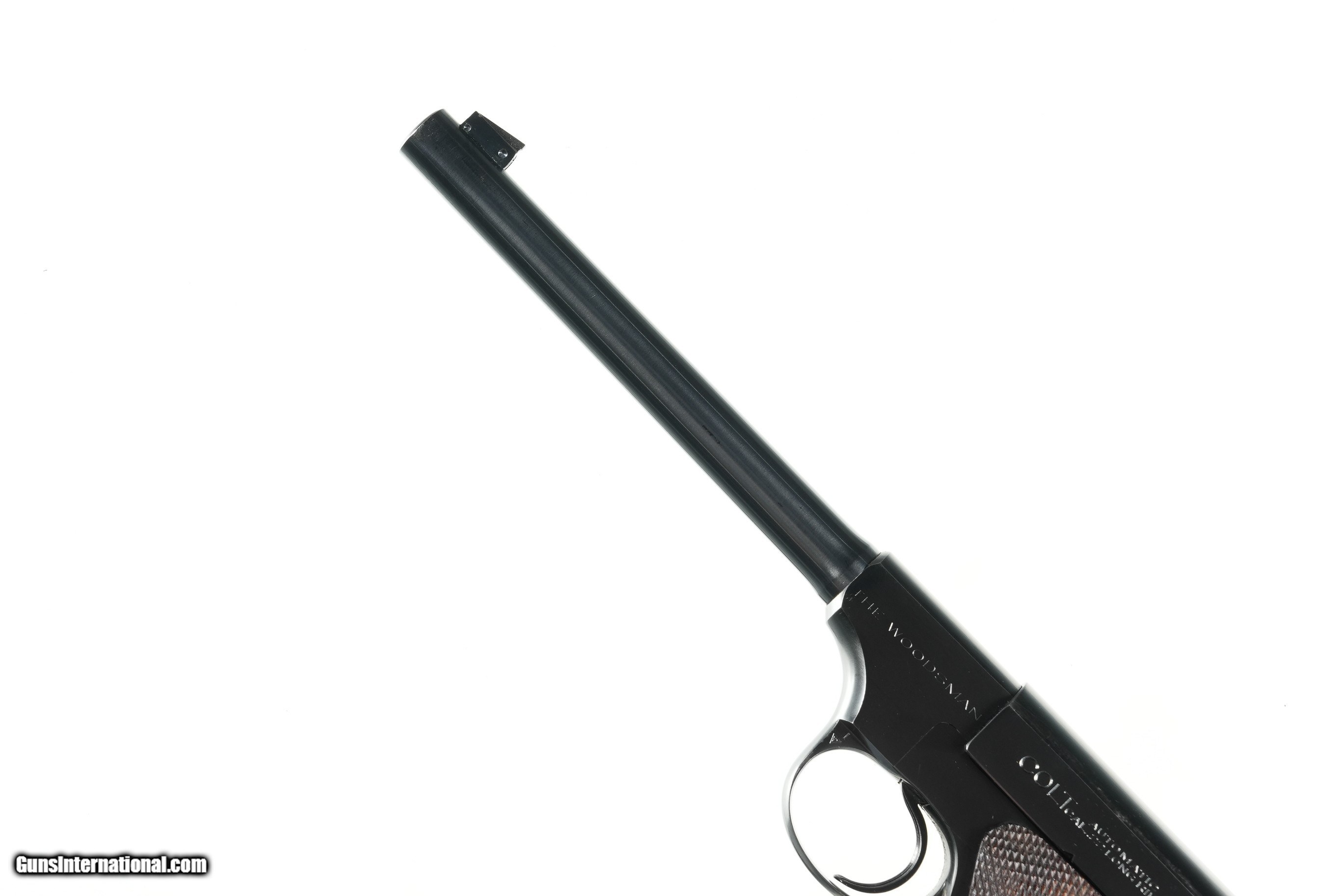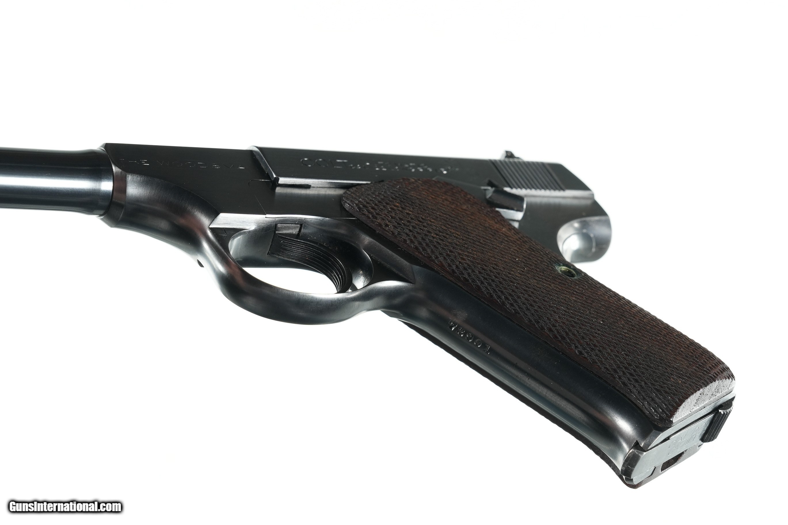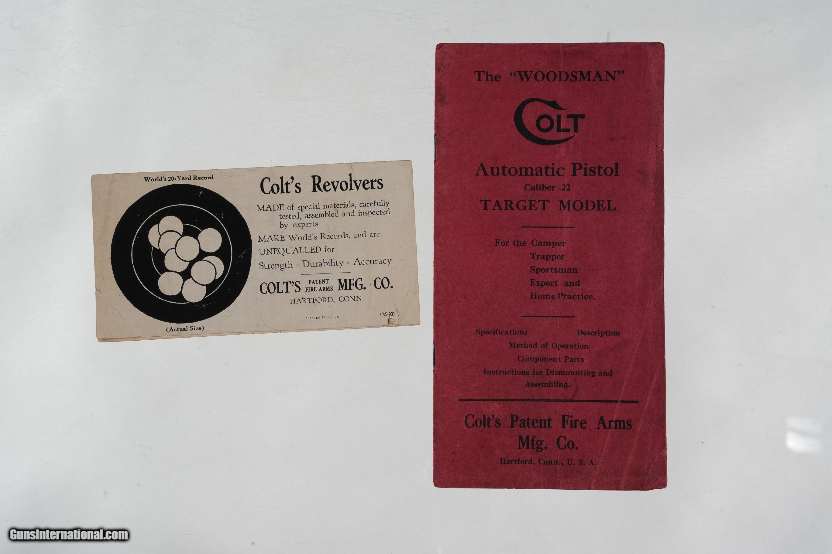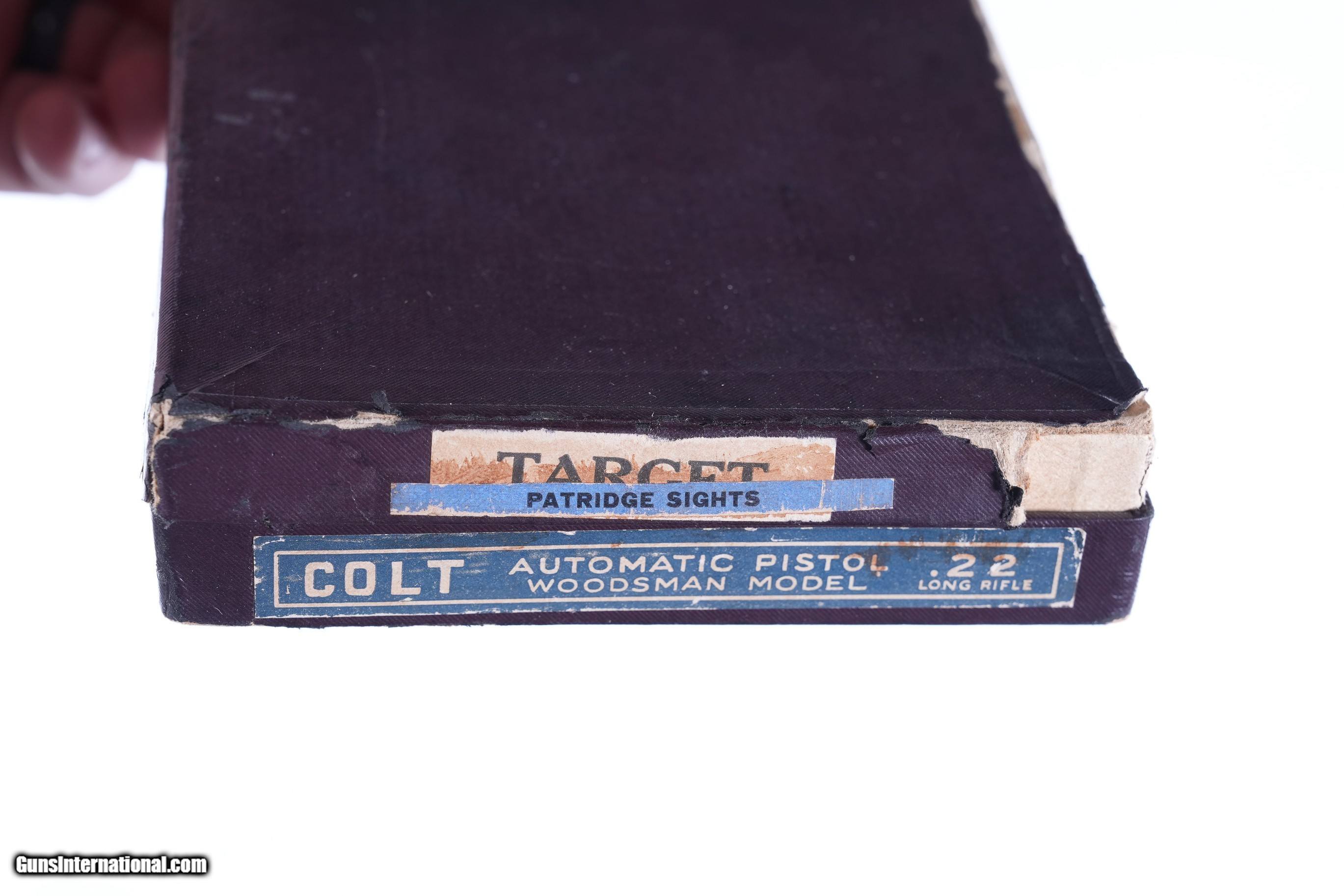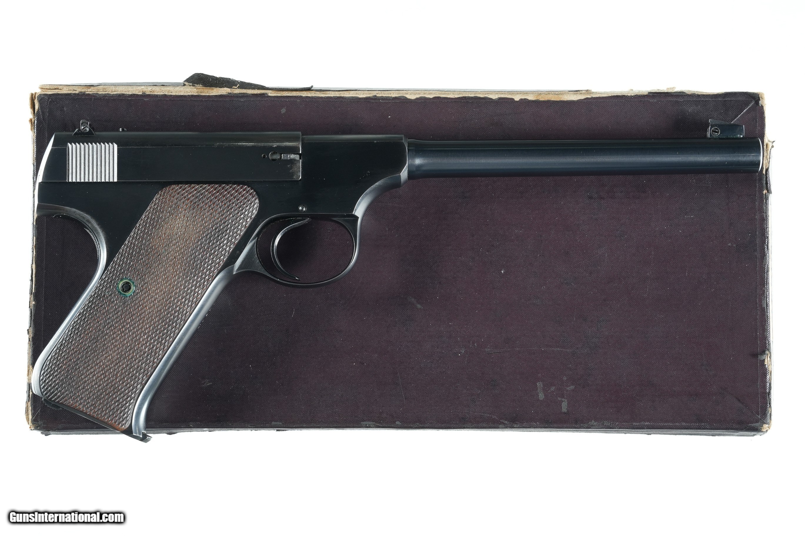 Description: Colt Woodsman 1st Model with Target adjustable Patridge sights and numbers matching box with label and factory instruction manual. Mfd, 1930. Checkered walnut grips, 2 tone 10 round magazine. Condition, Very fine with 97% finish, brilliant bore and excellent grips. Box is very good with some material loss on outer edges. Mechanically fine • Free Shipping, No Credit Card Fees. • Lay-a-way available for this firearm. • 1/3 Down, a 1/3 in 30 Days, 1/3 in 60 Days. SOLD Curio/Relic: Yes Manufacturer: Colt Model: Woodsman Serial Number: 72901 Barrel Length: 6 1/2 |