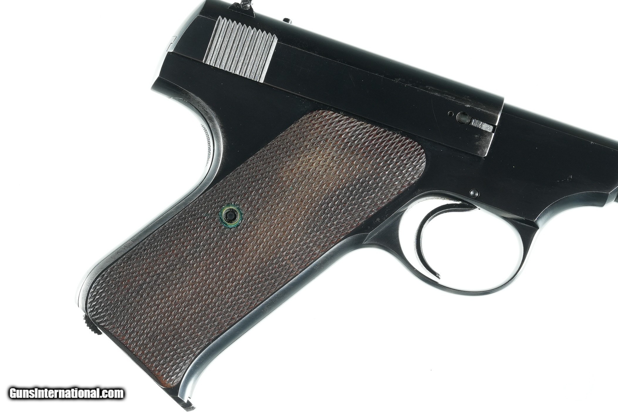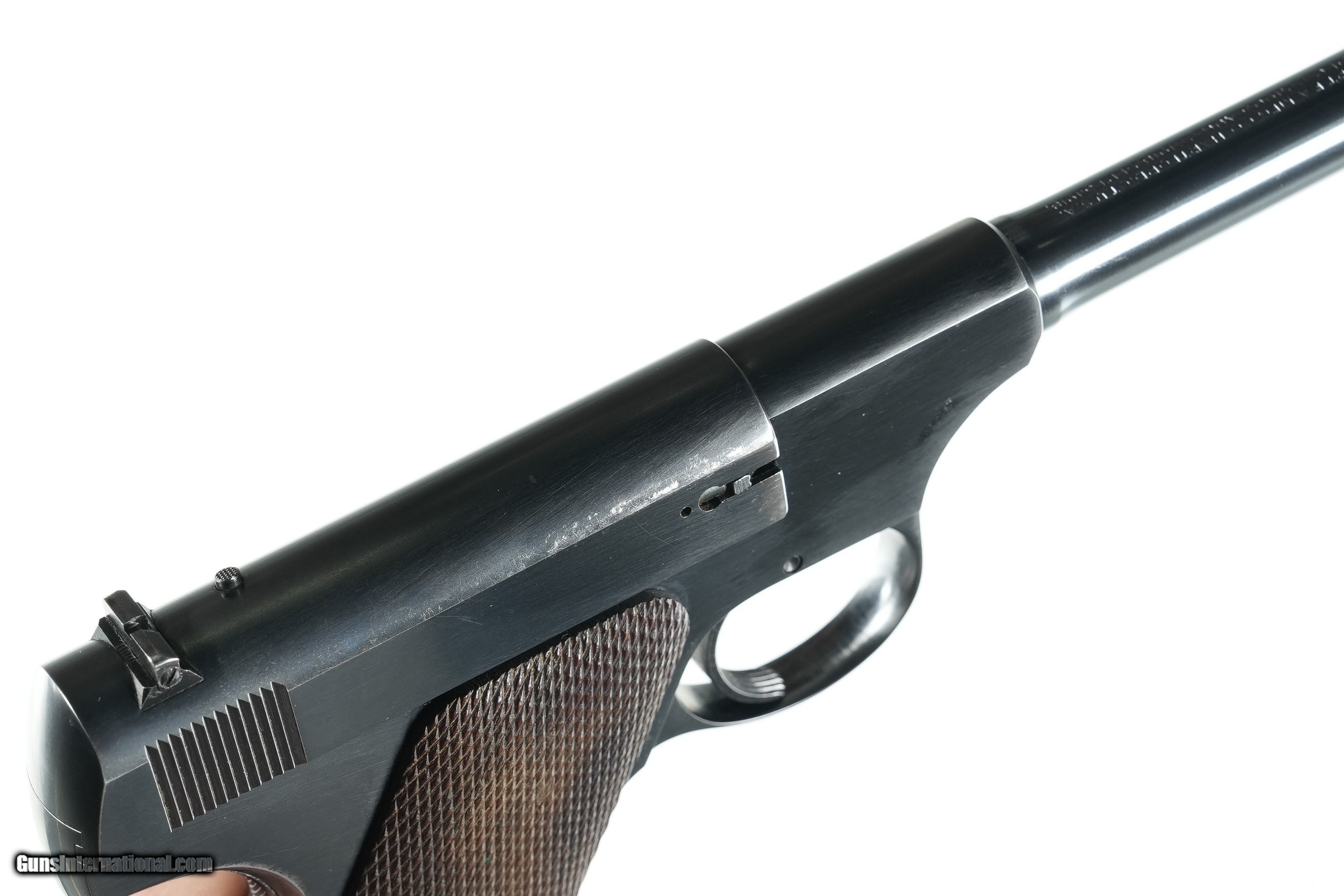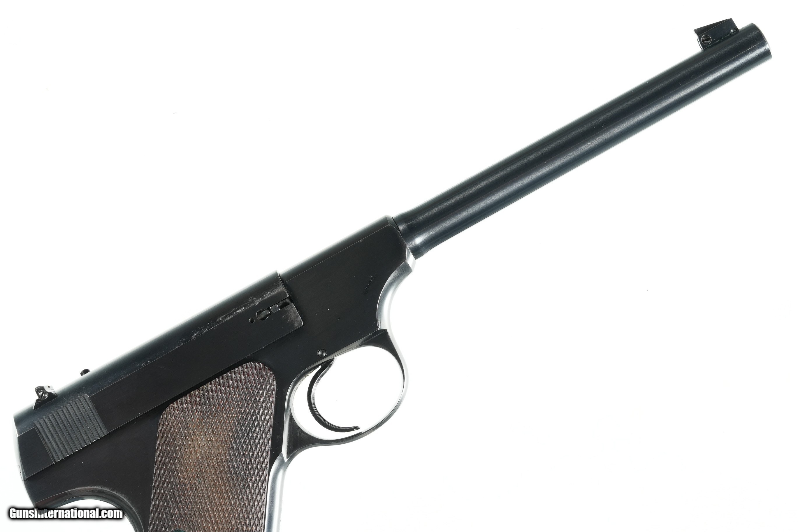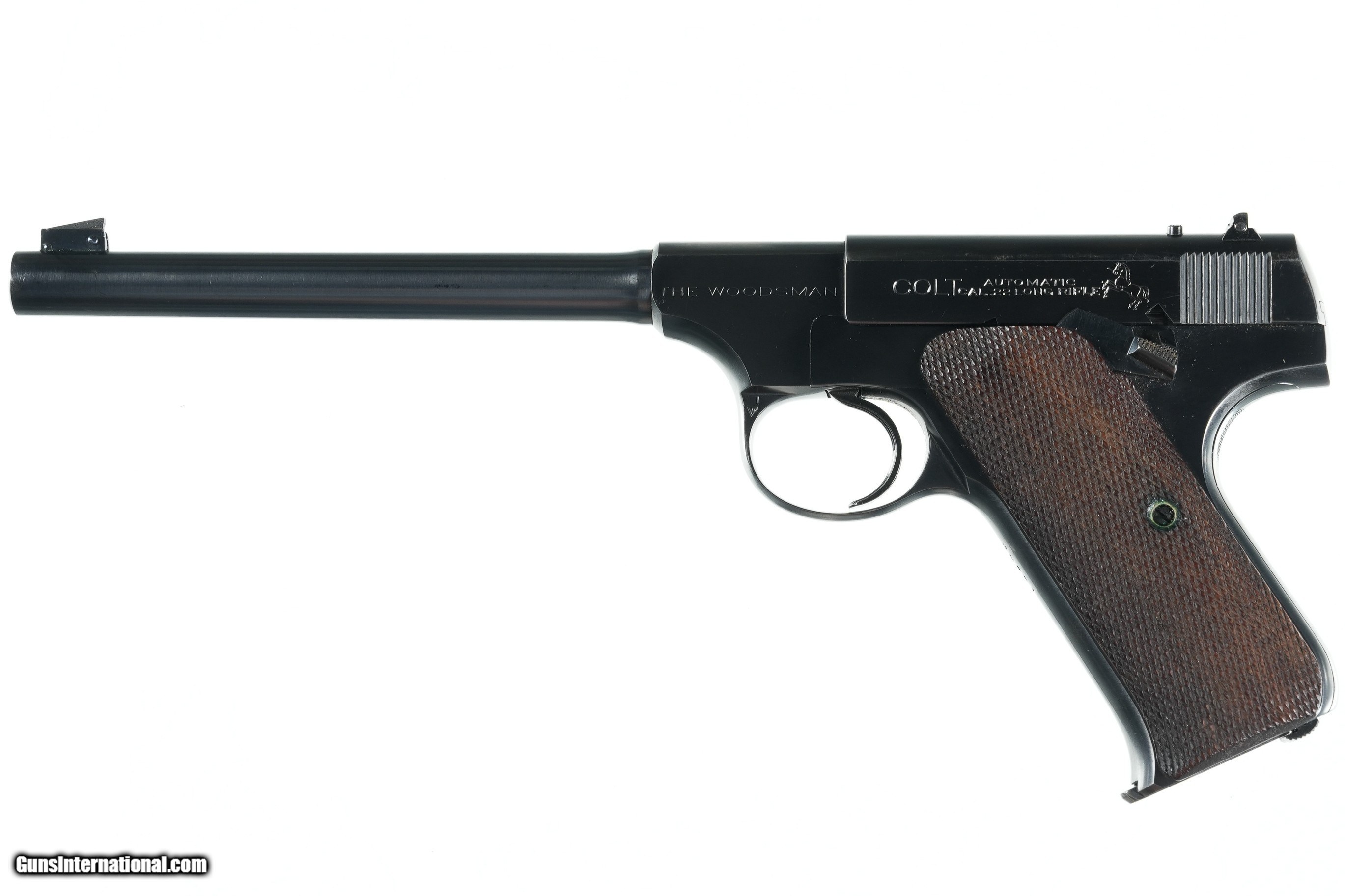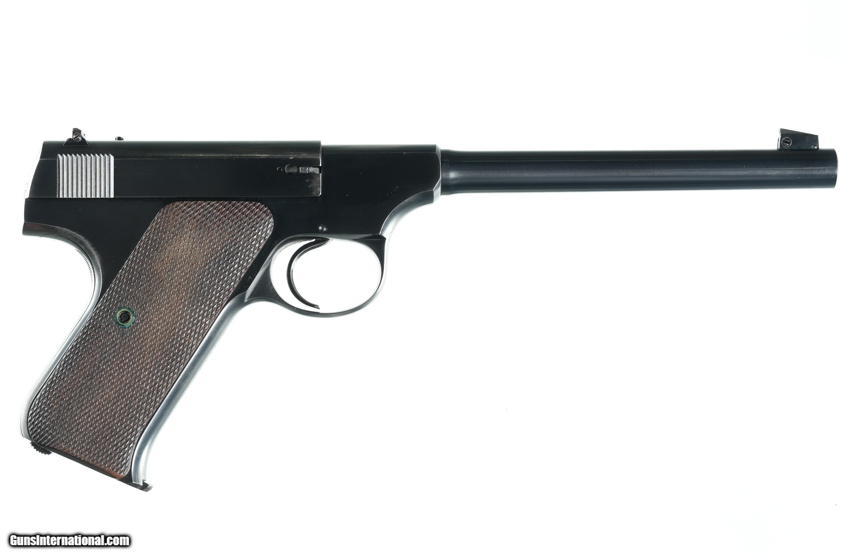 Description: Colt Woodsman 1st Model with Target adjustable Patridge sights and numbers matching box with label and factory instruction manual. Mfd, 1930. Checkered walnut grips, 2 tone 10 round magazine. Condition, Very fine with 97% finish, brilliant bore and excellent grips. Box is very good with some material loss on outer edges. Mechanically fine • Free Shipping, No Credit Card Fees. • Lay-a-way available for this firearm. • 1/3 Down, a 1/3 in 30 Days, 1/3 in 60 Days. SOLD Curio/Relic: Yes Manufacturer: Colt Model: Woodsman Serial Number: 72901 Barrel Length: 6 1/2 |