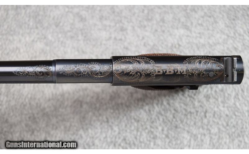 Description: This gun was manufactured and shipped to "Whitney Sporting Goods Company, Denver Colorado in 1937. At some point the gun has been nicely engraved with Acanthus leaf patterns and the initials "BBM". Gun shows some light pitting on both sides of slide and a very small scratch on right barrel. Grips are solid and excellent. Bore is excellent. No box. Complete with Cody letter! .22 Long Rifle SOLD Metal Condition: Very Good Wood Condition: Excellent Bore Condition: Excellent Barrels: 4 1/2 Triggers: Factory Butt Pad: Checkered Walnut Grips Weight: 28 oz. Sights: Serrated Blade Front - Fixed Square Notch Rear Item Location: Wheeling |