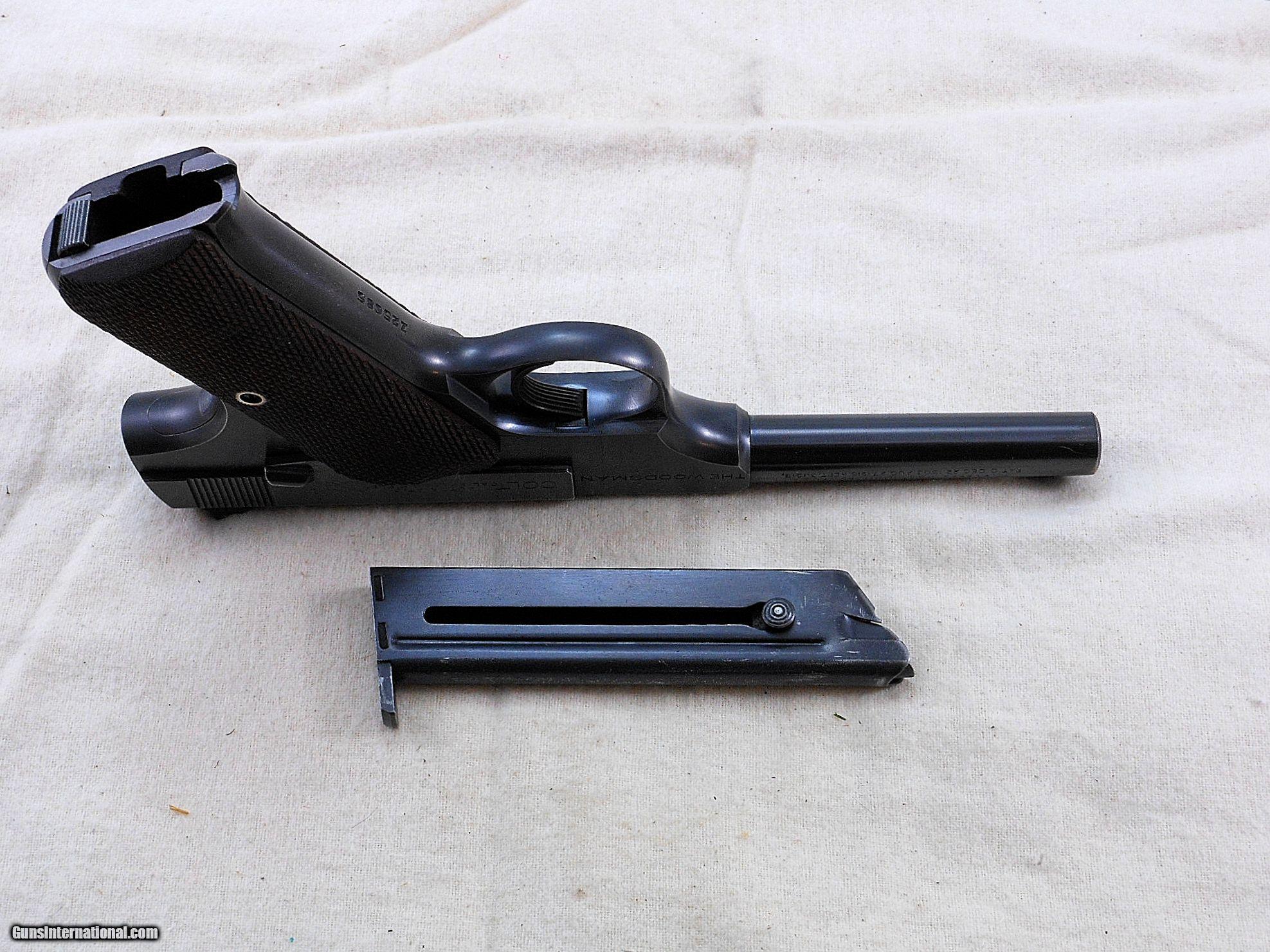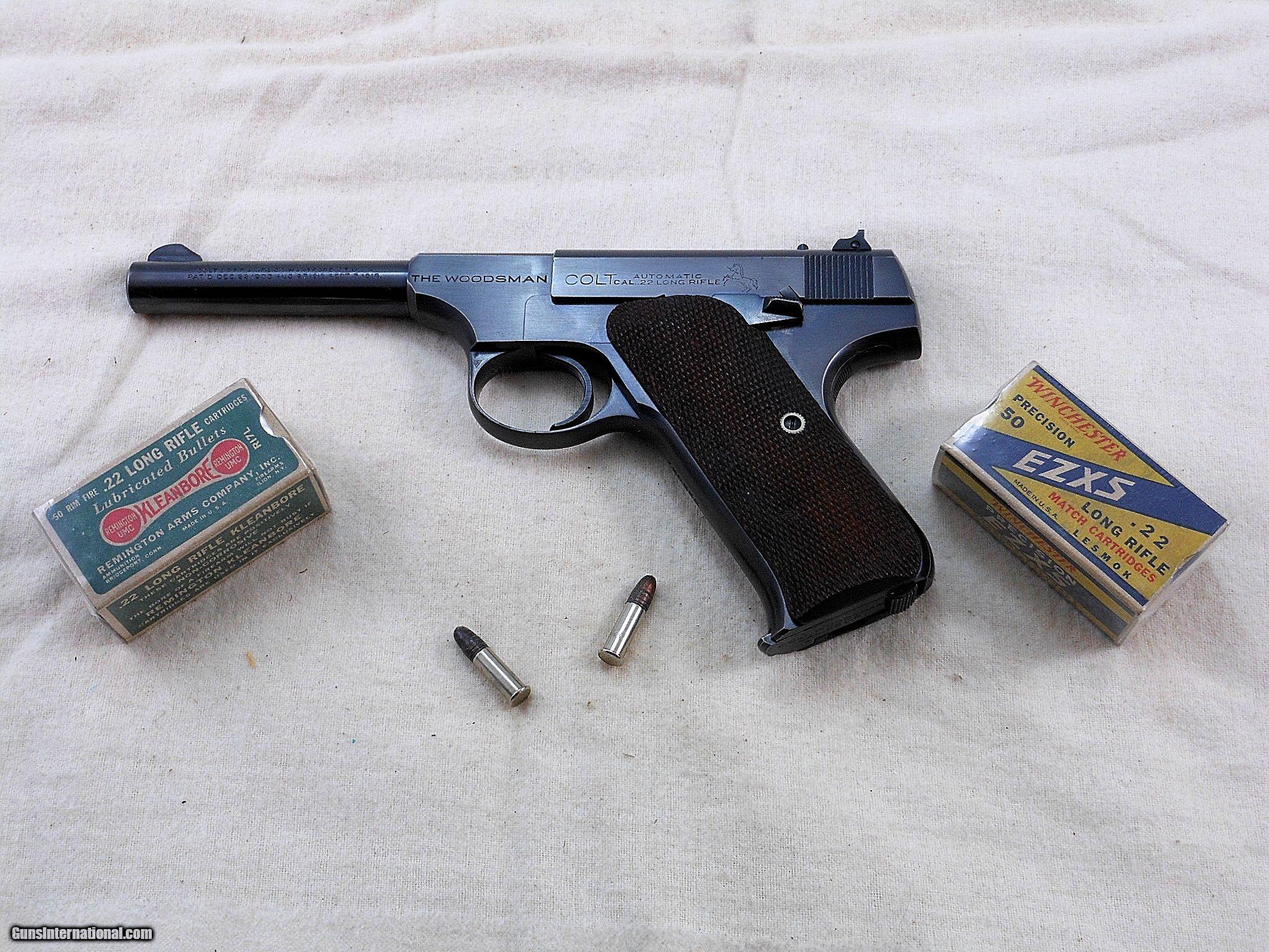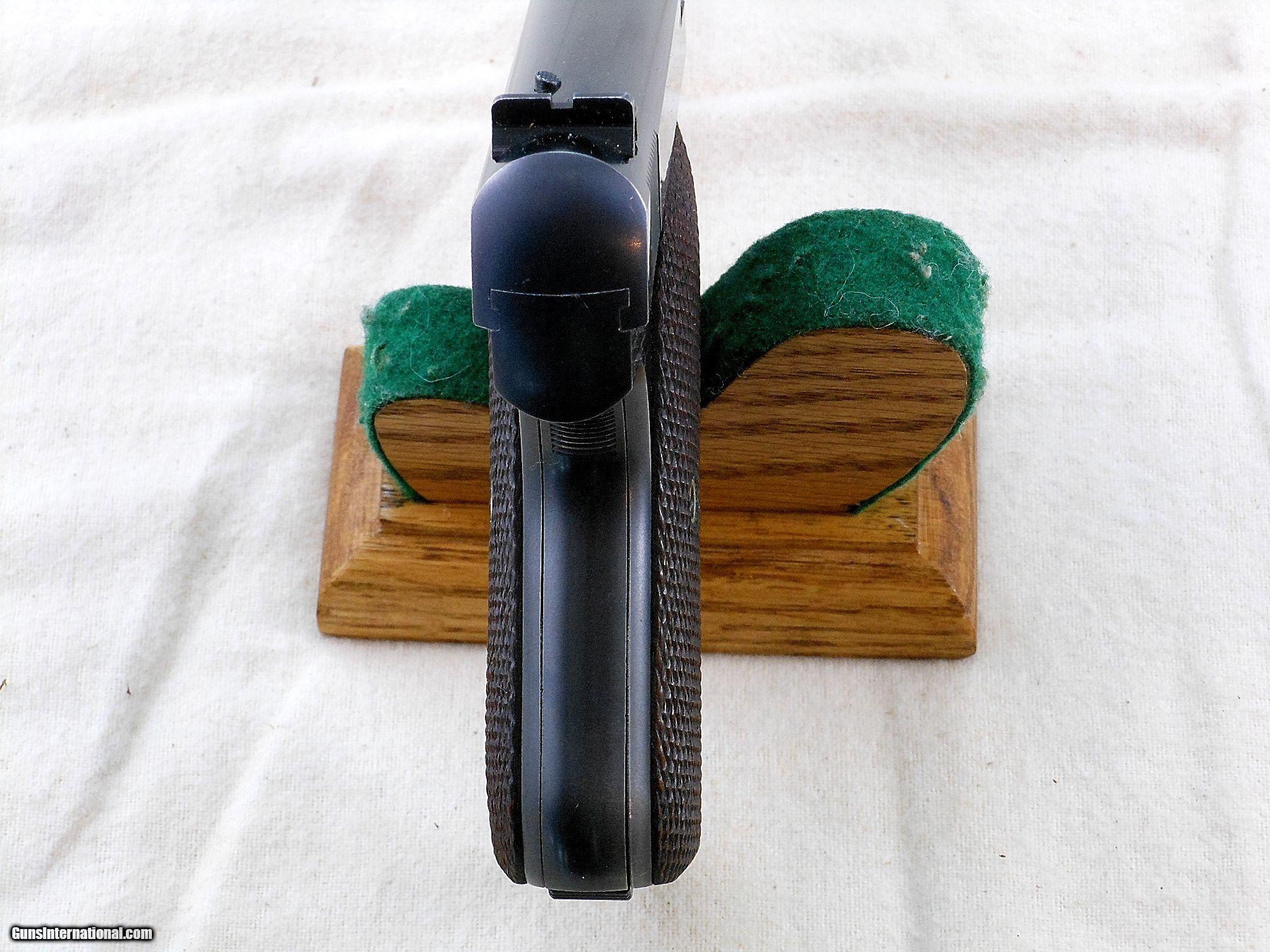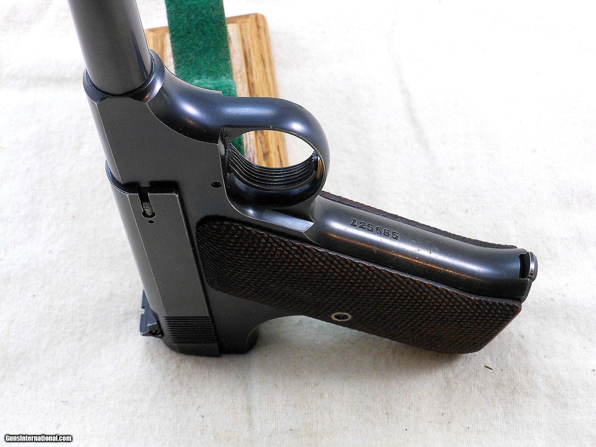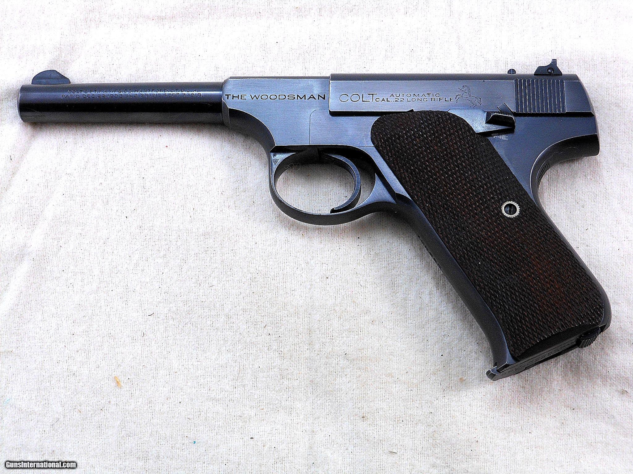 Description: Quality Consignments Wanted! This Colt was produced in 1938. The pistol's serial number is 125685. This is an all matched serial numbered pistol. The rear sight is adjustable for right or left positions. The front sight is non ajustable. The bore is bright and clean. The original grips are in very fine condition with sharp diamond points. The magazine is the correct all blued body with the floor plate marked [ Colt Woodsman Cal. 22 L.R. ]. This pistol has the grooved trigger. The recoil springs are capable of handling high velocity ammunition. The original blue finish would rate a 98% condition. The wood grips would also rate the same. This is a very nice well cared for Sport Model Colt. This collector grade pistol would do well in any collection. Search for hlvfineguns on google. Curio&Relic D.B. Consn. F. No. 291 -16 SOLD Curio/Relic: Yes Manufacturer: Colt Model: Woodsman Sport Model Serial Number: 125685 Caliber Info: 22 Long Rifle Condition: 98% Manufacture Date: 1938 |