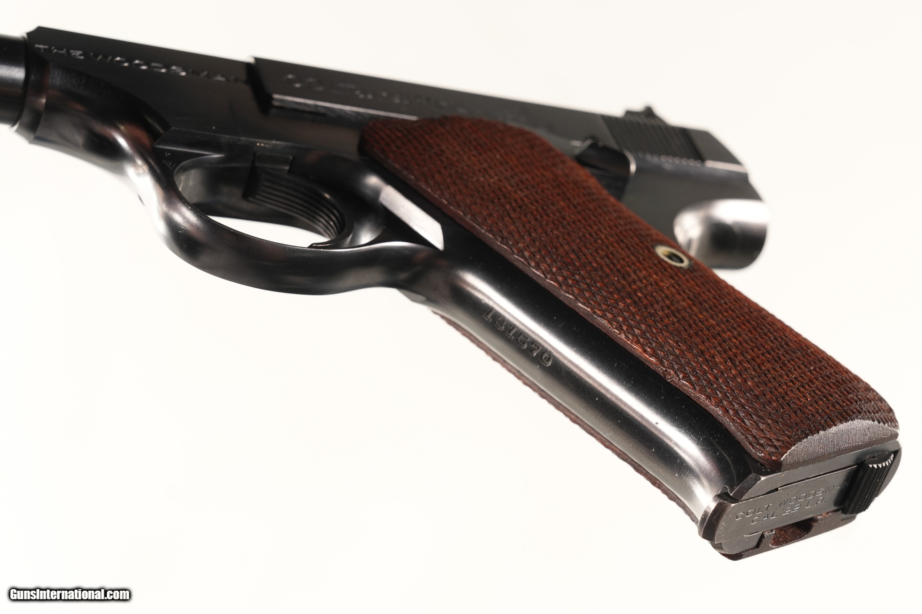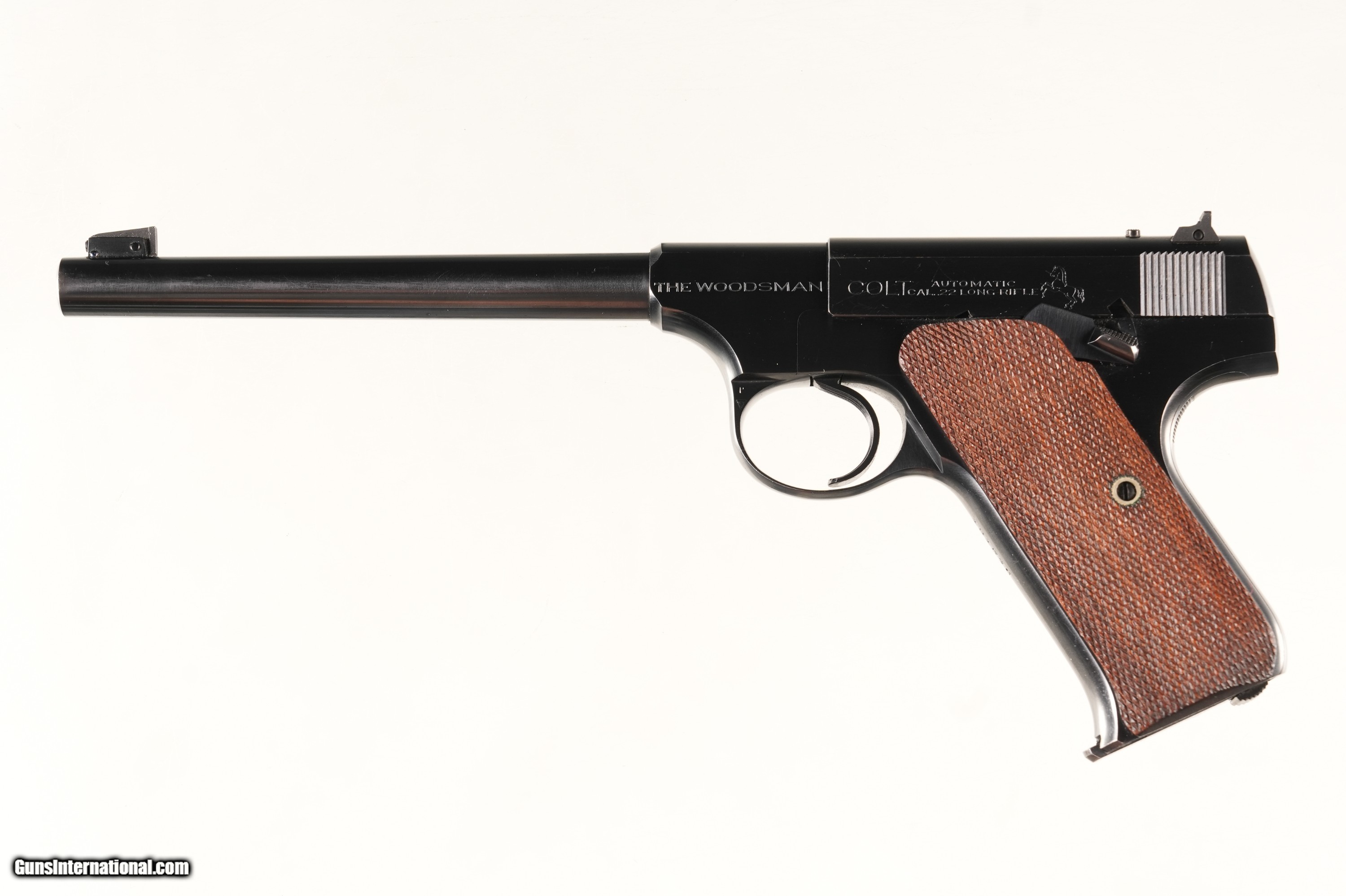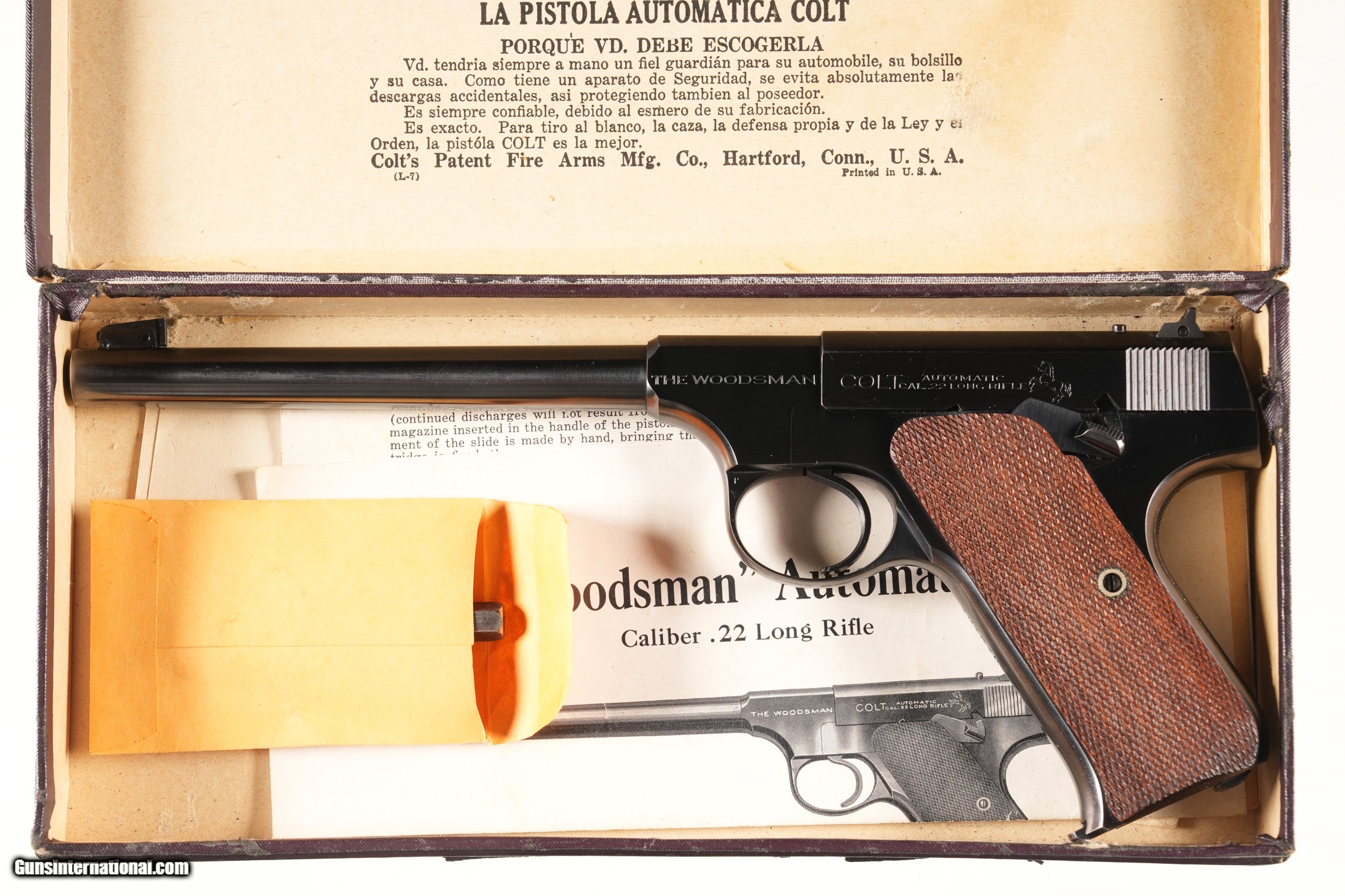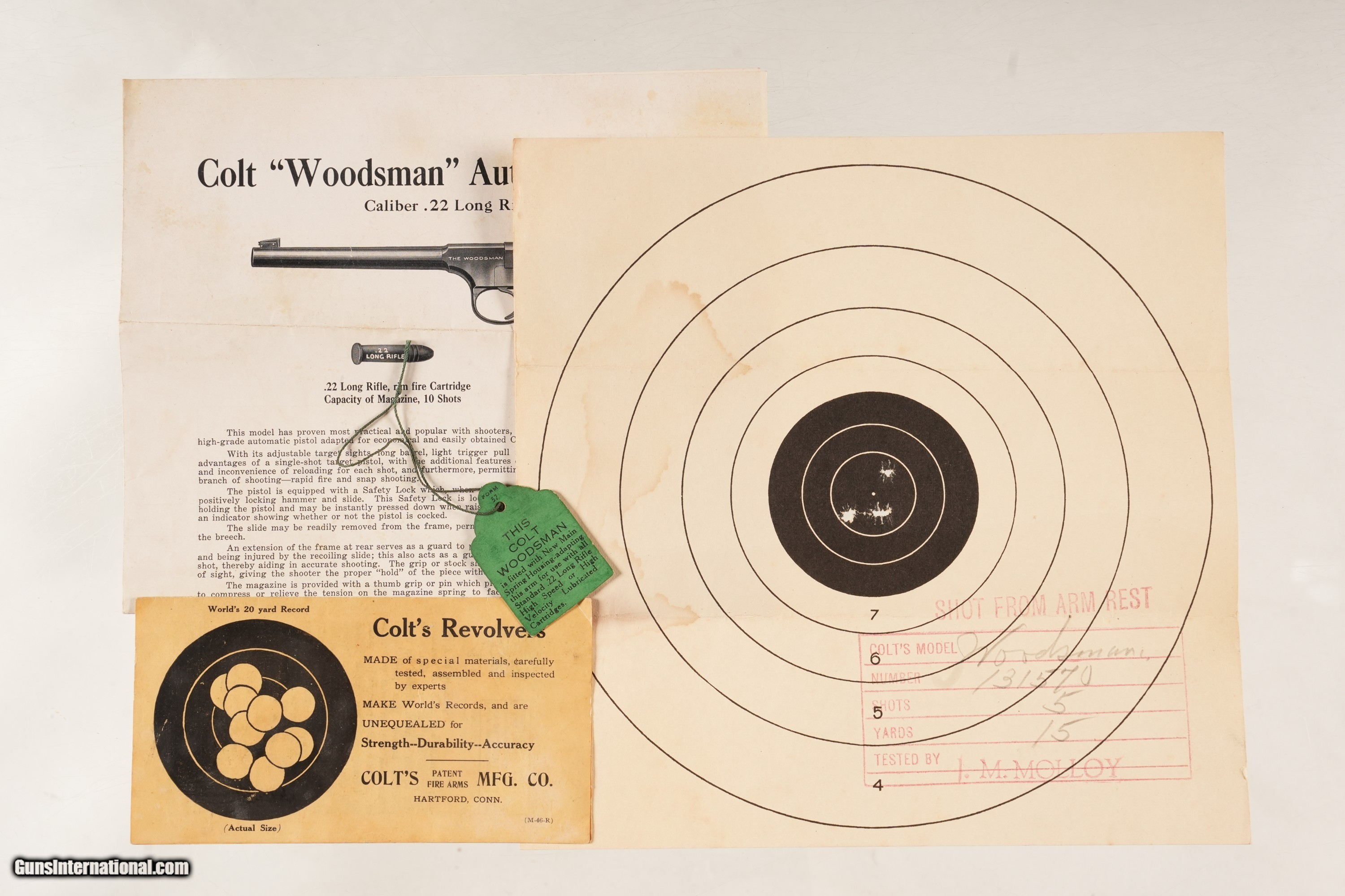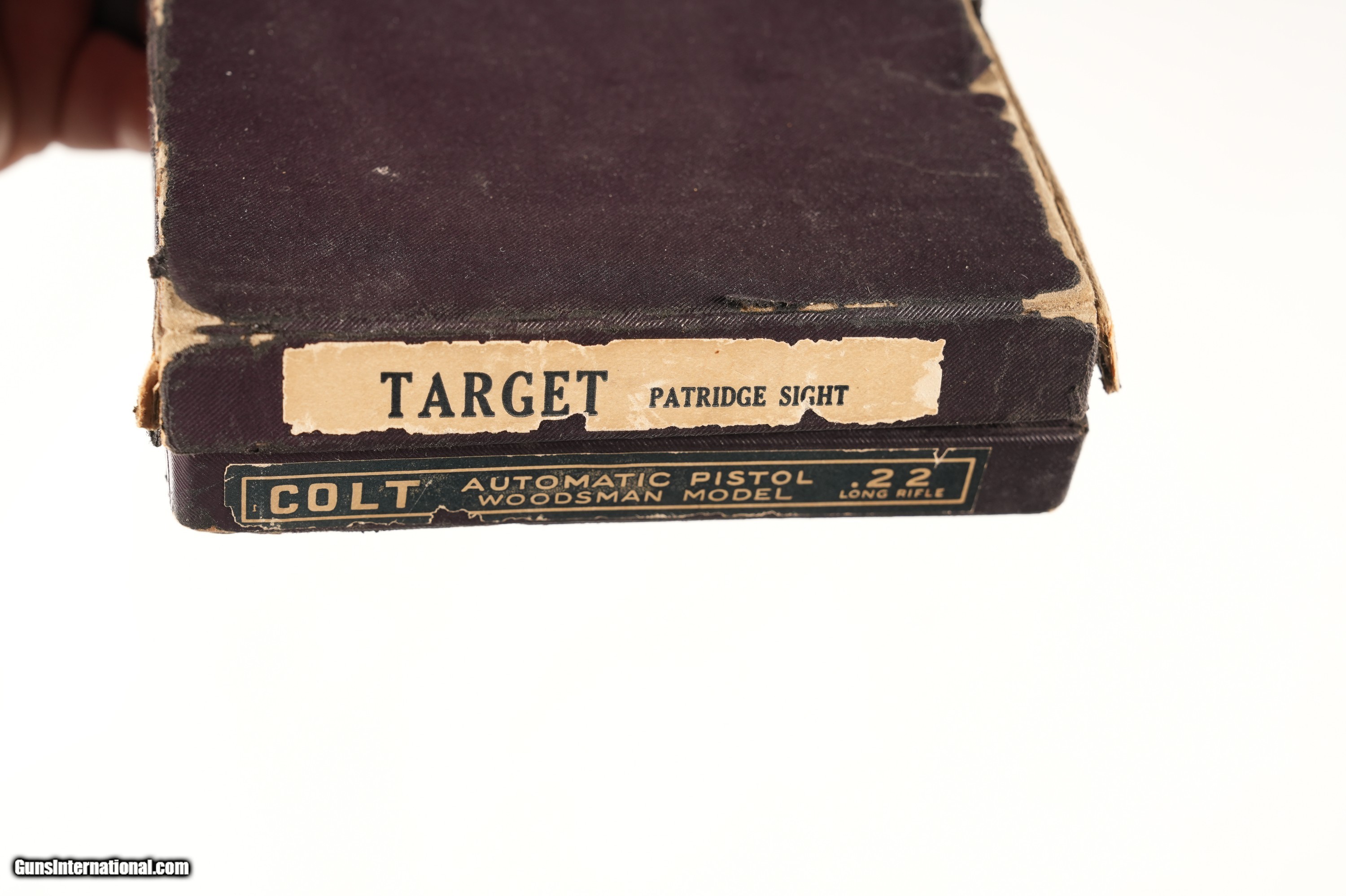 Description: Colt Woodsman 1st Model with 6 7/8" Bbl. Factory target adjustable sights with factory checkered walnut grips. Mfd, 1939. Housed in numbers matching factory box with full label, with hang tag indicating newer springs suitable for High Speed ammunition. Test target, instructions and sight adjustment tool. Condition, Excellent with 99% finish. Bright bore, Excellent grips. Superb 2 tone magazine. Box is very good with with loose corners and scuffing. Mechanically fine • Free Shipping, No Credit Card Fees. • Lay-a-way available for this firearm. • 1/3 Down, a 1/3 in 30 Days, 1/3 in 60 Days. SOLD Curio/Relic: Yes Manufacturer: Colt Model: Woodsman Serial Number: 131570 Barrel Length: 6 7/8 |