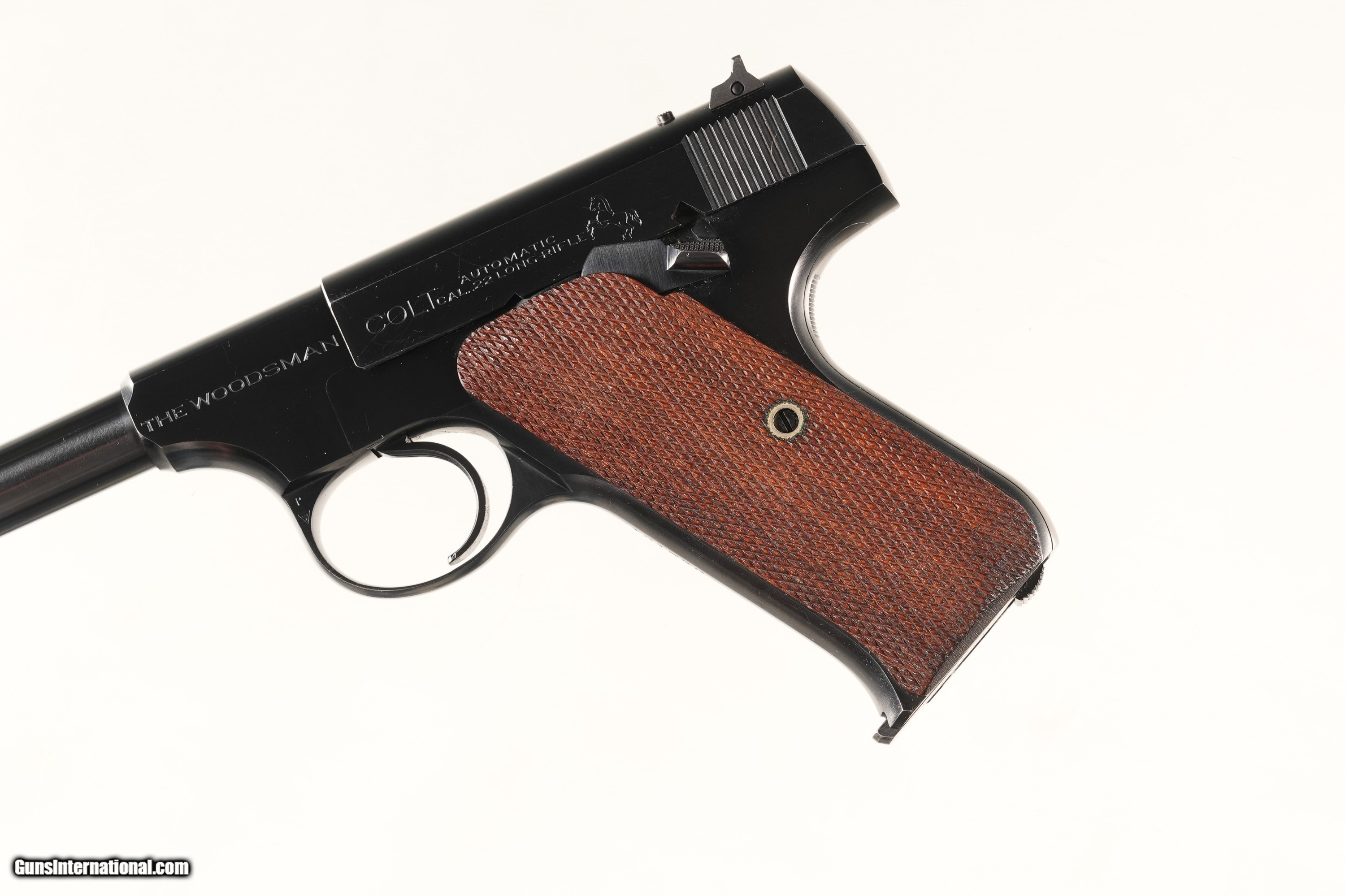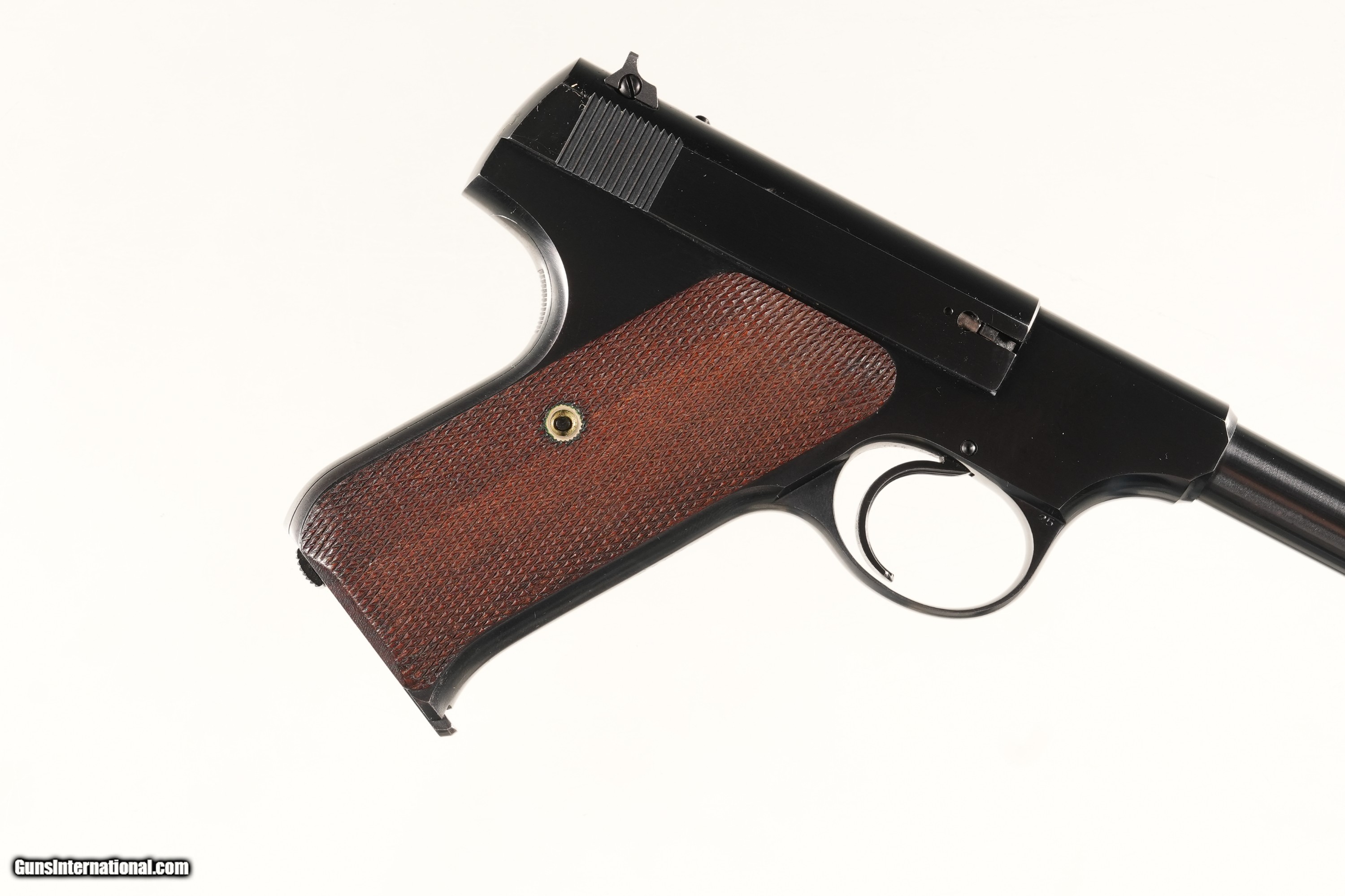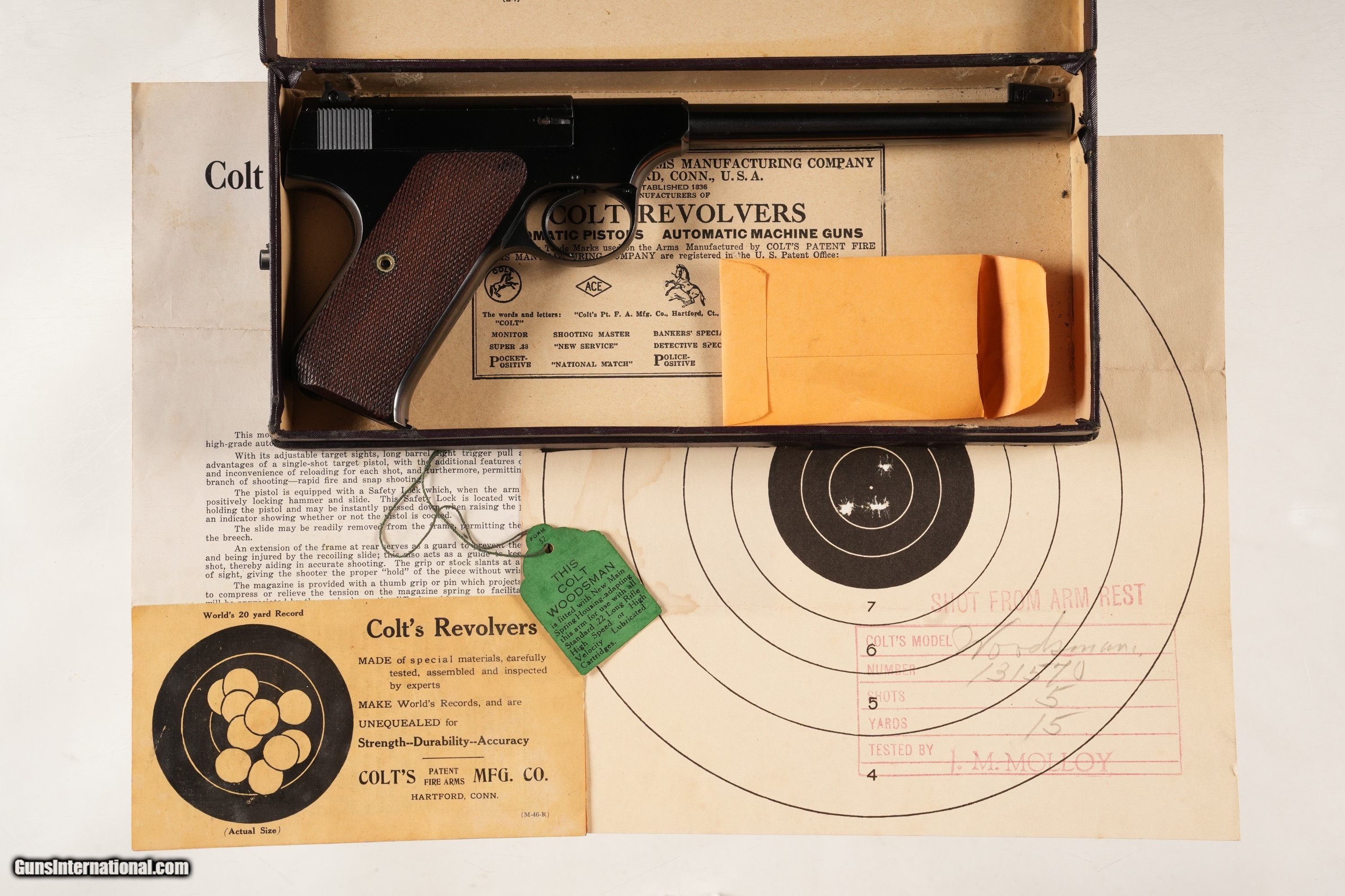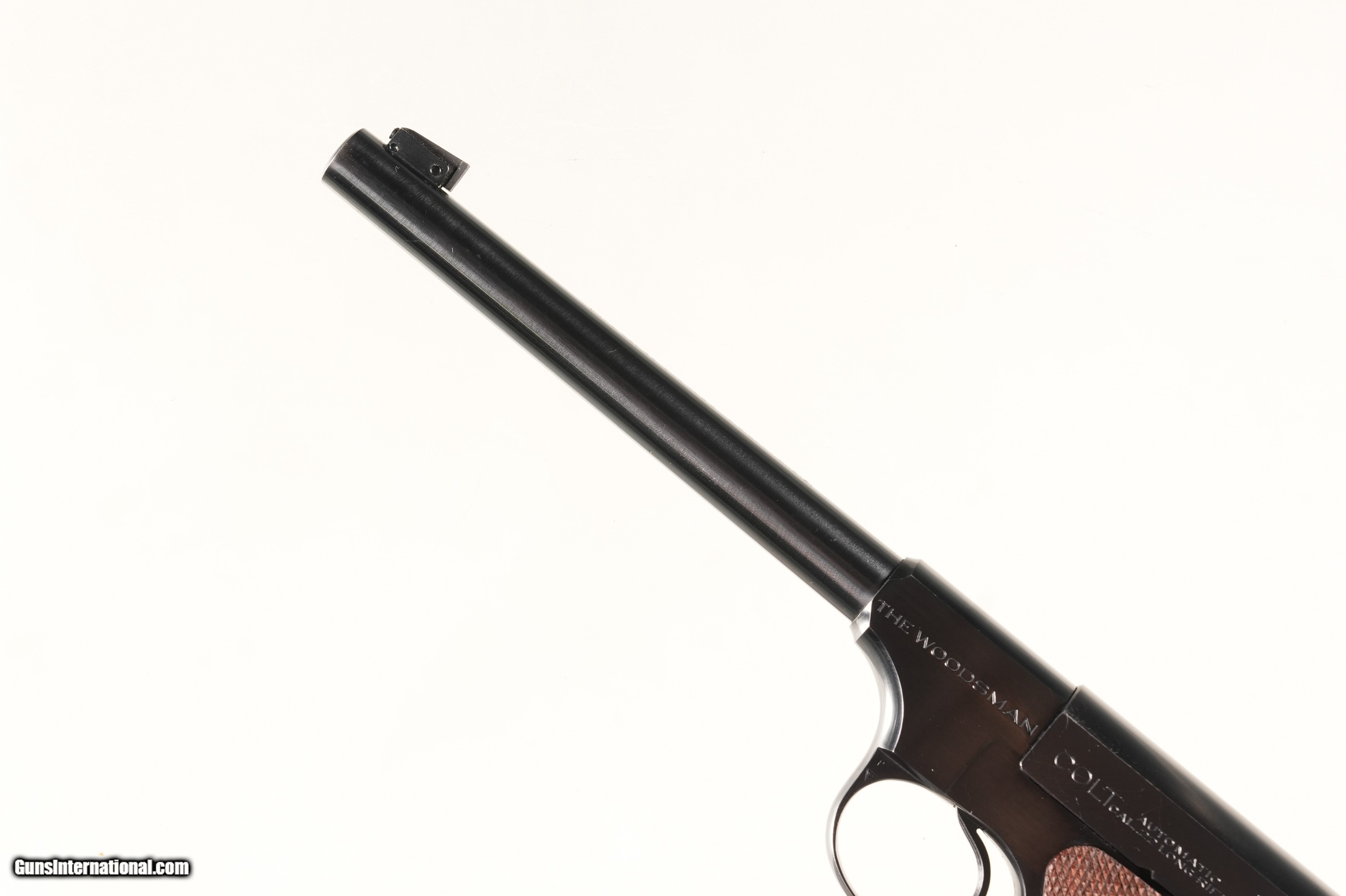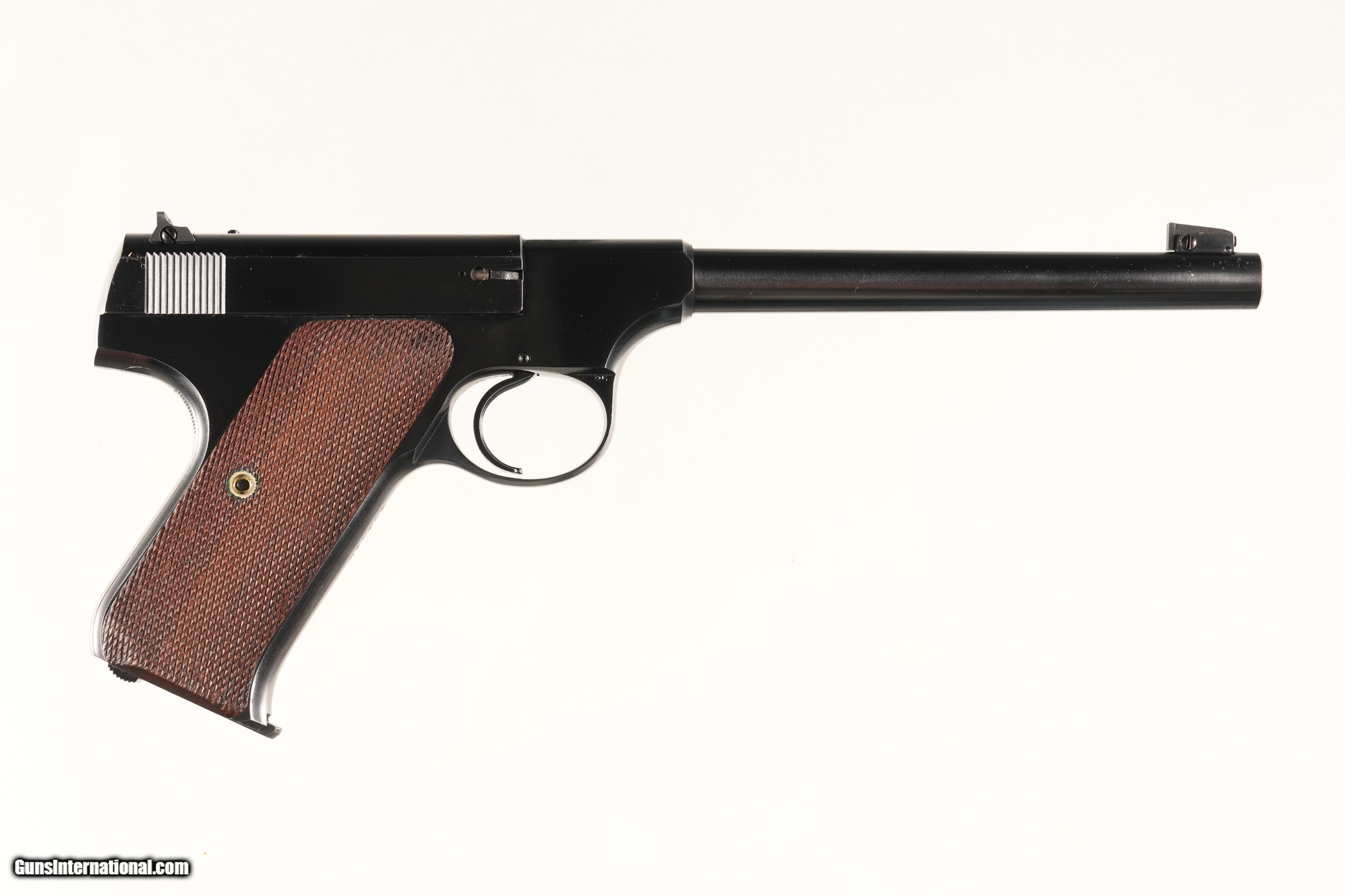 Description: Colt Woodsman 1st Model with 6 7/8" Bbl. Factory target adjustable sights with factory checkered walnut grips. Mfd, 1939. Housed in numbers matching factory box with full label, with hang tag indicating newer springs suitable for High Speed ammunition. Test target, instructions and sight adjustment tool. Condition, Excellent with 99% finish. Bright bore, Excellent grips. Superb 2 tone magazine. Box is very good with with loose corners and scuffing. Mechanically fine • Free Shipping, No Credit Card Fees. • Lay-a-way available for this firearm. • 1/3 Down, a 1/3 in 30 Days, 1/3 in 60 Days. SOLD Curio/Relic: Yes Manufacturer: Colt Model: Woodsman Serial Number: 131570 Barrel Length: 6 7/8 |