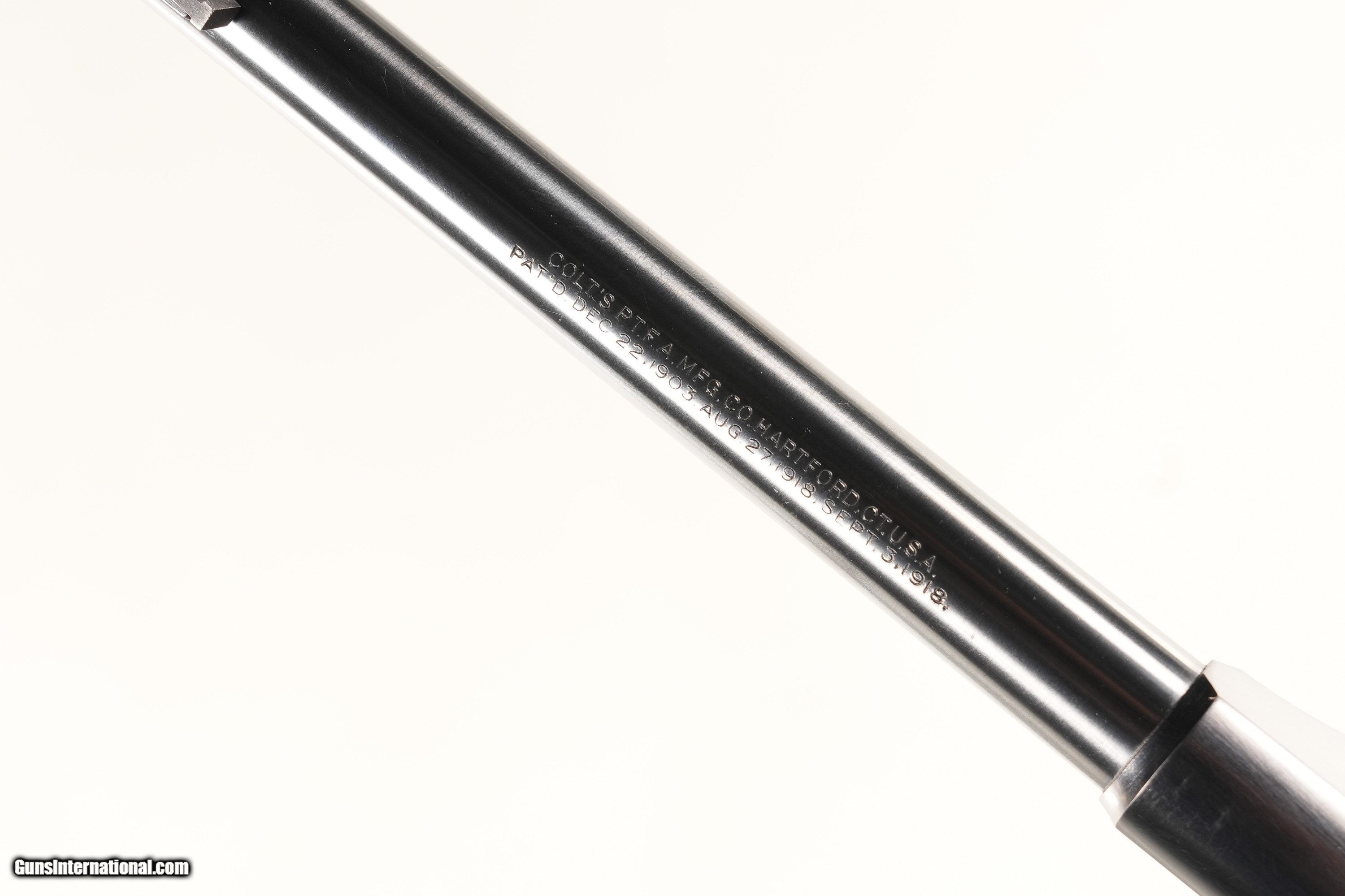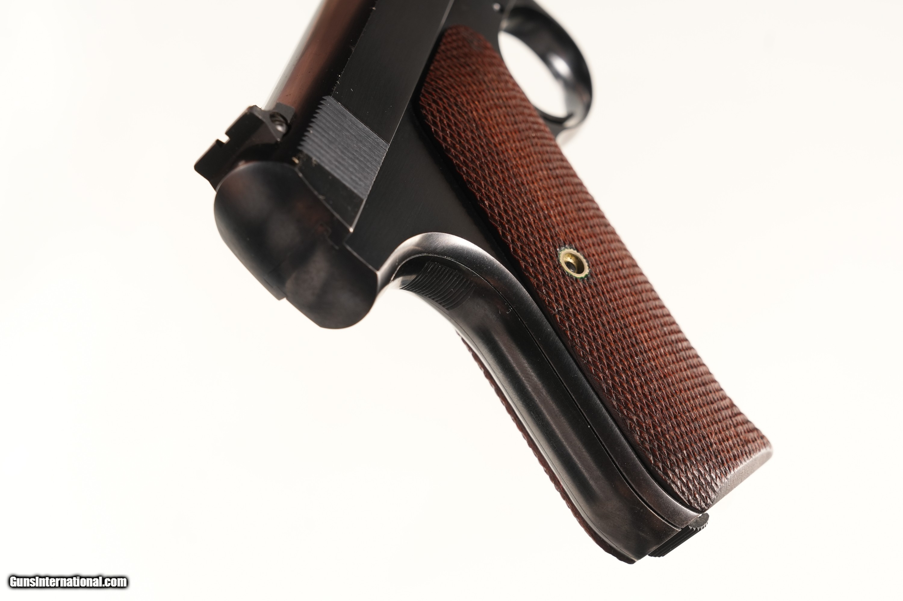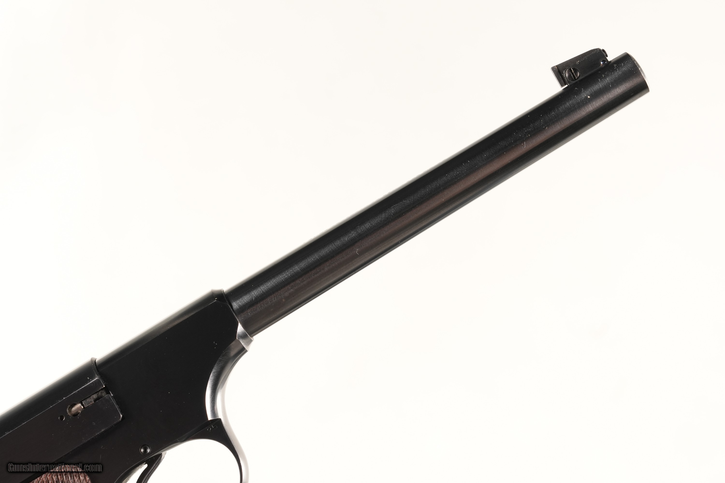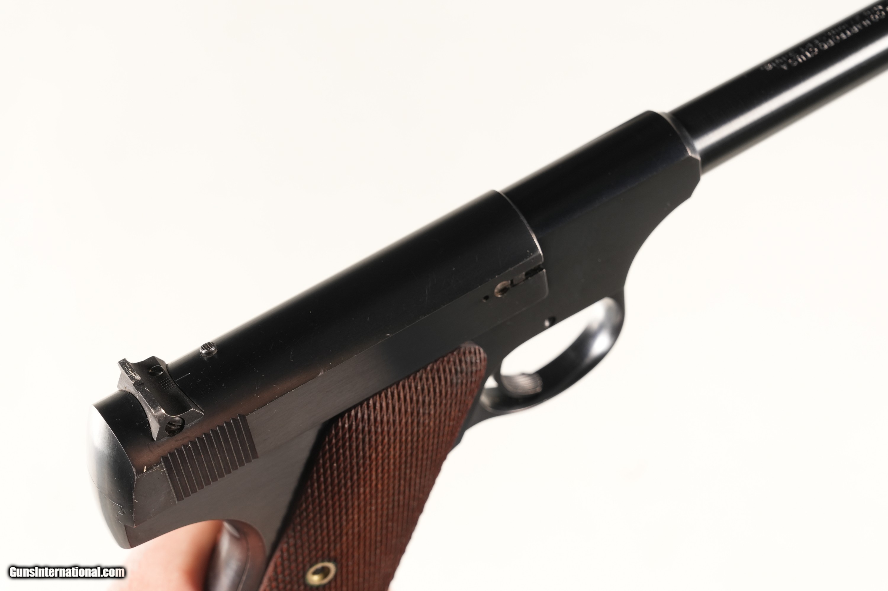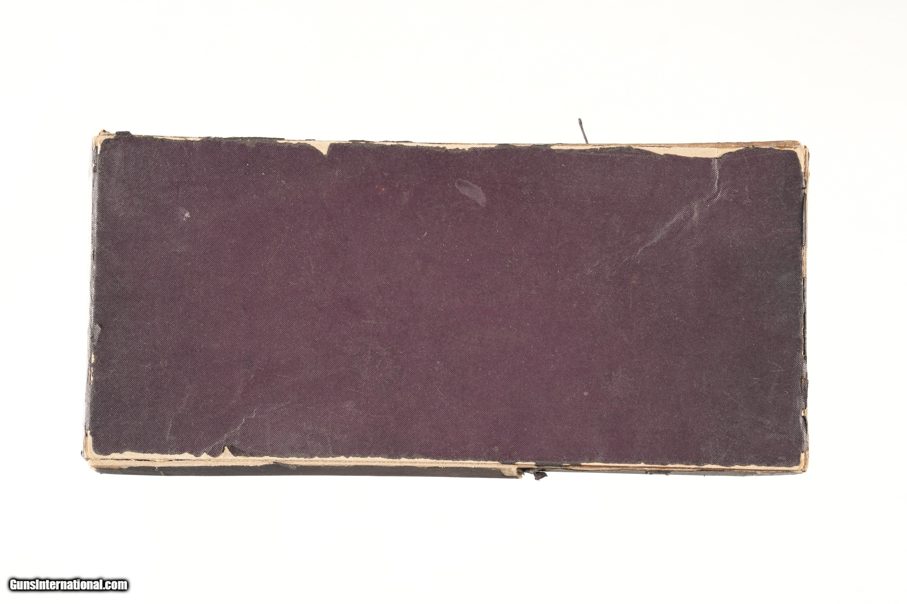 Description: Colt Woodsman 1st Model with 6 7/8" Bbl. Factory target adjustable sights with factory checkered walnut grips. Mfd, 1939. Housed in numbers matching factory box with full label, with hang tag indicating newer springs suitable for High Speed ammunition. Test target, instructions and sight adjustment tool. Condition, Excellent with 99% finish. Bright bore, Excellent grips. Superb 2 tone magazine. Box is very good with with loose corners and scuffing. Mechanically fine • Free Shipping, No Credit Card Fees. • Lay-a-way available for this firearm. • 1/3 Down, a 1/3 in 30 Days, 1/3 in 60 Days. SOLD Curio/Relic: Yes Manufacturer: Colt Model: Woodsman Serial Number: 131570 Barrel Length: 6 7/8 |