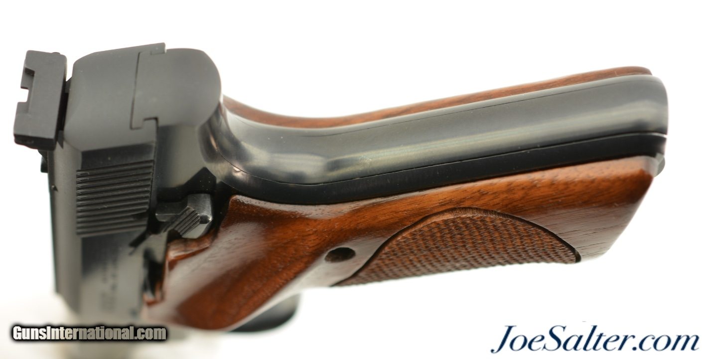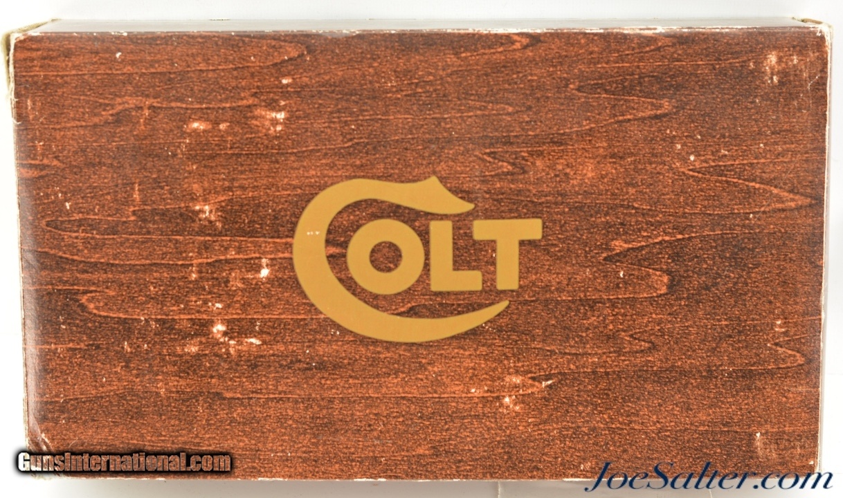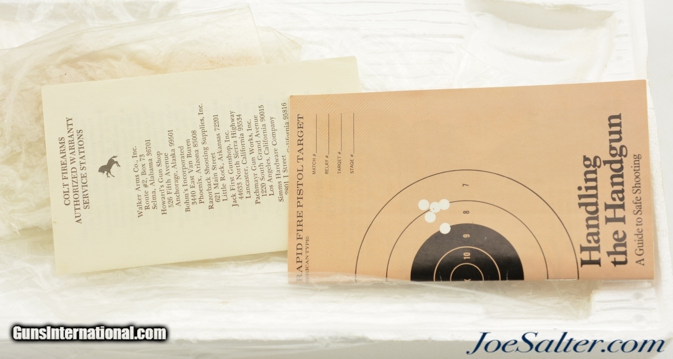 Description: Serial #311817S, .22 LR, 4 1/2" barrel with an excellent, bright bore. This is a 1969-made pistol that has retained virtually all of the original blue finish with only some hints of silvering on a handful of edges. The checkered thumb-rest grips are likewise in excellent, barely used condition, and a single original magazine is included. The pistol is housed in the original numbered Colt woodgrain box, and a photocopy of the Woodsman owner’s manual is also included. This is a fabulous little 3rd Series Woodsman, in almost unused condition, and would make a fine addition to any collection. FFL or C&R SOLD Curio/Relic: Yes |
