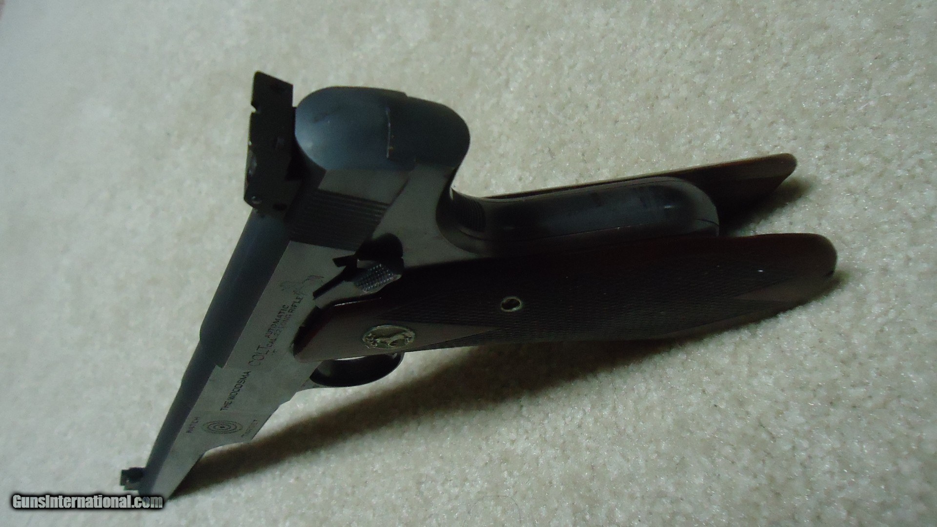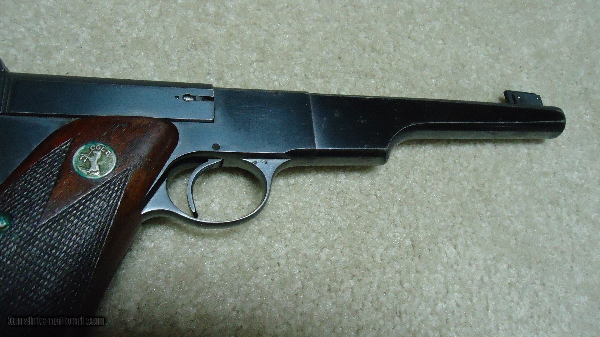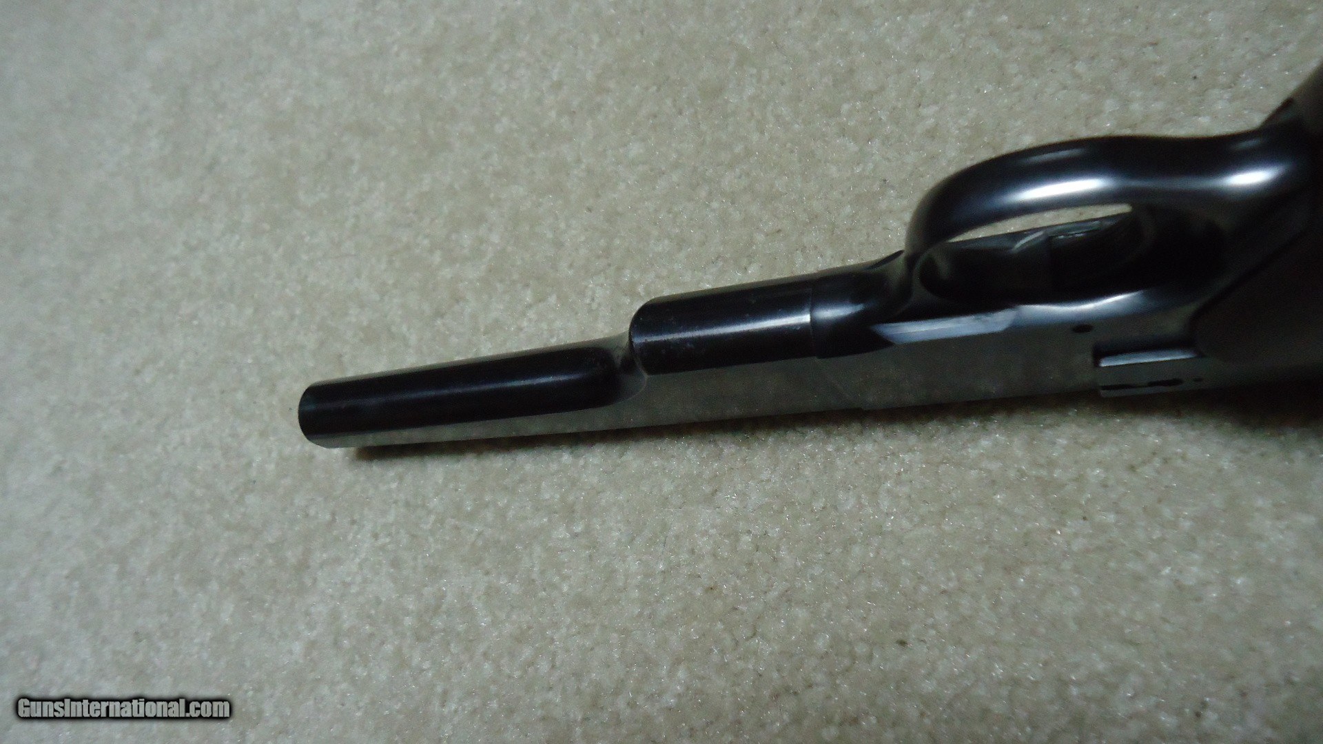 Description: FIRST MODEL "BULLSEYE" MATCH TARGET WOODSMAN .22 AUTO PISTOL. Brought out to much fanfare extolling its hand fitting and polishing in 1938, this distinct and unique pistol was discontinued during World War II and never resurrected in the same mode after the war's end. Only 15,100 were manufactured, including some fitted with plastic stocks and marked U.S. Property for training purposes during the war. Commercial models were made with over-long "elephant ear" grips which often were replaced or broken. This example is all original and in fine condition. It is serial number MT 9XXX indicating a manufacture date of 1940. It retains about all of the original blue with only slight edge and other wear and some minor dulling of the high polish blue on the back strap only. Grips show light handling only and the action and bore are excellent. A fine example that has seen very light use. SOLD Curio/Relic: Yes Handgun Caliber: .22 Long Rifle Manufacturer: COLT Model: BULLSEYE MATCH TARGET Serial Number: MT 9XXX Condition: EXCELLENT Bore Condition: EXCELLENT |