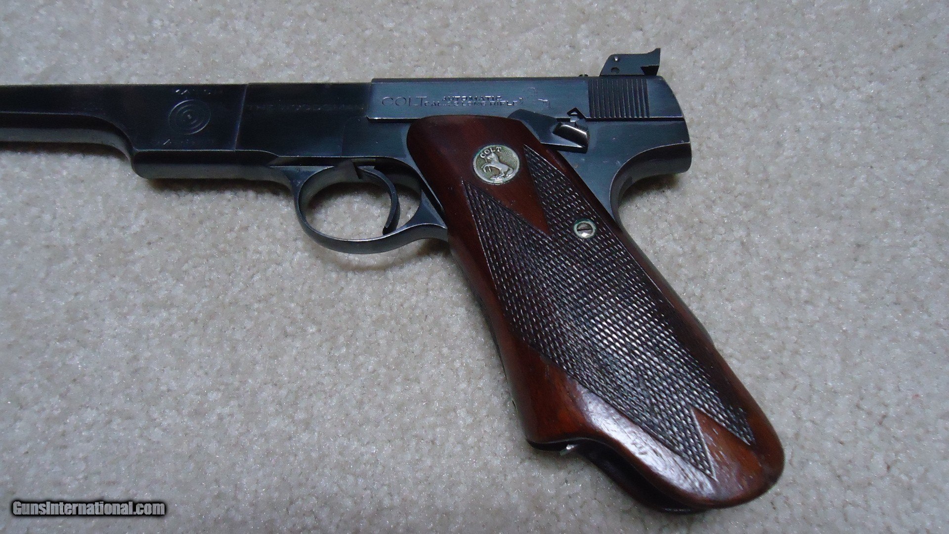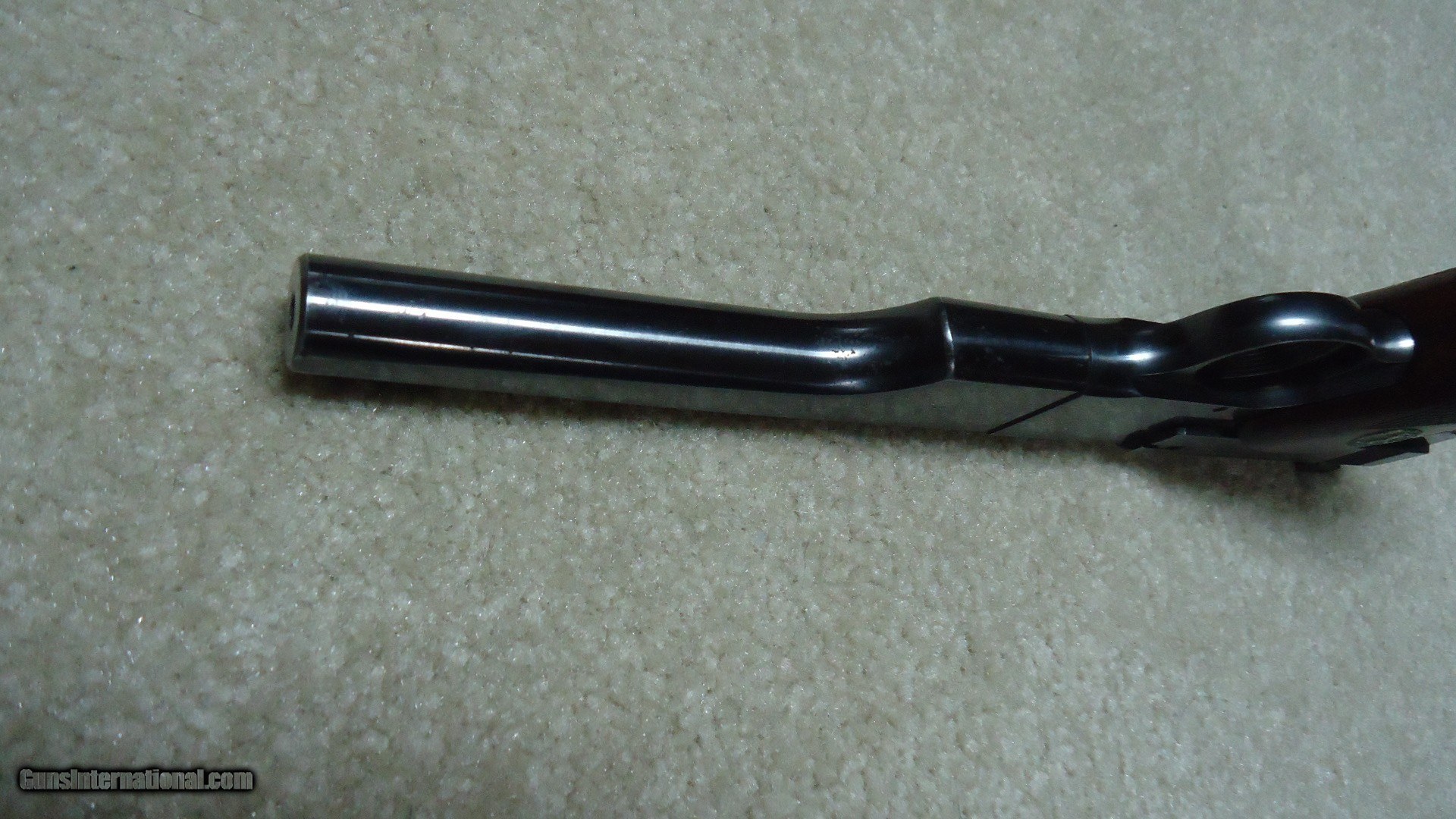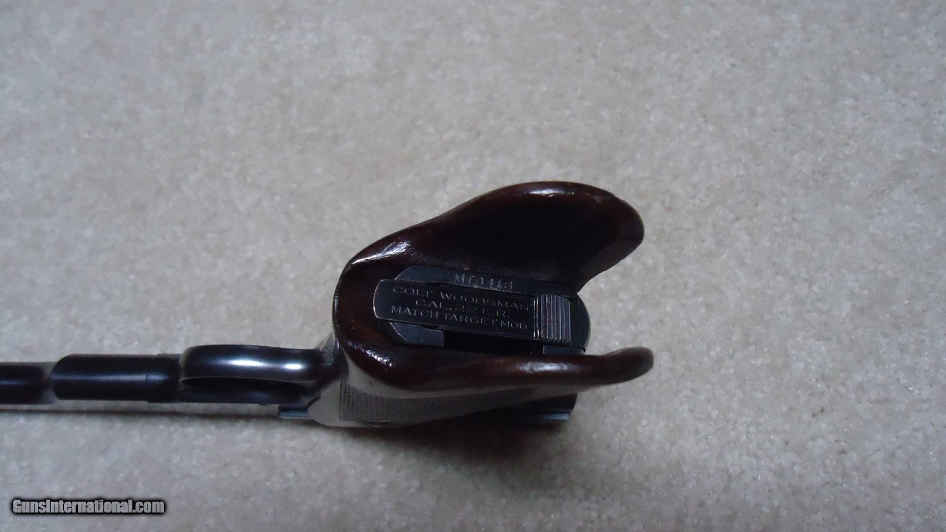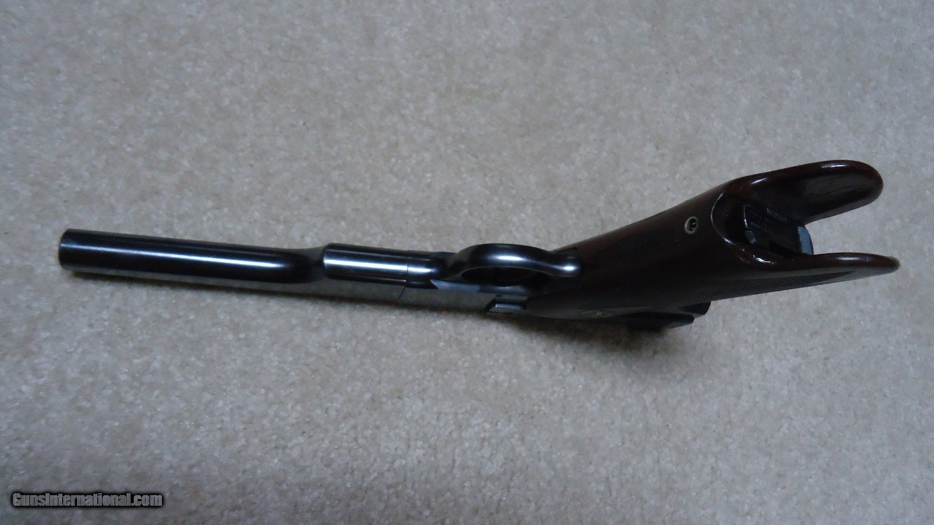 Description: FIRST MODEL "BULLSEYE" MATCH TARGET WOODSMAN .22 AUTO PISTOL. Brought out to much fanfare extolling its hand fitting and polishing in 1938, this distinct and unique pistol was discontinued during World War II and never resurrected in the same mode after the war's end. Only 15,100 were manufactured, including some fitted with plastic stocks and marked U.S. Property for training purposes during the war. Commercial models were made with over-long "elephant ear" grips which often were replaced or broken. This example is all original and in fine condition. It is serial number MT 9XXX indicating a manufacture date of 1940. It retains about all of the original blue with only slight edge and other wear and some minor dulling of the high polish blue on the back strap only. Grips show light handling only and the action and bore are excellent. A fine example that has seen very light use. SOLD Curio/Relic: Yes Handgun Caliber: .22 Long Rifle Manufacturer: COLT Model: BULLSEYE MATCH TARGET Serial Number: MT 9XXX Condition: EXCELLENT Bore Condition: EXCELLENT |