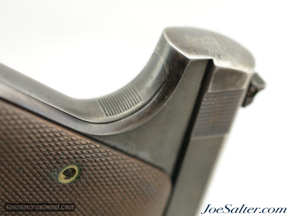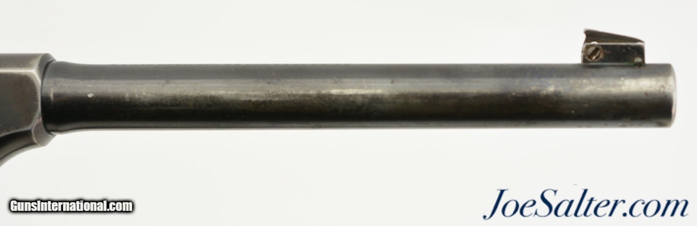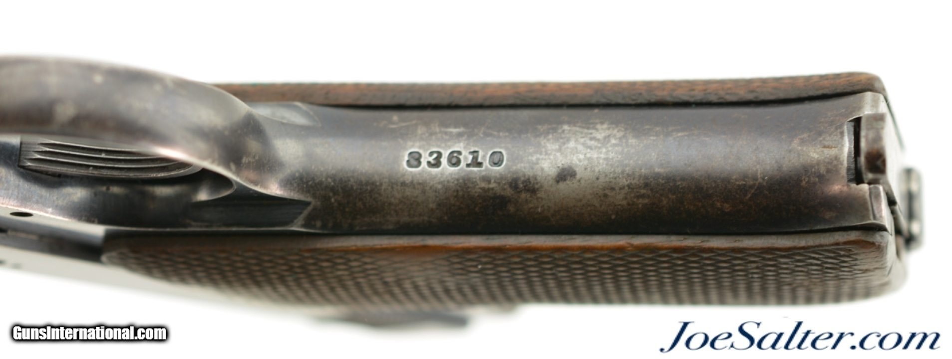 Description: Serial #83610, .22 LR, 6 5/8" barrel with an excellent, bright bore. This is a 1931-made pistol with high speed mainspring housing, and retains 75-80% of the original blue finish, with gray fading along the sides of the barrel, silvering along the edges of the frame and slide, and mild surface freckling present throughout the balance of the metal. The checkered walnut grips are in very good shape, with light-moderate wear and flattening to the points, especially at the butt on both sides. The pistol is mechanically excellent, and comes with a single two-tone magazine. The pistol is housed in a brown leather flap holster that has a previous owner’s name stamped into the cover; "L.C. RAMSEY." The leather is worn, but still supple and intact, and both a second belt loop and thong tie-down were added to the holster at some point during the service life. This is a nice 1st Series Woodsman, in very good condition, and would make a nice addition to a collection. FFL or C&R SOLD Curio/Relic: Yes |