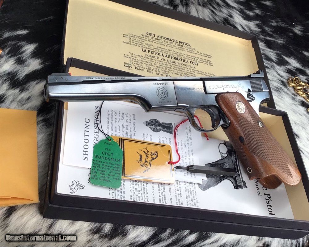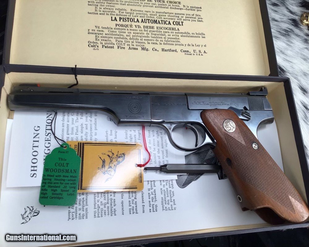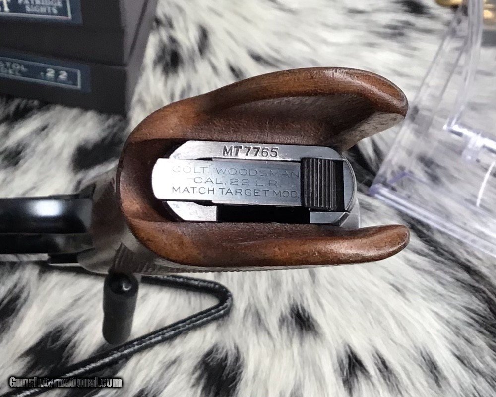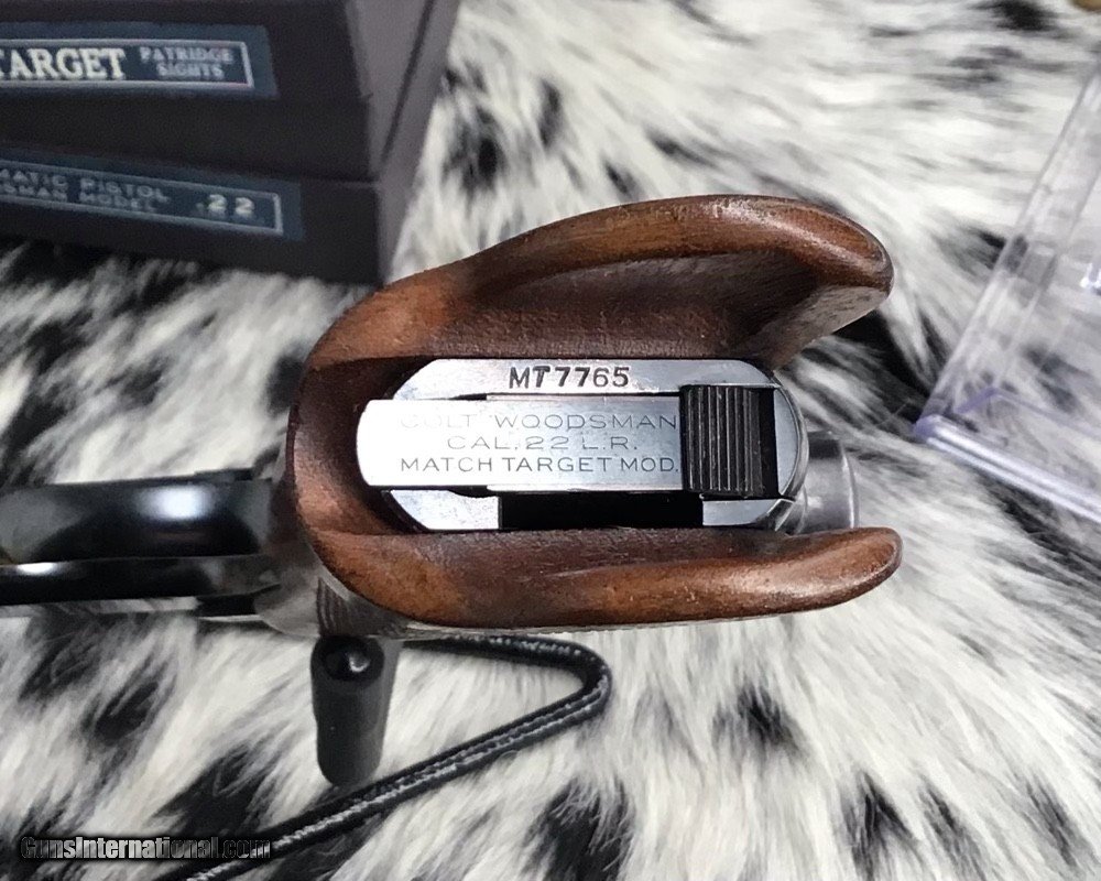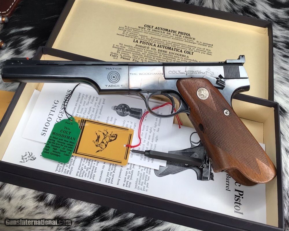 Description: The Woodsman Match Target (Bulls Eye) 1st Series – 22 Long Rifle Cal. Semi-Auto Pistol – w/6.63” Barrel w/Rare Colt King Super Target Vent-Rib w/Target Front & Adj. Target Rear Sights – Blued Finish – w/Factory Checkered Silver Colt Medallion “Elephant Ear’ Target Grips – w/Factory Correct Colt Match Target Model Marked Magazine – Serial #MT7765 – Mfg. in 1940 , Comes in numbered to gun Colt box with owners papers, hang tags, sight adjustment tool, reproduction. 90 % condition Original blued finish. Very Rare factory Colt Kings Super Target Vent-Rib w/target Front and rear adjustable sights. Add 3% if paying with credit card. Free shipping for US Veterans and retired LEO. God Bless America from a proud American, and a Viet Nam Vet , thankful for our freedoms.. paid for by the Blood ,Sweat and Tears of our brave men and women in uniform. Ten Below Firearms is a Veteran owned and operated business. We specialize in out of production models of high quality firearms. We love to ship! We ship to all states where legal, just give us a call! Handguns normally ship for $35 and Long guns for $45 up to $75 for extra length long guns. That's 2-3 day USPS Priority shipping, Delivery conformation and with tracking number. Optional Postal insurance is additional $1.70 per $100 and highly recommended. We are OPEN BY APPOINTMENT ONLY FOR IN PERSON VISITS, We trade, sometimes. Layaway:If needed we offer a 60 day layaway program. Terms, 1/3 of purchase price down, 1/3 due in 30 days, and the final third to include card fees and shipping due at 60 days. Funds are non transferable and non refundable .Layaway is not available on negotiated prices. SOLD Curio/Relic: Yes Handgun Caliber: .22 Long Rifle Manufacturer: Colt Model: Woodsman Match Target Bullseye Serial Number: MT7765 Barrel Length: 6.63 inch Condition: Very good/ fine Metal Condition: Very good Wood Condition: Very good Bore Condition: Very good Barrel Type: Round Action: Semi auto Rib: Vented rib Finish: Blued Sights: Colt Kings Target adjustable Manufacture Date: 1940 Case: Box Item Location: Mn |