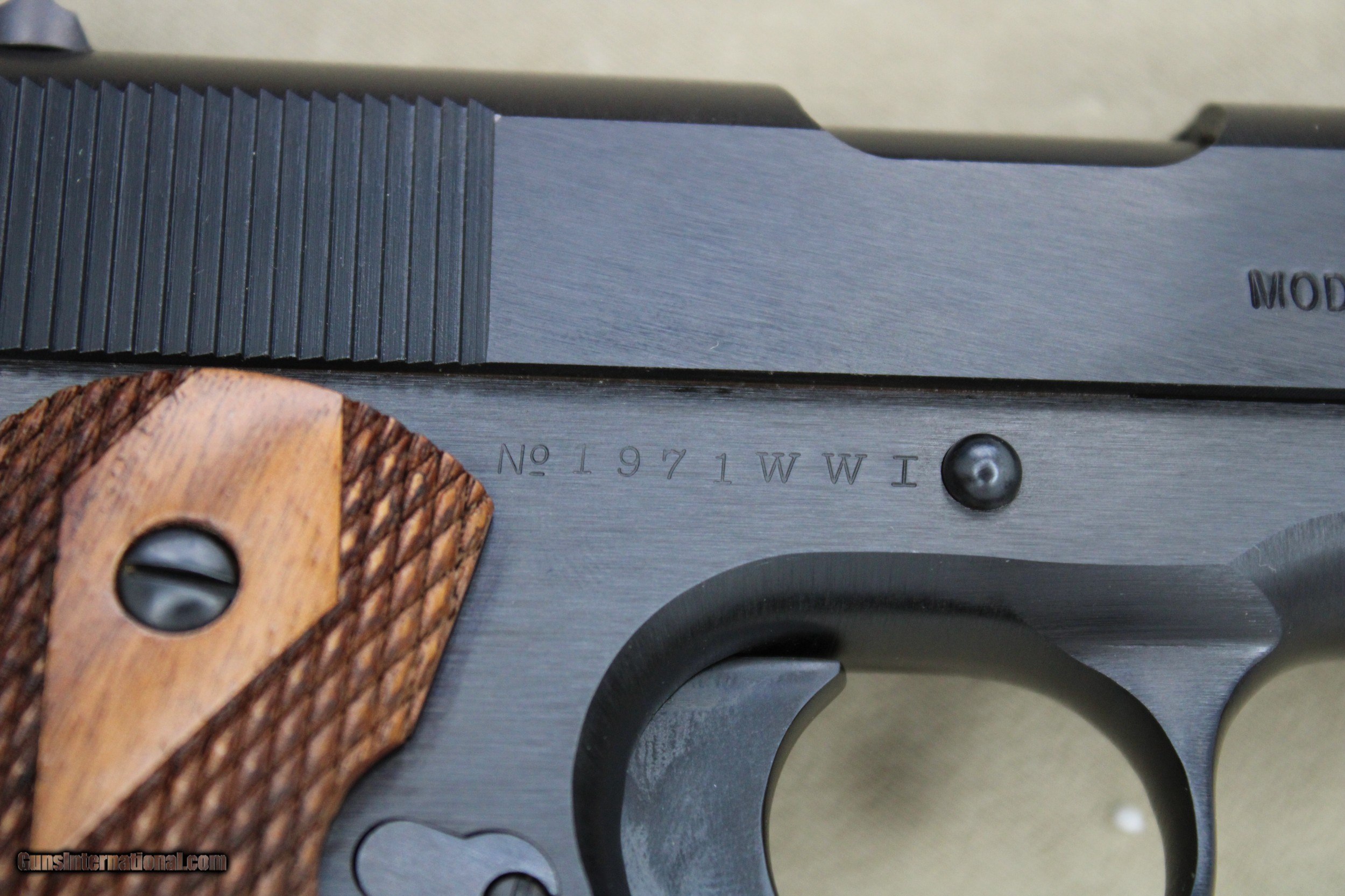 Description: ****SOLD**** Here is a beautiful and unfired Colt 1911 Model 1918 WWI reproduction chambered in .45acp. Manufactured in 2008, this Colt is an accurate reproduction of the Model 1911 US military sidearm that was manufactured in 1918. This pistol features a 5" barrel, GI components, WWI roll marks, checkered hardwood grips, and a black oxide finish. The black oxide finish is in excellent condition across the entirety of the firearm and shows the faintest amount of handling wear. The WWI roll marks are incredibly crisp and legible, and the checkered hardwood grips fit very nicely to the frame. The grips are in like-new condition and show no signs of cracks, chips, repairs, or wear. The bore is bright, with sharp rifling, and all the controls function 100%. This Colt 1911 includes the original blue box, outer sleeve, paperwork, and one magazine. Unfortunately, the original owner misplaced the second magazine. This Colt is an excellent representative piece of WWI history and would make an outstanding addition to any collection. PRICE: $1795.00 We are Antique & Modern Firearms in Lexington, KY, a dealer of fine firearms since 1974. PH. 859-276-1419 We Buy, Sell, and Trade Firearms & Knives. Have an Individual Firearm, Firearms Collection, or Firearms Estate to sell, let us know, and we can buy or consignment sell it for you. NOTE: No additional fee for a Credit Card payment SOLD Manufacturer: Colt Model: M1911 Model 1918 WWI Reproduction Serial Number: 1971WWI Barrel Length: 5 Inch Condition: LNIB Metal Condition: Excellent Wood Condition: Excellent Bore Condition: Bright with Sharp Rifling Action: Single-Action Finish: Black Oxide Manufacture Date: 2008 Extras: Original Box, Paperwork, One Magazine |