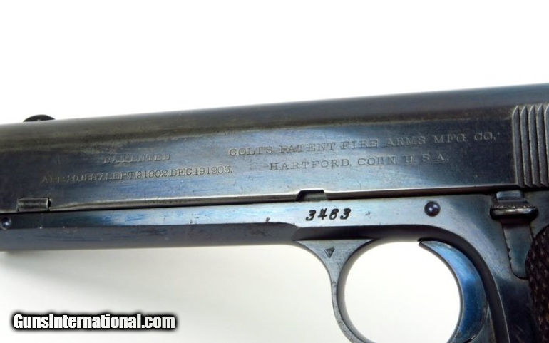 Colt 1905 .45 Auto caliber pistol. Made in 1908. Very fine condition with 75% plus of the original finish. Grips are very good. Bore is very good. Action works perfectly. A very nice example!