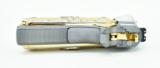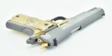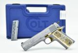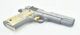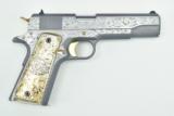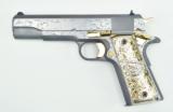 Colt Government .38 Super caliber pistol. Custom engraved stainless model with gold parts and Mexican style silver and gold plated grips. Has beautiful hand engraved scroll work. New