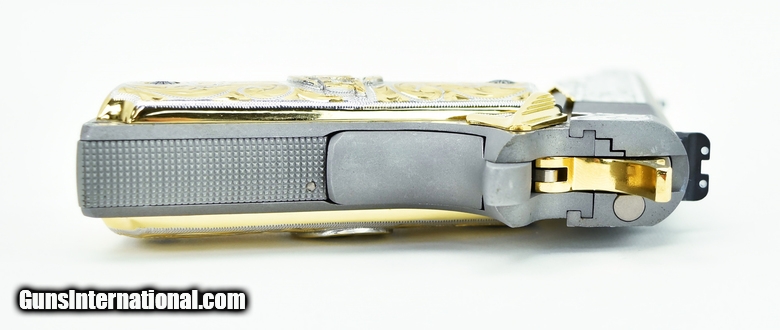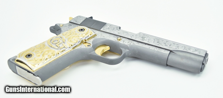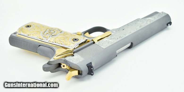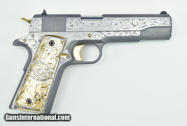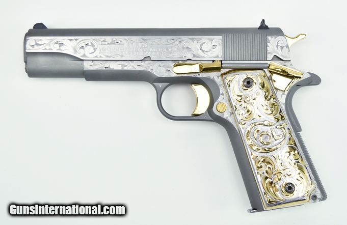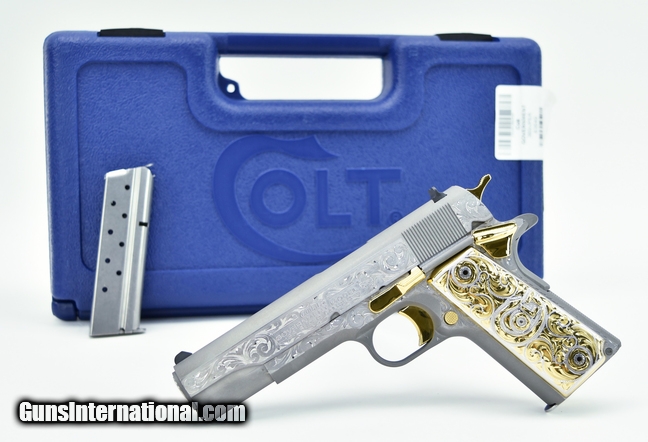 Description: Colt Government .38 Super caliber pistol. Custom engraved stainless model with gold parts and Mexican style silver and gold plated grips. Has beautiful hand engraved scroll work. New