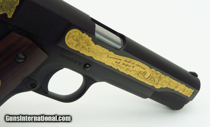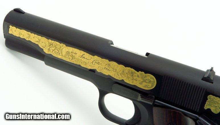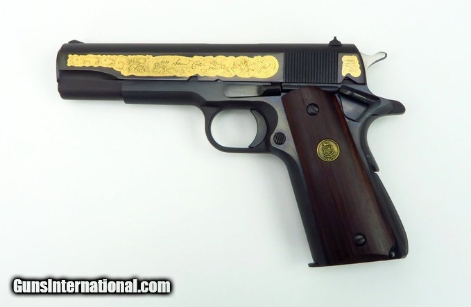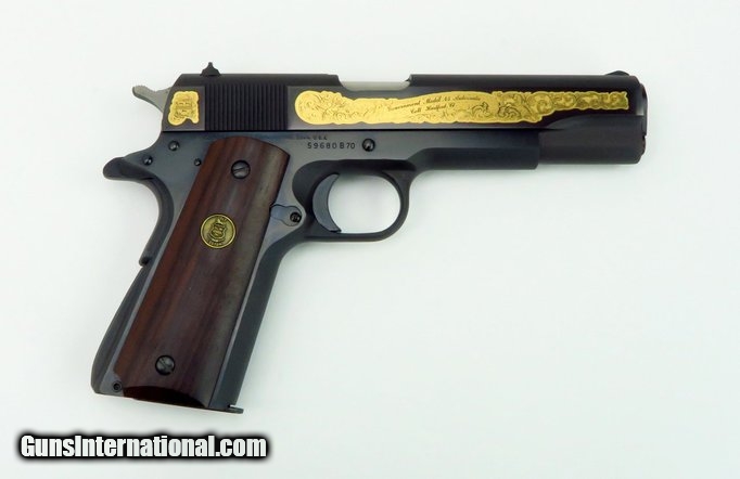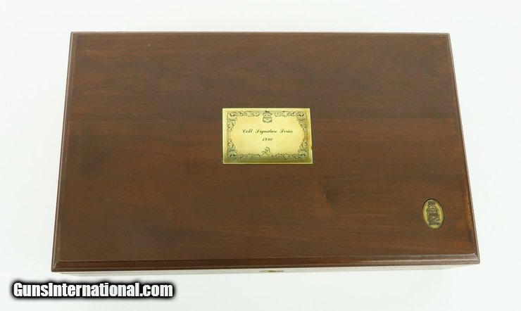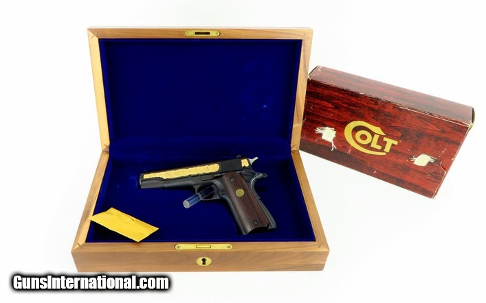 Description: Colt Government .45 ACP caliber pistol. Sam Colt signature series special edition. Has gold decorations, made on a series 70. Excellent condition with box and wooden case.
