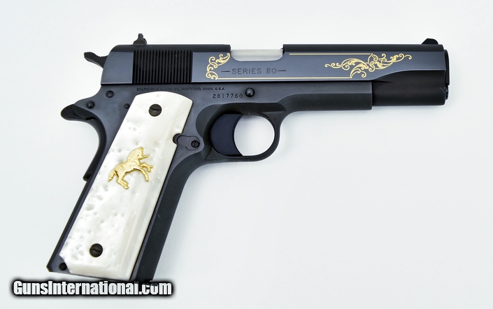 Description: Colt Government .45 ACP caliber pistol. Special edition with gold decoration and fancy grips in excellent condition.