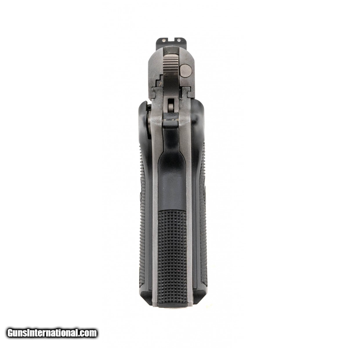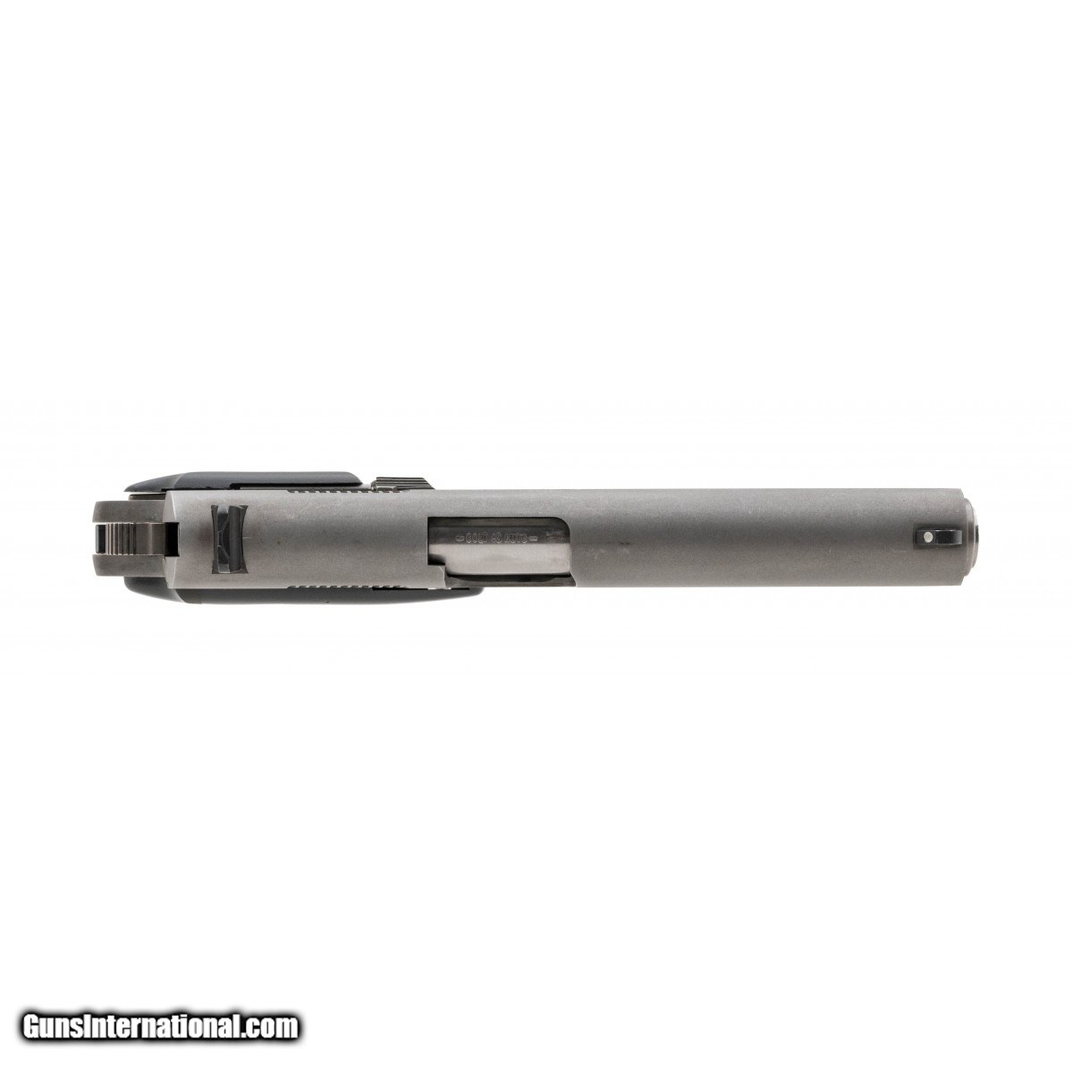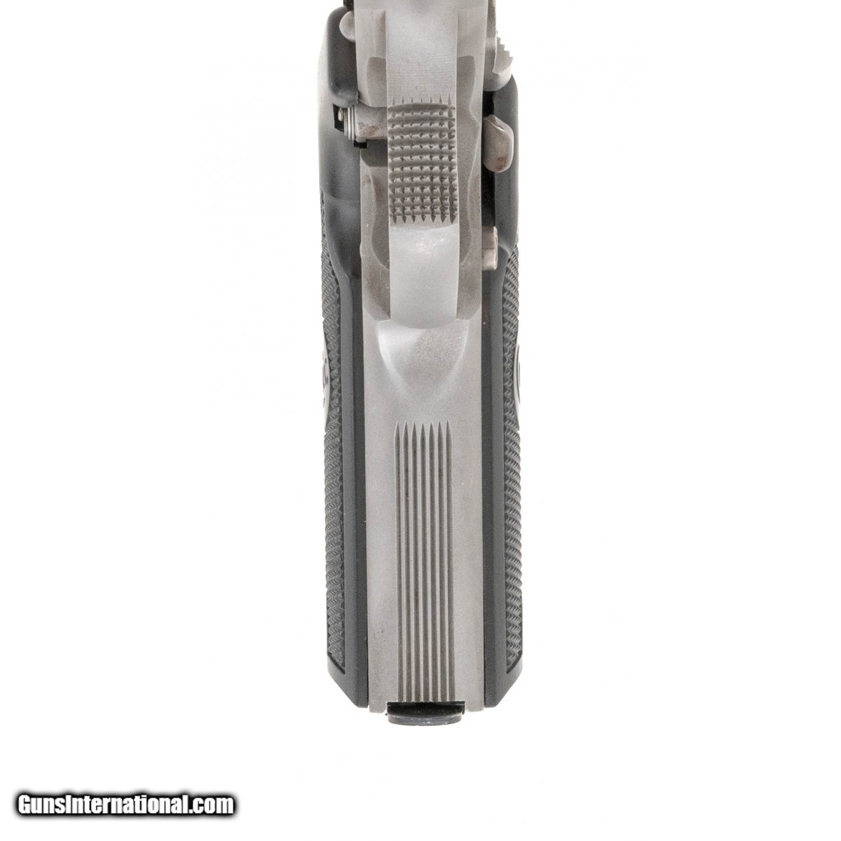 Description: " SN: DA16409. Made in 1990. 45 ACP, 5"" barrel. Full size stainless steel double action auto. Very good condition with some wear. SOLD |