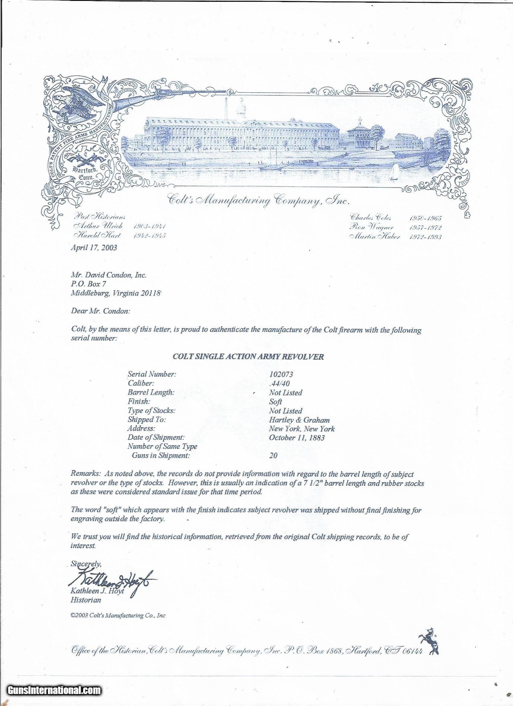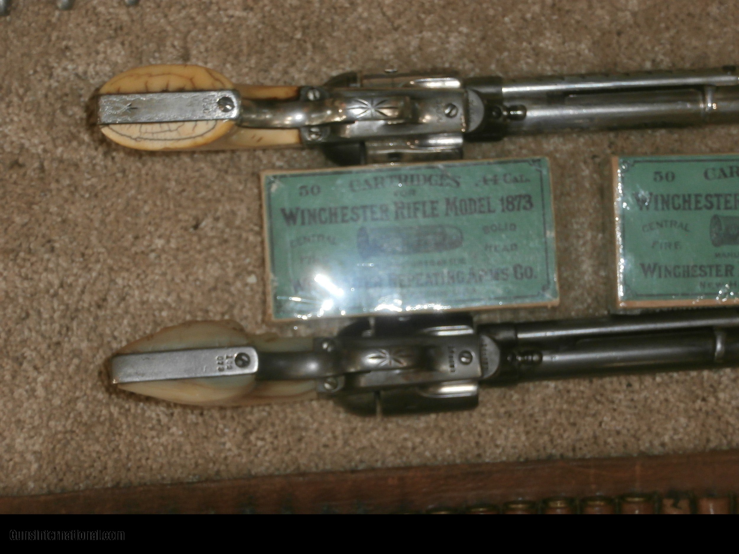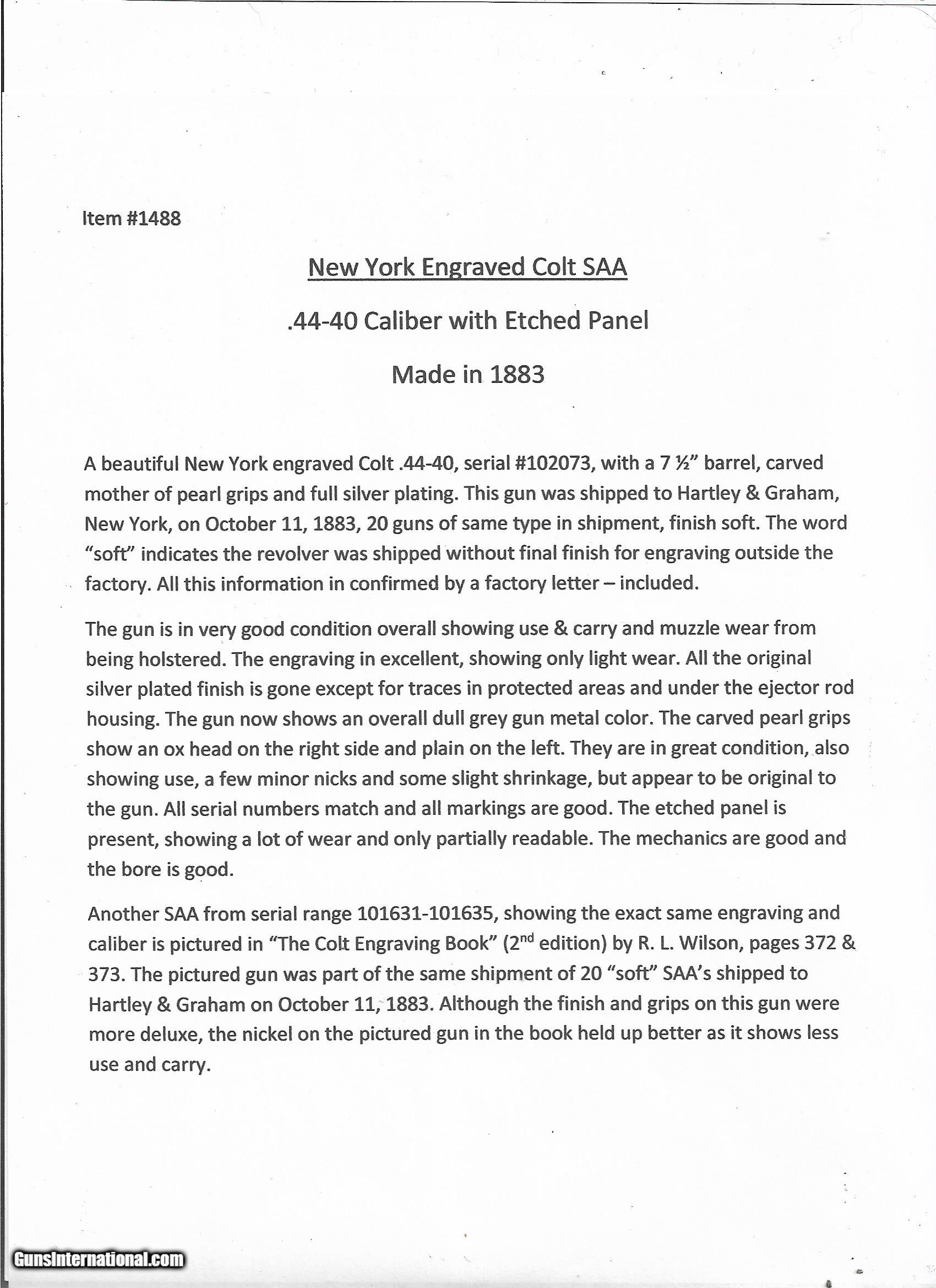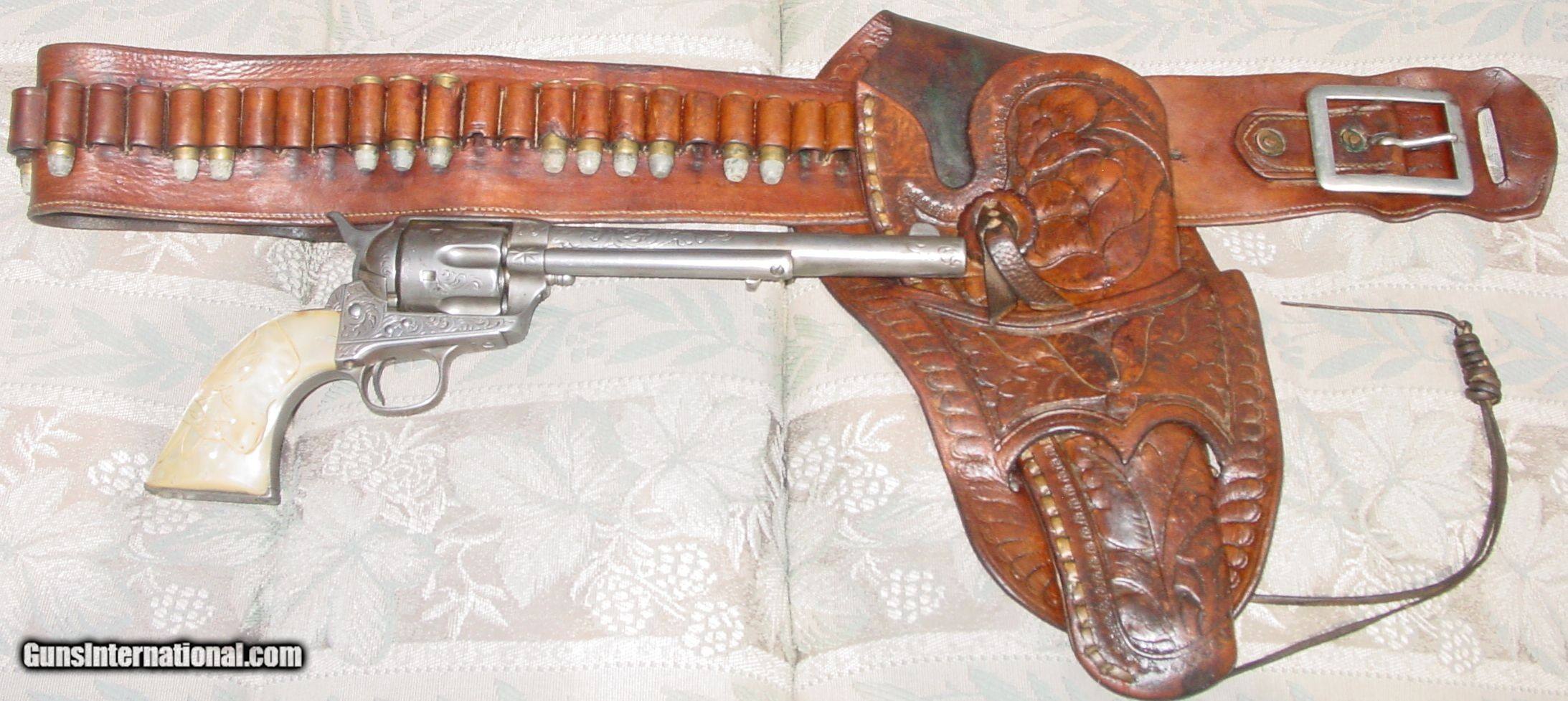 Description: Wonderful Colt NY Engraved pistol, 7 1/2" , 44 cal silvered, old Pearl grips with 2 kill notches, wonderfull rig included with unopened orig bullets in box of 50 --asst'd spare bullets, box of modern black powder loads included-- see pics for letter/desc. THE RIG AND BULLETS ALONE ARE WORTH ALMOST 3K. SOLD Antique: Yes |