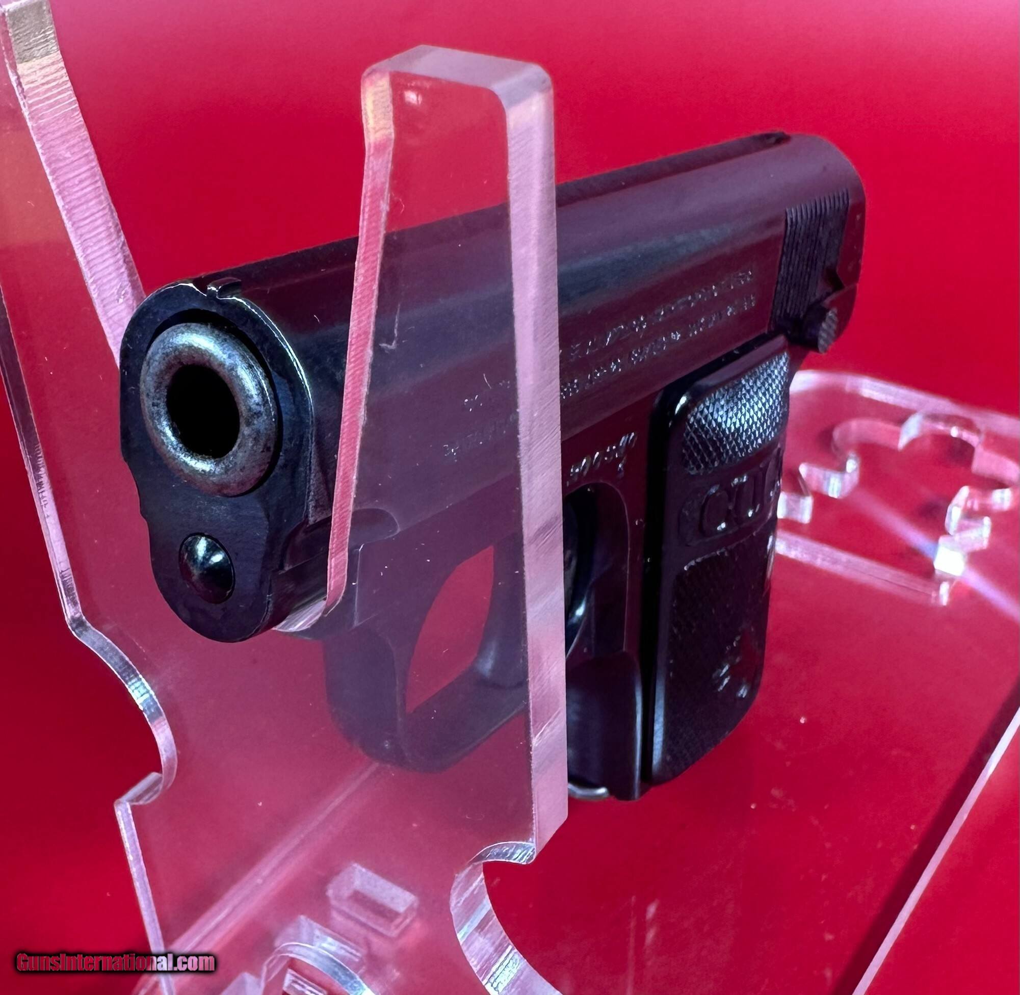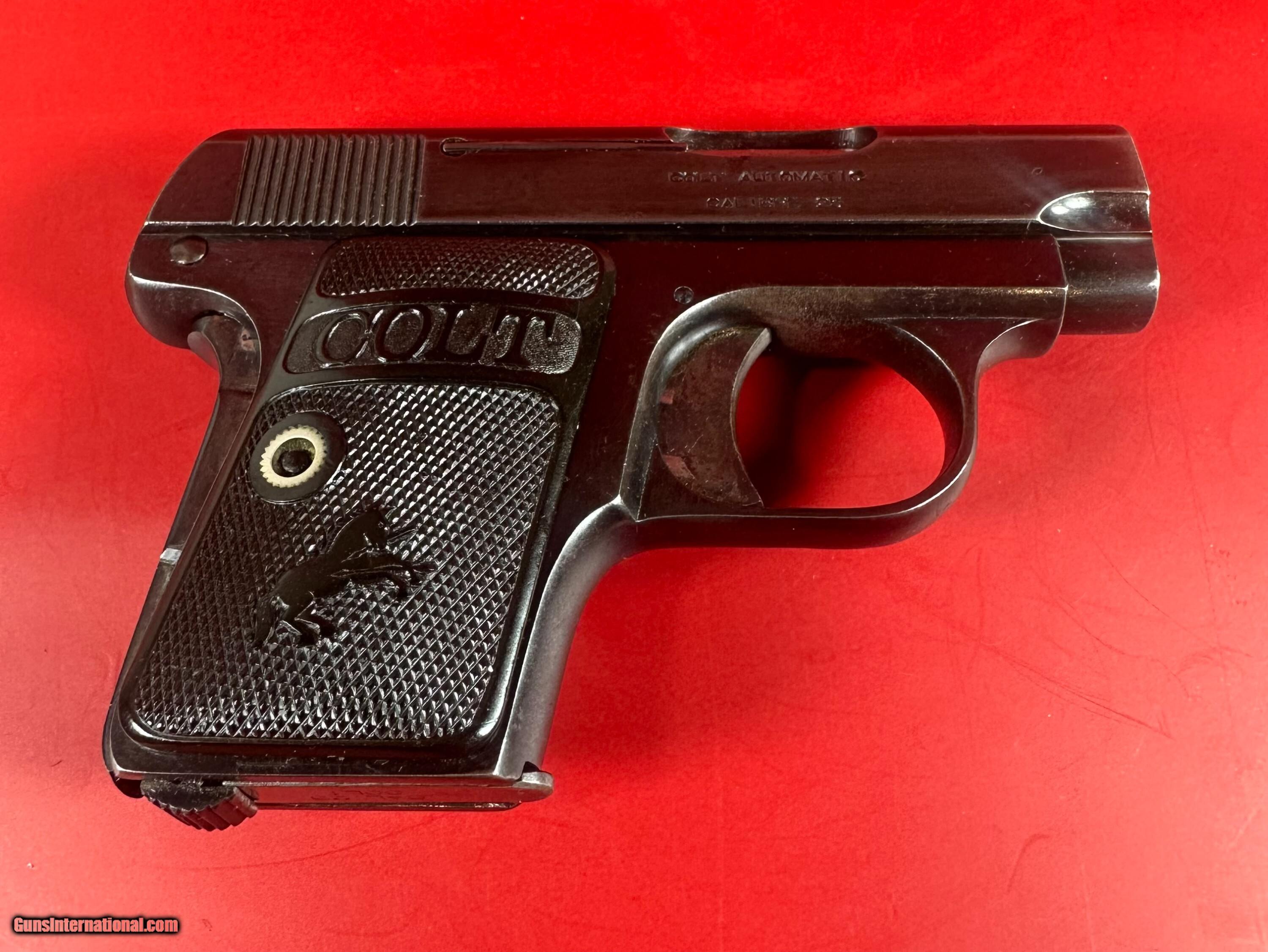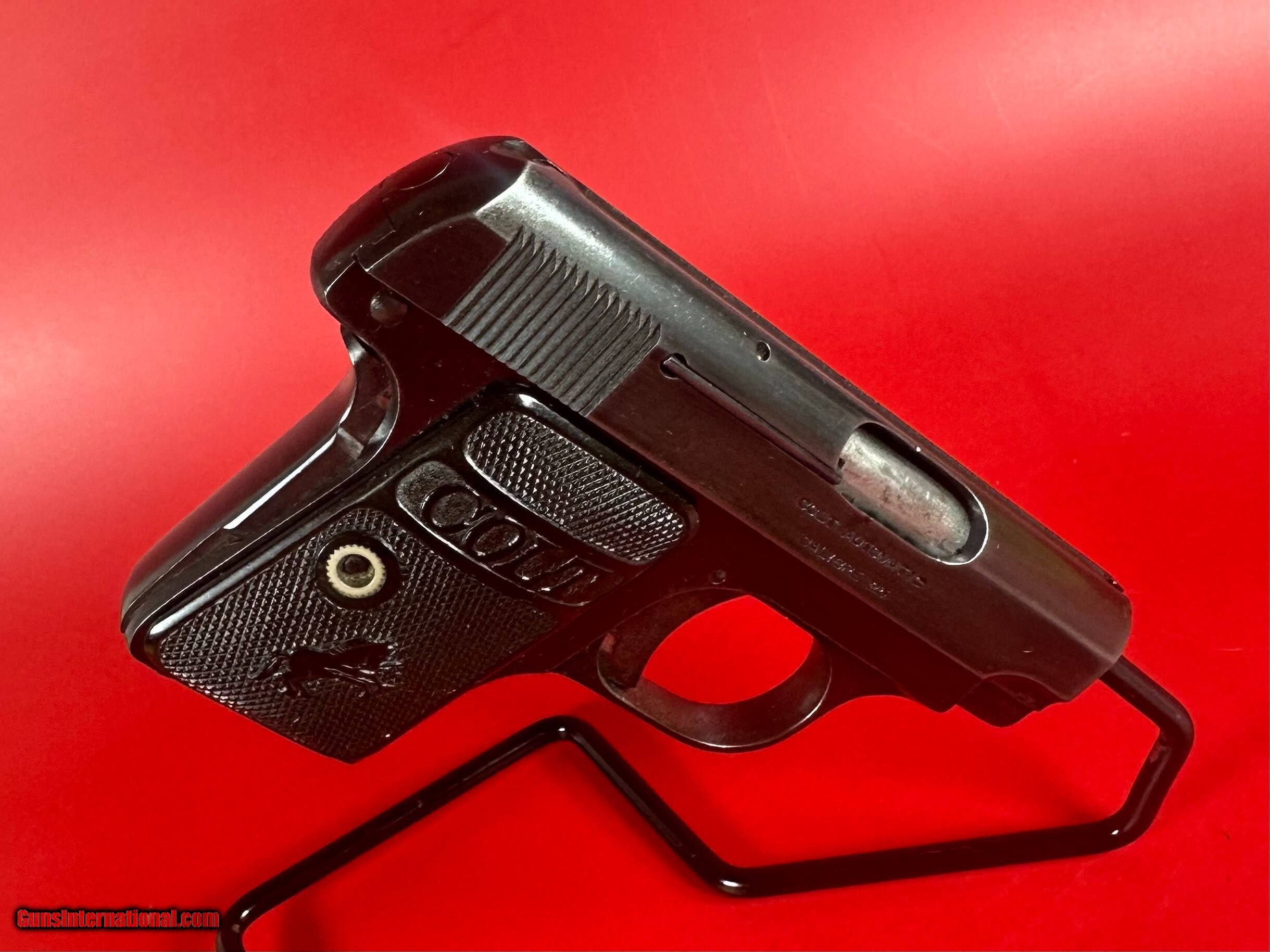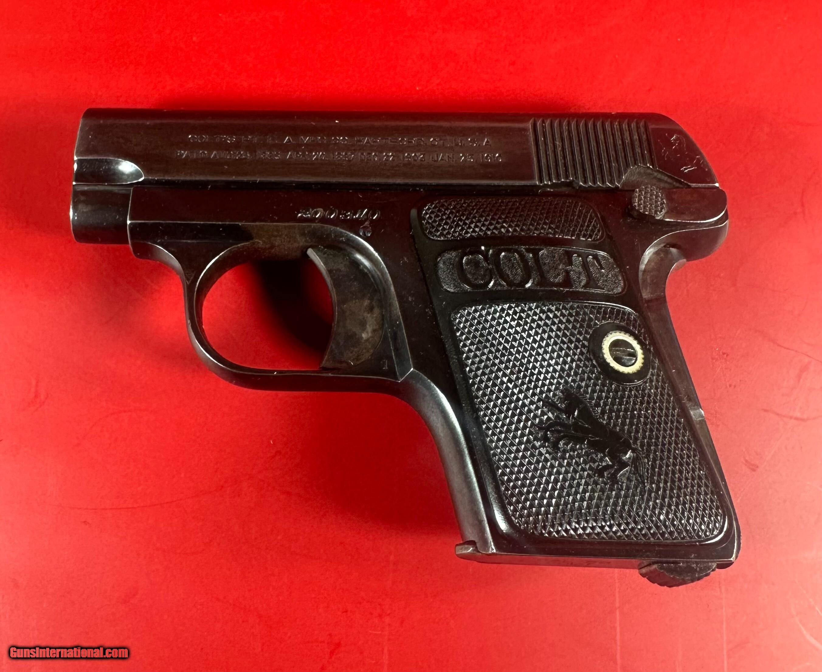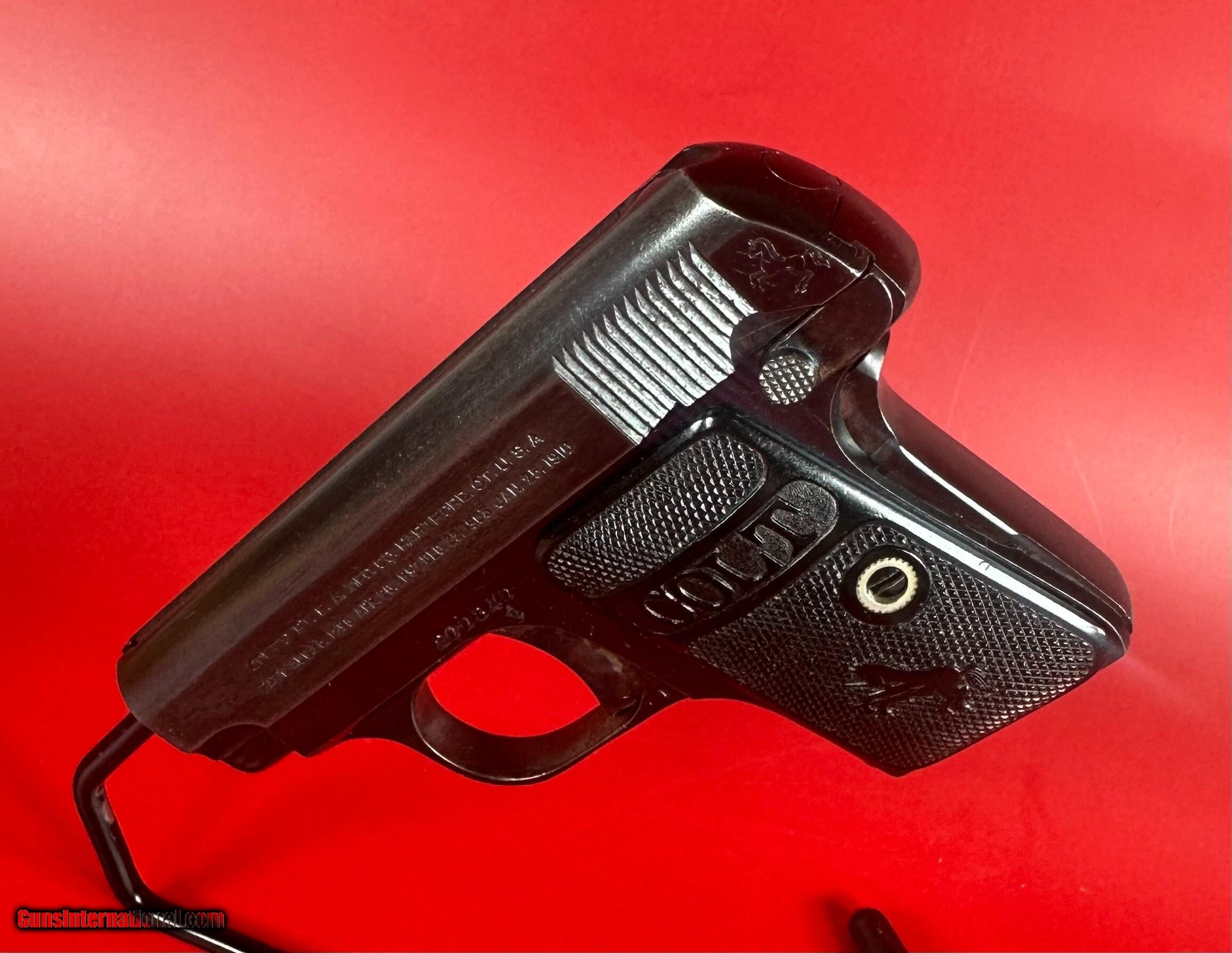 Description: The Colt Model 1908 Pocket Hammerless is a semi-automatic pistol designed by John Browning, and was the 2nd of the Colt concealed hammer models, following the Model 1903. This is a Colt 1908 Vest Pocket semi-auto made in 1919 and it's striker fired. With its small size, this piece was a popular choice for personal defense, designed to seamlessly fit into a vest pocket for ultimate concealment. The example is in the excellent condition. Metal finish is about 98%, grips are about 98%, bright bore with strong rifling. Action functions the way it should. Sale includes one original two tone magazine. Don't miss your chance to own classic firearm in great condition. Specifications