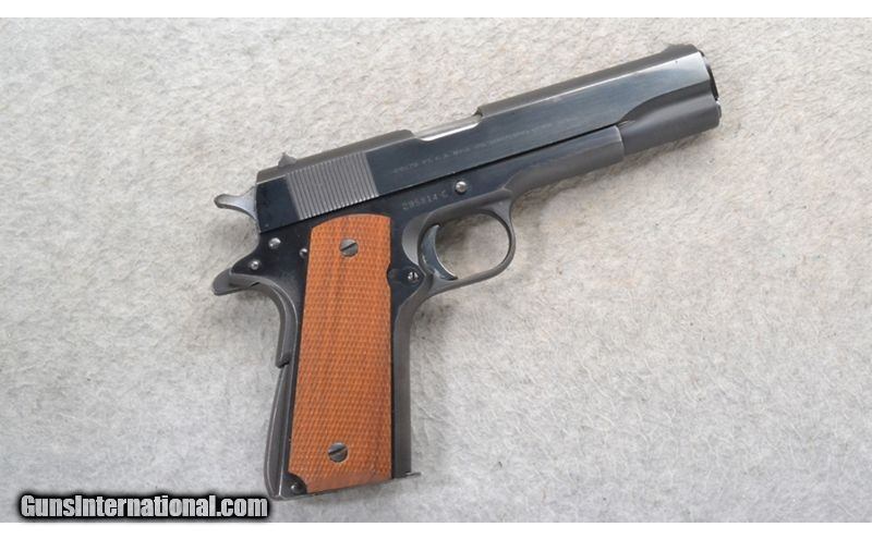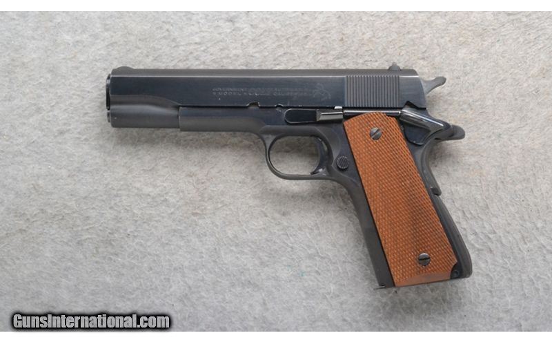 Description: This Colt Model Government Model is a right hand semi-auto pistol in .45 ACP Cal. It has a 5 inch barrel with a rear serrated slide. A blade front sight and notch rear sight. The grip panels are a diamond checkered hardwood .45 ACP SOLD Chambers: 7 round magazine. Metal Condition: Very Good. Has some minor freckling and use marks. Wood Condition: Excellent. Bore Condition: Very Good. Barrels: 5 inch barrel with a rear serrated slide. Weight: .40 oz. Sights: Blade front. Notch rear. Item Location: Richfield, WI |