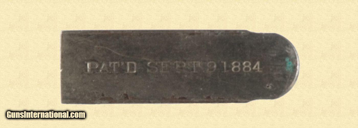 Description: 38 AUTO; 75% blue, fair bore, good grips, 6'' barrel, Made in early 1902. Rear plunge cuts on slide. High spur hammer and slight safety. Finish thinning on slide and grip straps. Nickle magazine with 1884 patent date. Back strap is expertly engraved with a name "Ed.Hickman. April 4th 1901. SOLD Curio/Relic: Yes Serial Number: 1972 |