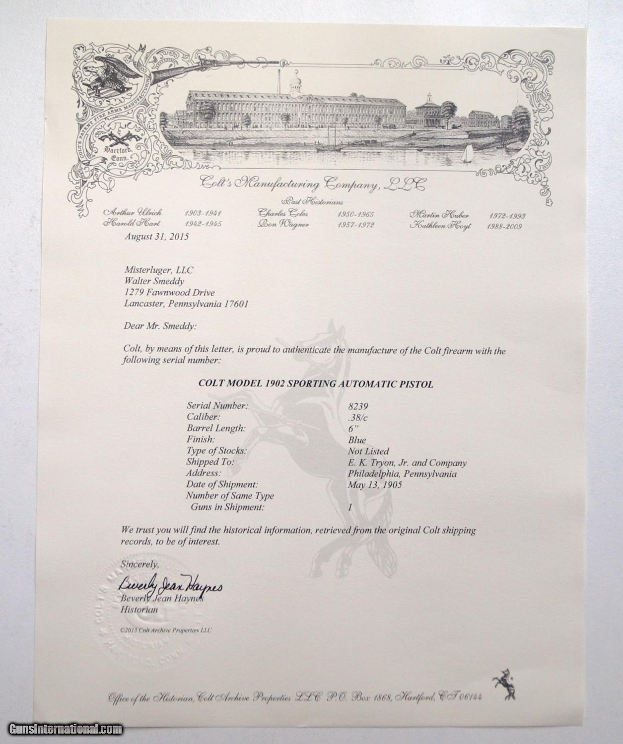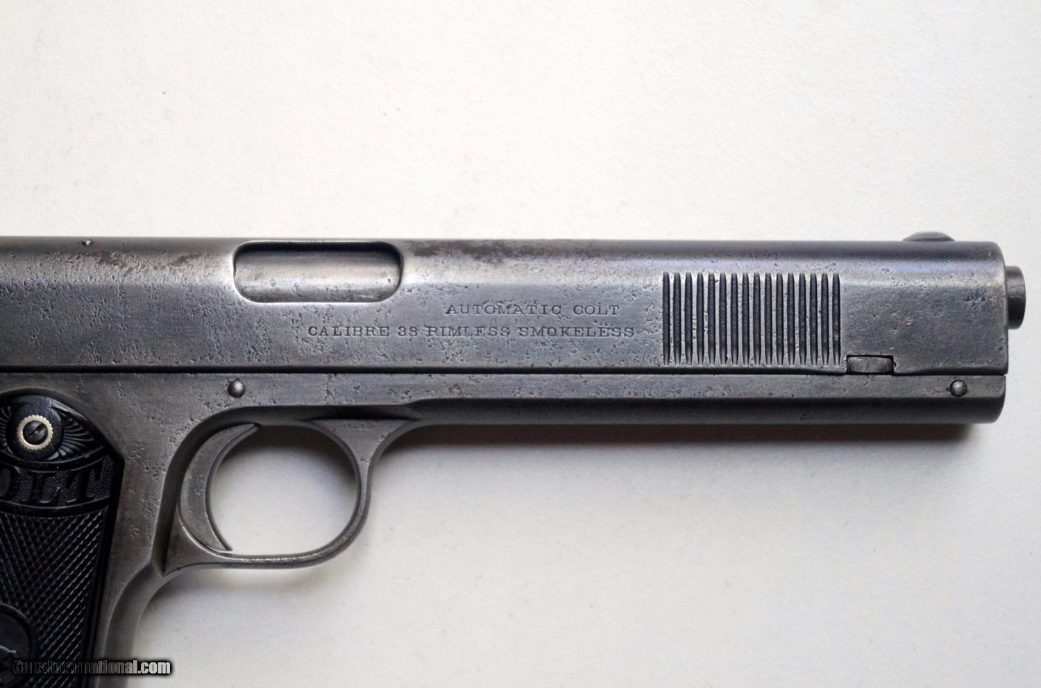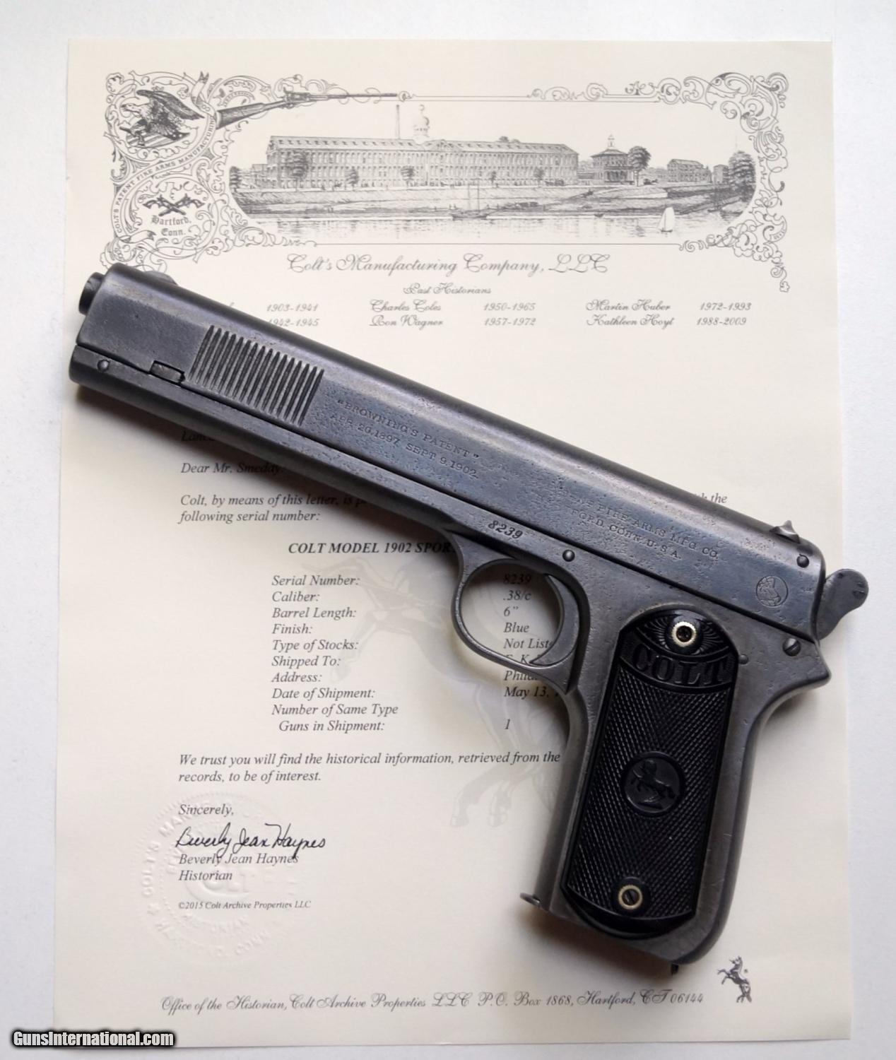 Description: THIS IS A 1902 COLT SPORTING, .38 ACP. THE GUN IS IN GOOD CONDITION, ALL ORIGINAL, NUMBER MATCHING, VERY GOOD BORE AND GRIPS, MECHANICALLY CORRECT AND TIGHT. A VERY NICE 1902 COLT WITH THE LONG 6" BARREL AND FRONT SLIDE CHECKERING. NOTE: THE GUN COMES WITH A LETTER OF AUTHENTICITY FROM THE COLT ARCHIVES. SOLD Curio/Relic: Yes |