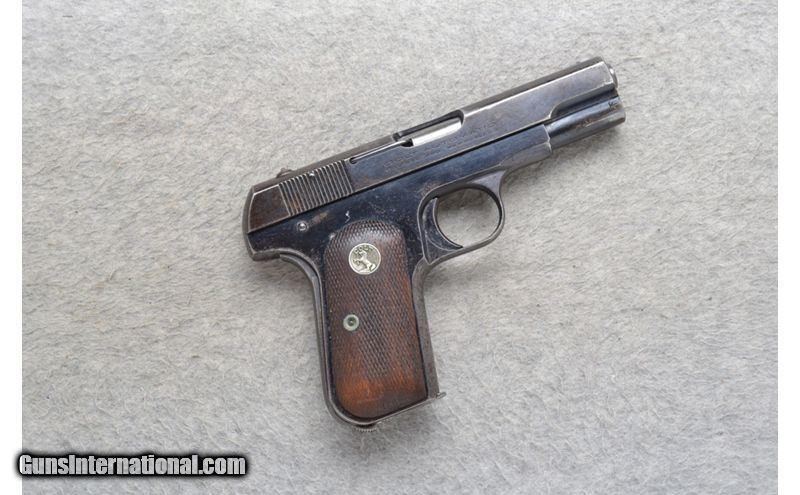 Description: This Colt Automatic Model is a right hand semi-auto pistol in .380 ACP Cal. The frame is a 1903 model and the slide is a 1908 model. It has a 3.75 inch barrel with a rear serrated slide. A blade front and notch rear sight. The grip panels are a diamond checkered walnut with silver Colt horse medallions. Serial Number 142382. .380 ACP SOLD Chambers: Semi-Auto 7 round magazines. Metal Condition: Fair. Has freckling and handling marks. Some blue wear spots. Wood Condition: Fair. Has wear. Bore Condition: Very good. Barrels: 3.75 inch barrel with a rear serrated slide. Triggers: Solid. Weight: 26 oz. Sights: Blade front. Notch rear. Item Location: Richfield, WI |