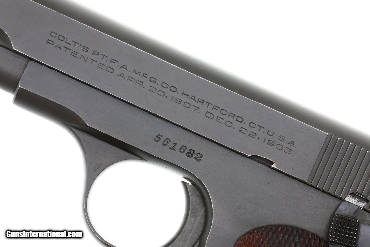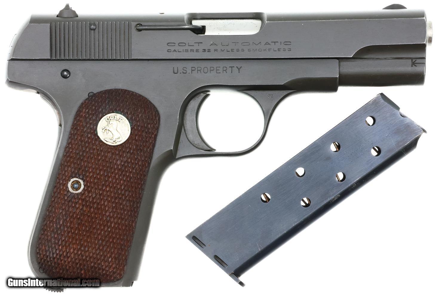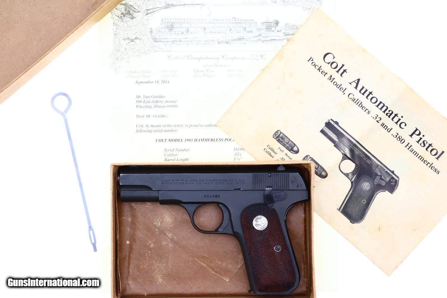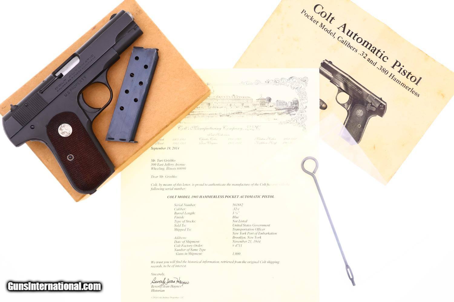 Colt Model 1903 Hammerless Pocket Automatic pistol, cal. .32 ACP, SN: 561882, parkerized with blued small parts and magazine, bearing standard Colt factory markings on slide and frame to which “U.S. PROPERTY” was added to the right side of the frame. Checkered walnut grips with silvered Colt medallions. Blued Colt magazine with seven indicator holes and fixed floorplate marked "CAL. 32/COLT. Accompanied with an original instruction booklet and cleaning rod. Contained in a generic cardboard box with a handwritten serial number. Complete with Colt factory letter confirming shipment to the United States Government on November 21, 1944