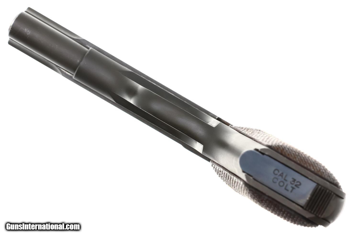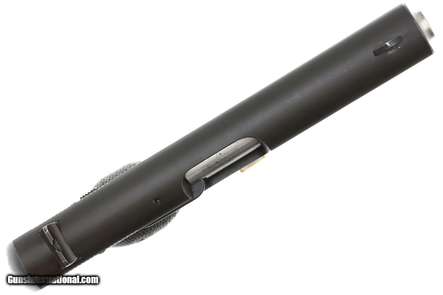 Description: Synopsis: Original Colt 1903 Hammerless .32 ACP, “U.S. PROPERTY”, parkerized with checkered walnut grips, complete with Colt factory letter documenting U.S. Government sale, shipment November 21, 1944. Description: Colt Model 1903 Hammerless Pocket Automatic pistol, cal. .32 ACP, SN: 561882, parkerized with blued small parts and magazine, bearing standard Colt factory markings on slide and frame to which “U.S. PROPERTY” was added to the right side of the frame. Checkered walnut grips with silvered Colt medallions. Blued Colt magazine with seven indicator holes and fixed floorplate marked "CAL. 32/COLT. Accompanied with an original instruction booklet and cleaning rod. Contained in a generic cardboard box with a handwritten serial number. Complete with Colt factory letter confirming shipment to the United States Government on November 21, 1944 Condition: Crisp 99+% original parkerizing with just trace sharp edge wear, blued small parts in comparable or better condition. Verified Proof on left trigger guard and assembler number "35" on the right side both breaking through the parkerized finish, clearly original even though the factory letter cites "blue." Comparable condition oil soaked grips, minor blunting of the checkering. EXC original finish magazine with minor insertional wear. Instruction booklet creased and oil stained. Excellent original factory letter. A wonderful gun with factory letter citing Government sale in 1944! Manufacturer: Colt Model: 1903 Serial Number: 561882 Caliber Info: .32 ACP Condition: EXC Price: $4,995.00 Contact Seller |