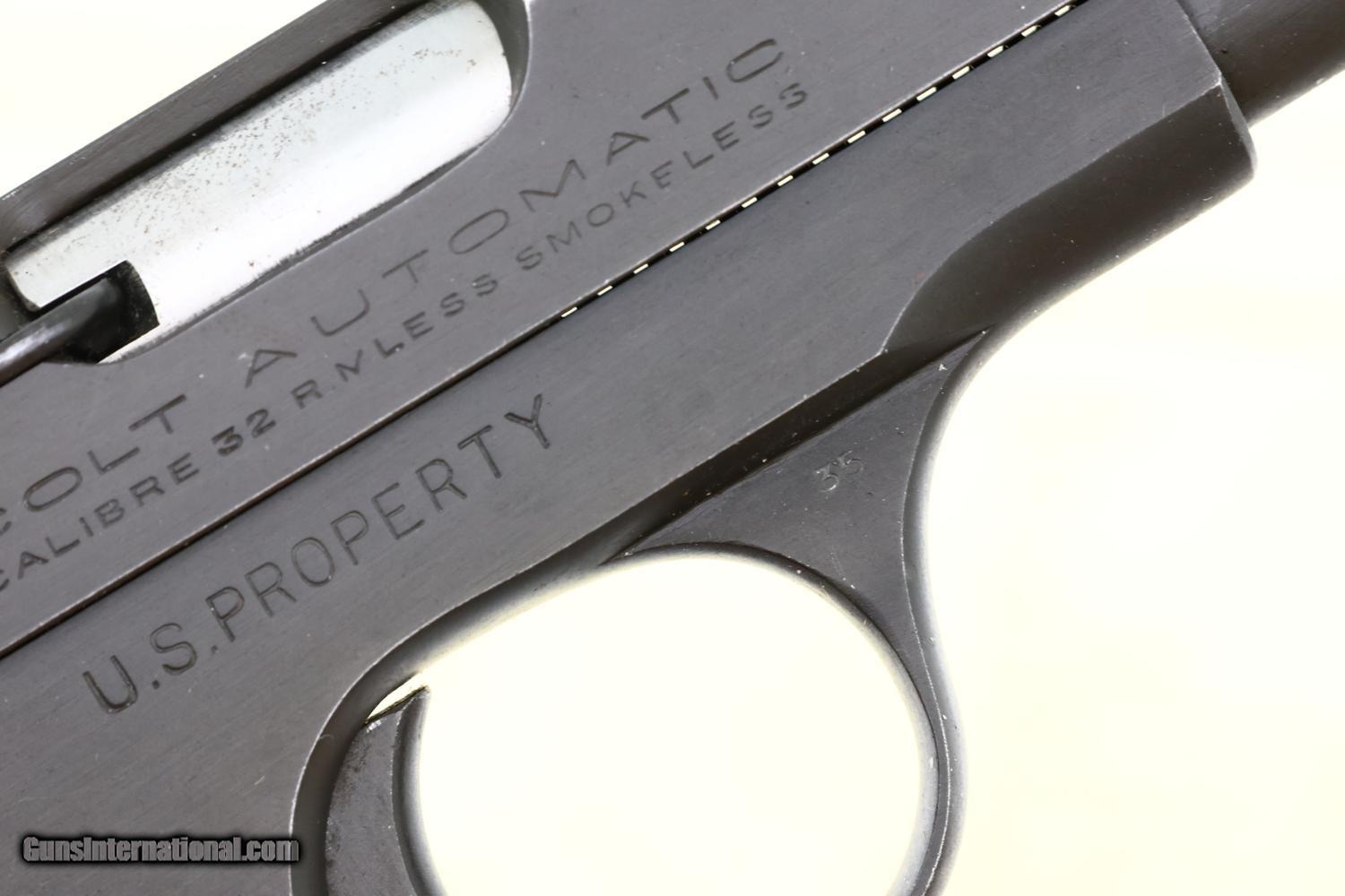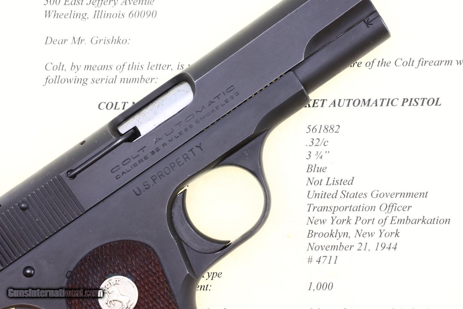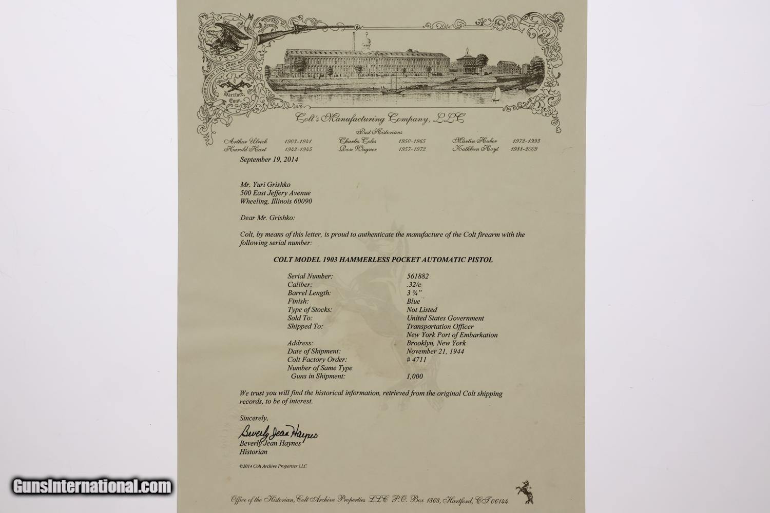 Original Colt 1903 Hammerless .32 ACP, “U.S. PROPERTY”, parkerized with checkered walnut grips, complete with Colt factory letter documenting U.S. Government sale, shipment November 21, 1944.