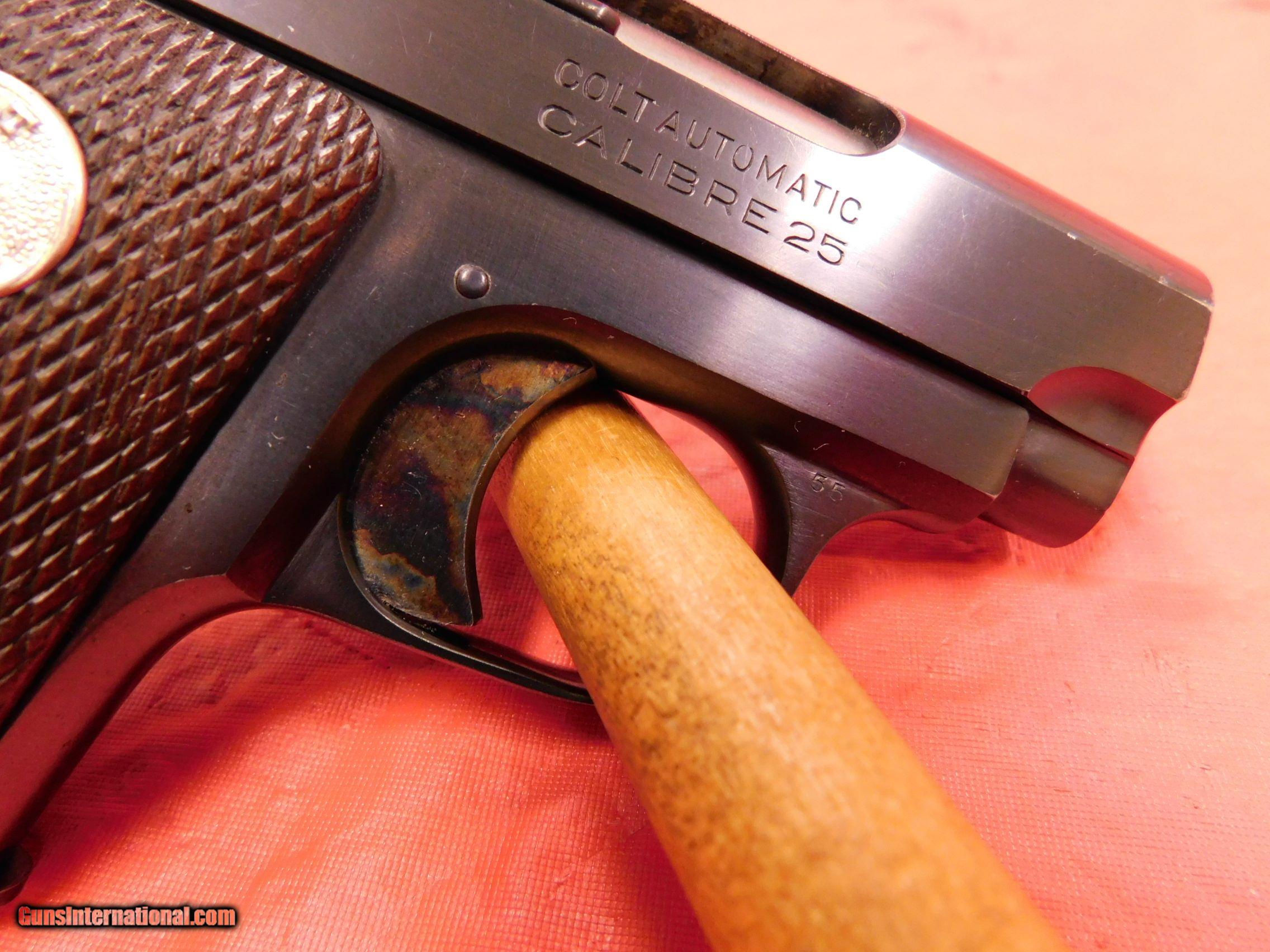 Description: Colt 1908 hammerless 25acp 2" bbl, made in 1936, great shape,collector condition , nice bright case coloring on trigger, back strap and safety,95%blue, perfect grips. serial #403849. Only $$750 $25 shipping and NO cc fees. Please ask for Pat 716-833-2581 or 716-835-1546. SOLD Manufacturer: Colt Model: 1908 Hammerless Serial Number: 403849 Caliber Info: 25acp Condition: used Barrels: 2 |