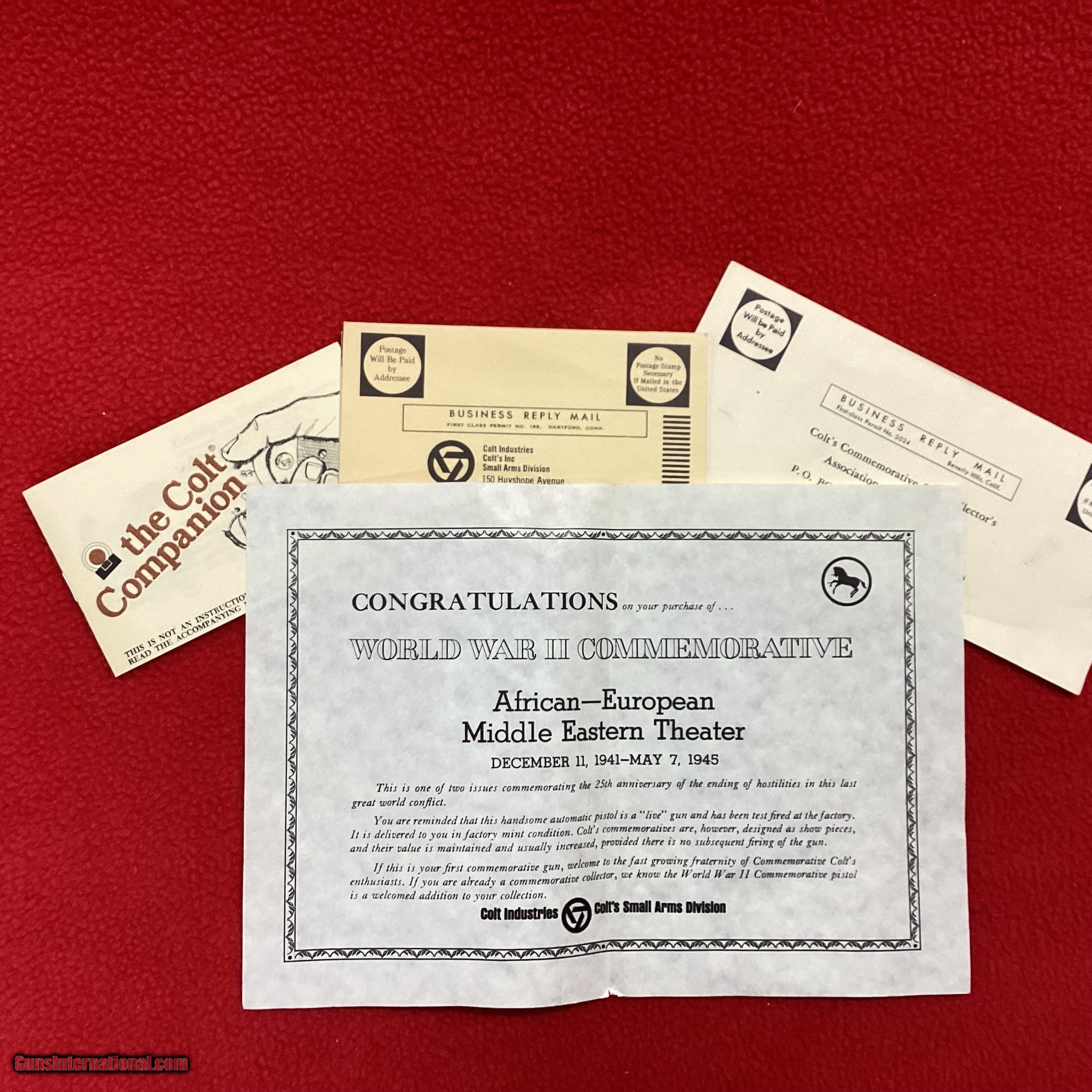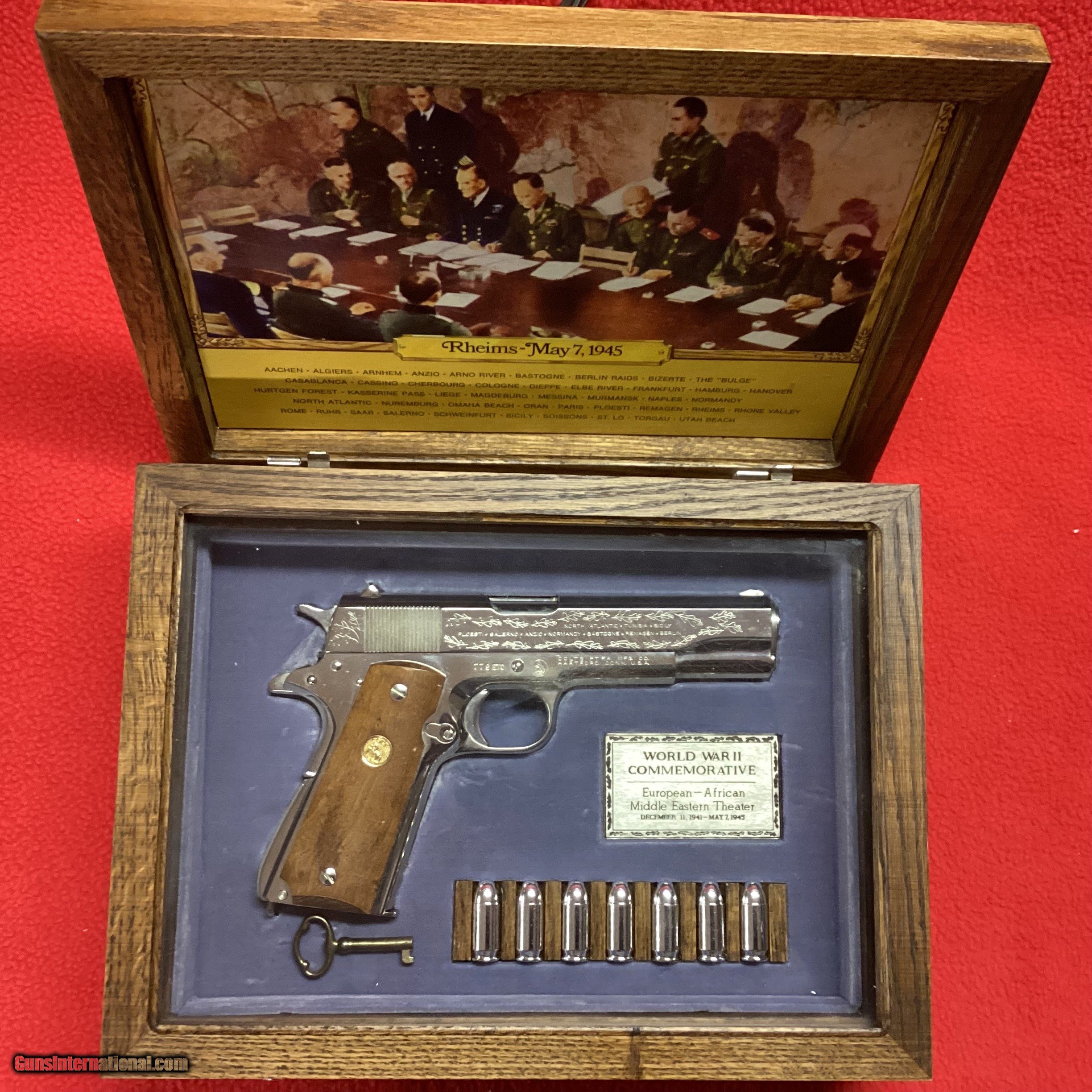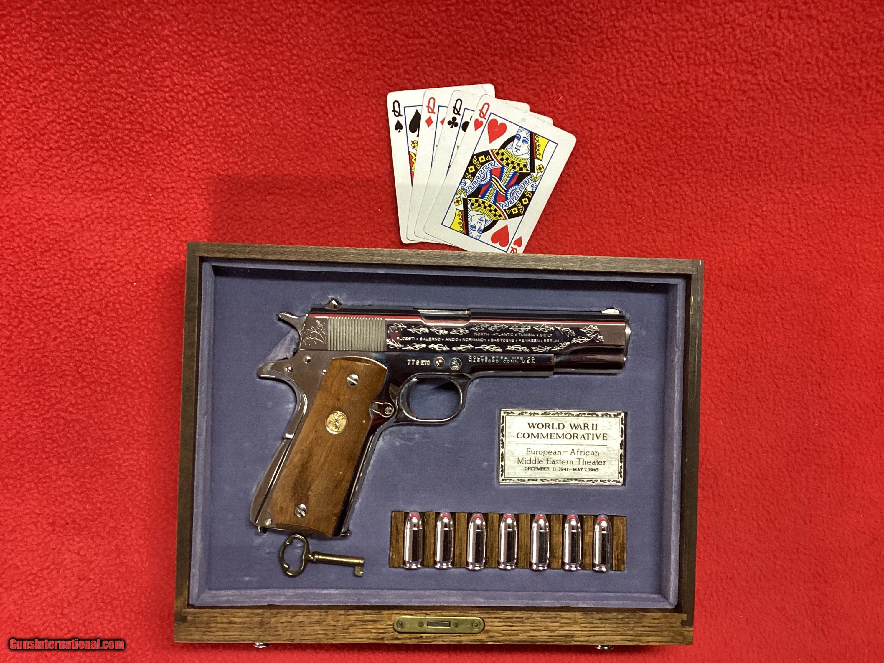 Description: FOR YOUR VIEWING FROM AN ESTATE IS A COLT 1911 45 ACP IN A COMMEMORATIVE PRESENTATION CASE HONORING THE AFRICAN EUROPEAN CAMPAIGN FOR THE SECOND WORLD WAR. THE PISTOL IS IN PRISTINE NEW CONDITION, AND COMES WITH ALL PAPER WORK. NOTE SHIPPING AND INS. EXTRA CALL FOR MORE INFO ETC. THANKS FOR LOOKING ASK ABOUT MY EZ PAY PLAN SOLD |