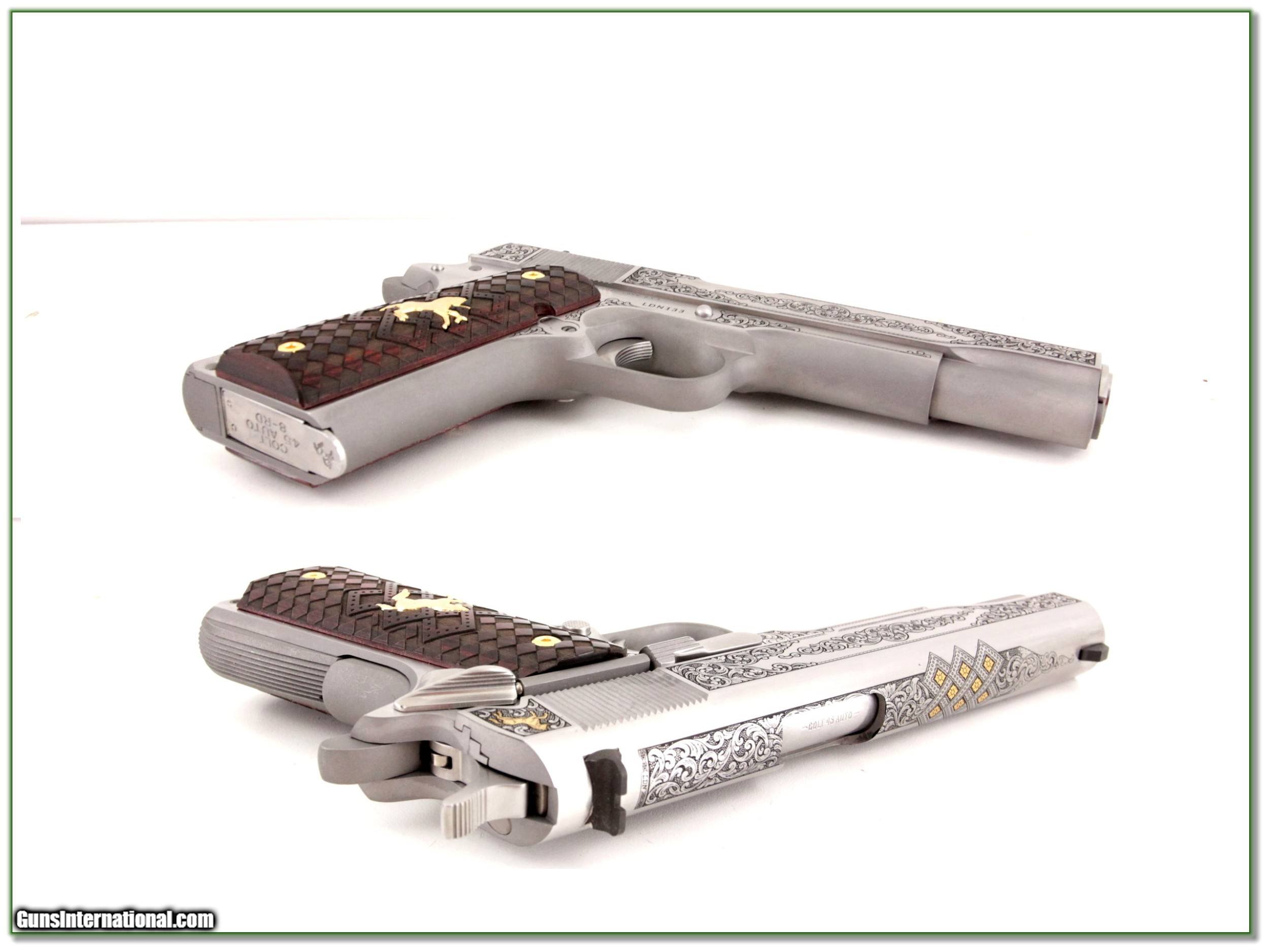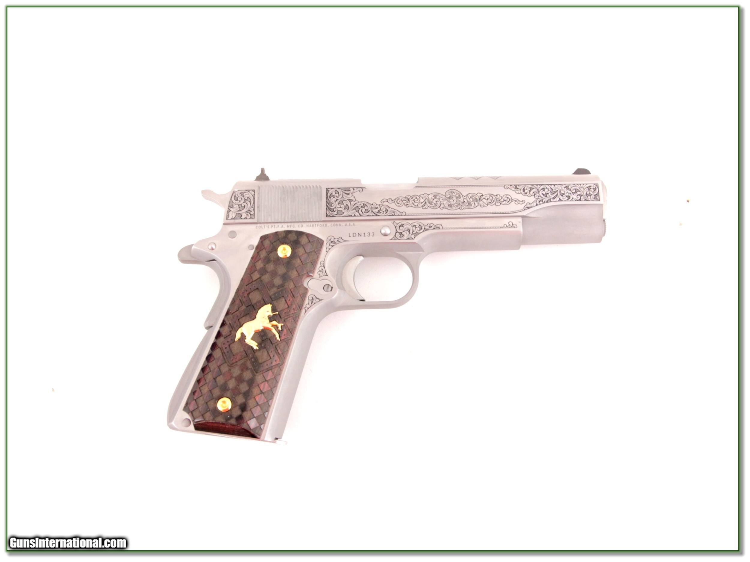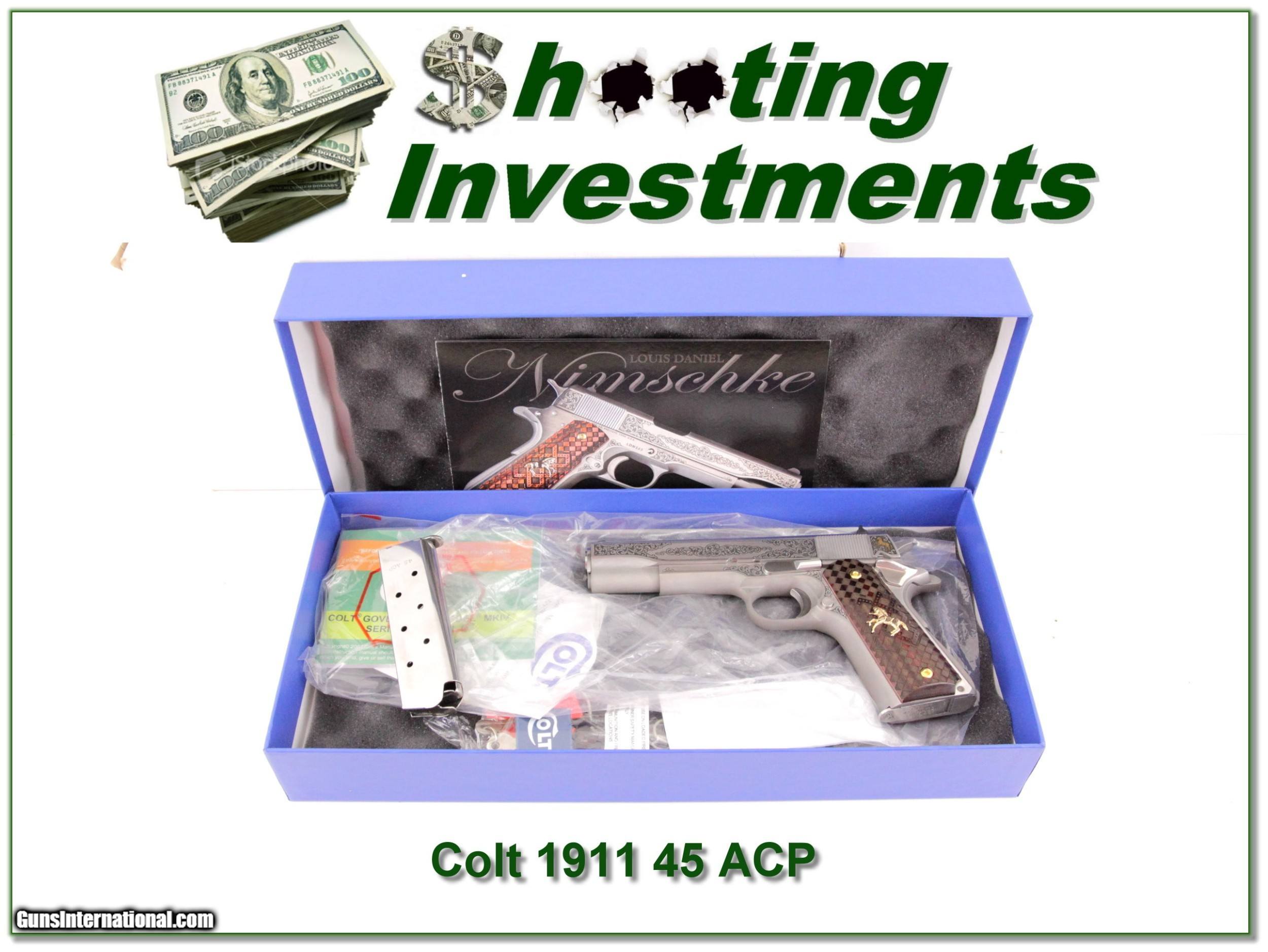 Description: This is a new and unfired Colt 1911 Colt 1911 Louis Daniel Wimschke engraved commemorative. Only 300 of the 45 ACP’s were made. This is number 133. It comes as seen in case with papers. I am selling this one on consignment and as such lay-a-way can’t be used. It does of course have the standard 3-day inspection. Shipping with insurance is $49. Please email me with any questions or larger pictures. (Consign your quality firearms with Shooting Investments for only 12%! Let me know if you have any you would like to sell!) 19-1289 Payment: Payment is by Money Order, Cashiers Check or Personal Check. I can now also accept MasterCard and Visa with a 3% convenience fee. PayPal can be used for some items but never firearms. Please let us know if you would like to pay via PayPal. Shipping: The shipping charge will be listed in each description. It is $39 for most long guns and $29 for most handguns. Some heavy guns or those insured for over $2000 will be higher. Shipments to Alaska and Hawaii are higher because air shipment is required. Most firearms are shipped on Tuesday and Thursday and usually in 5 days of receipt of payment. We package all shipments carefully and insure them. For long guns you can purchase a new Plano case for $19. They now cost us $22 when buying 100 at a time. Optics are shipped Priority Mail and most other non-firearm shipments are shipped First Class. Returns: Our return policy is simple. If for any reason you are not pleased with your purchase, you may return your item for a full refund of purchase price. Ammunition cannot be returned. It is important to us that you are happy. Guns cannot be fired or dissembled before returning them and they must be returned in the same condition as received. Notification of a return must occur with-in 3 days of receipt at your dealer. Shipping, convenience and dealer fees are not refundable and are the responsibility of the buyer. Lay-a-way: If needed, we offer a 60 day lay-a-way option on most firearms. It is 1/3 now, 1/3 in 30 days and 1/3 in 60 days. Lay-a-way firearm sales are final and if not completed the first payment cannot be returned. Consigning your firearms with Shooting Investments: We will help you get top dollar for your firearms. While most local guns shops charge 20% or more, our fee is only 12% with a minimum of $75. At your local gun shop it might take months to sell. Selling on-line provides instant access to thousands of interested buyers. You won’t find any other on-line dealer willing to sell your firearms for only 12% or listing every gun on 3 separate s. Selling through an House typically costs the seller 15% and the buyer an addition 15% (so 30%) and you have to wait several months to sell and longer to receive funds. If properly priced, we will sell your firearms in a few weeks. Send us an email or give us a call and we’ll explain how easy it is for you to get top dollar. Trading: Trading for use is really just buying your gun to re-sell. If you have a gun you want to trade, please email a picture and we will let you know what we can give or it. You will always get more if we sell it for you on consignment. Help for California Buyers: We are happy to ship to California. It is the buyer’s responsibility to make sure any item you buy is legal in your state. We are also happy to help with your purchase of a firearm from someone other than us. If you see a gun you would like to buy but the seller can’t or won’t ship to California they can ship to use and we’ll then ship it to your California dealer. The cost for this service is only $30 + shipping. Let us know if we can help! SOLD |