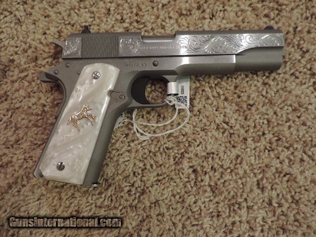 Description: COLT 1911 GOVERNMENT CUSTOM DEEP HAND ENGRAVED 38 SUPER SINGLE ACTION SEMI AUTO PISTOL - BRUSHED STAINLESS STEEL FINISH - CUSTOM GRIPS FEATURING WHITE PEARL WITH COLT GOLD RAMPANT HORSE - 5 INCH BARREL, MANUAL & GRIP SAFETY, FRONT HIGH PROFILE 1 DOT SIGHT, REAR HIGH PROFILE 2-DOT SIGHT, (1) MAG - CAPACITY 9 + 1. NEW IN BLUE COLT BOX. SUBJECT TO PRIOR STORE SALE. SHIP TO FFL ONLY. BUYER RESPONSIBLE TO DETERMINE IF FIREARM IS LEGAL IN HIS/HER STATE. BUYER PAYS $40.00 SHIPPING TO LOWER 48 STATES. BUYER PAYS 3% FOR CREDIT CARD. ARIZONA RESIDENTS PAY 6.712% SALES TAX. SOLD Manufacturer: COLT Model: O2091 Serial Number: 38SSXXXXX Caliber Info: 38 SUPER Condition: New in Box |