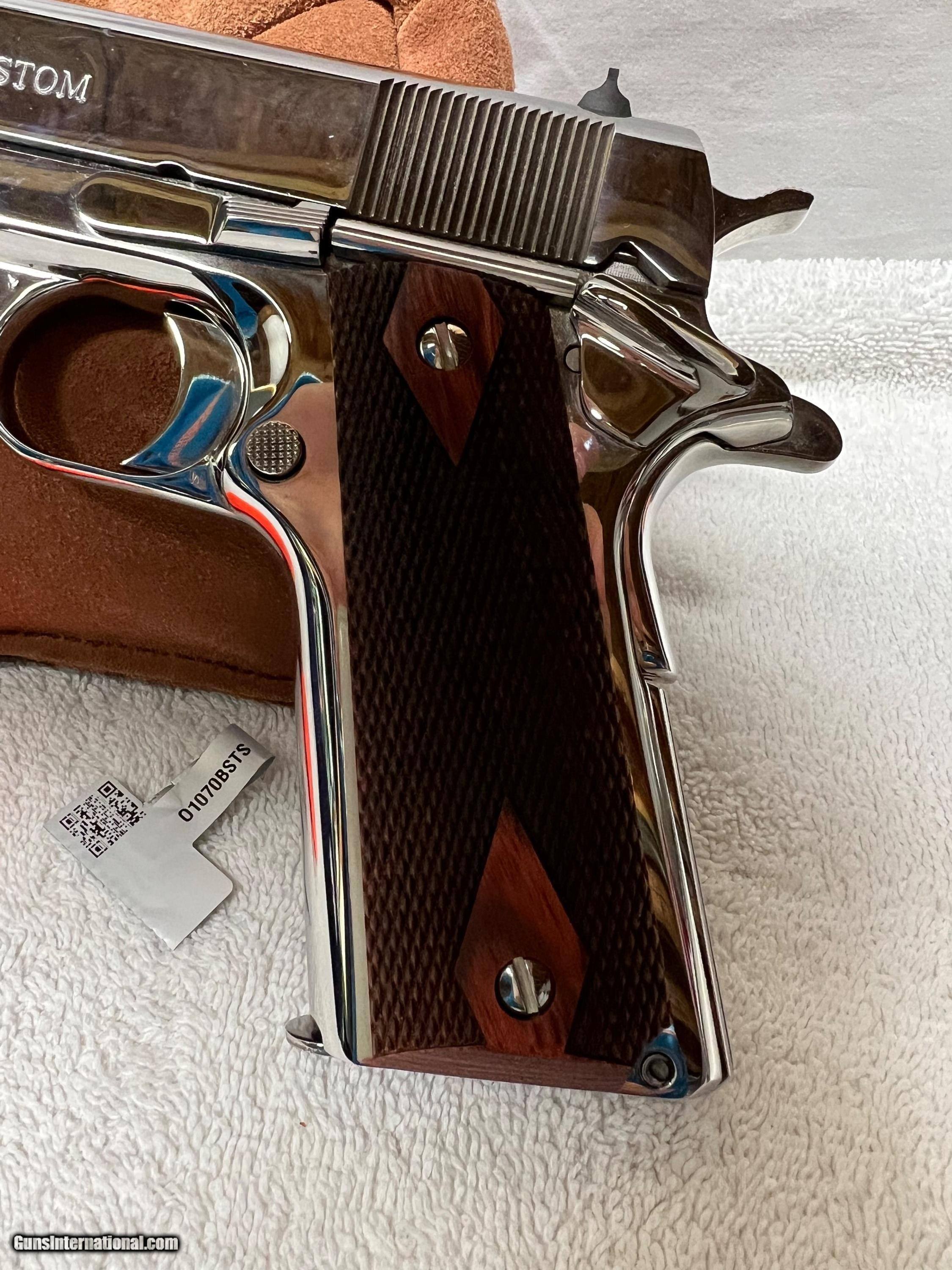Description: LNIB Colt Custom .45ACP original finish Bright Stainless Steel. Wood grips excellent condition. Includes original box numbered to gun, one mag, storage bag, manual, hang tag, paperwork preowned gun has been fired. 60.00 ship /ins Fee SOLD |