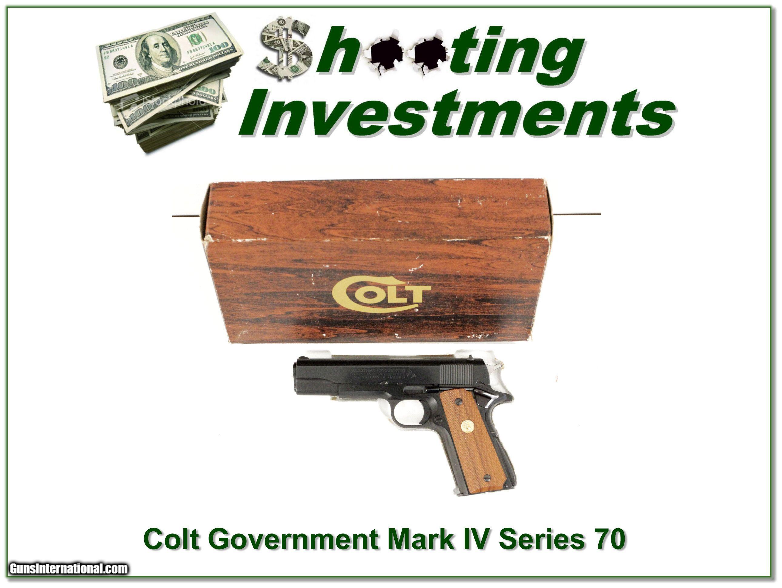 Description: Collectors, this is a as new in the box Colt Government Model 1911 Mark IV Series 70 45 ACP. It comes as shown in original box. I am selling this one on consignment and as such, lay-a-way can’t be used. It does of course have the standard 3-day inspection. Shipping and insurance is $29. Please email me with any questions or larger pictures. (Consign your quality firearms with Shooting Investments for only 10%! Let me know if you have any you would like to sell!) 17-0643 Payment: Payment is by Money Order, Cashiers Check or Personal Check. I can now also accept MasterCard and Visa with a 3% convenience fee. PayPal can be used for some items but never firearms. Please let us know if you would like to pay via PayPal. Shipping: The shipping charge will be listed in each description. It is $39 for most long guns and $29 for most handguns. Some heavy guns or those insured for over $2000 will be higher. Shipments to Alaska and Hawaii are higher because air shipment is required. Most firearms are shipped on Tuesday and Thursday and usually in 5 days of receipt of payment. We package all shipments carefully and insure them. For long guns you can purchase a new Plano case for $19. They now cost us $22 when buying 100 at a time. Optics are shipped Priority Mail and most other non-firearm shipments are shipped First Class. Returns: Our return policy is simple. If for any reason you are not pleased with your purchase, you may return your item for a full refund of purchase price. Ammunition cannot be returned. It is important to us that you are happy. Guns cannot be fired or dissembled before returning them and they must be returned in the same condition as received. Notification of a return must occur with-in 3 days of receipt at your dealer. Shipping, convenience and dealer fees are not refundable and are the responsibility of the buyer. Lay-a-way: If needed, we offer a 60 day lay-a-way option on most firearms. It is 1/3 now, 1/3 in 30 days and 1/3 in 60 days. Lay-a-way firearm sales are final and if not completed the first payment cannot be returned. Consigning your firearms with Shooting Investments: We will help you get top dollar for your firearms. While most local guns shops charge 20% or more, our fee is only 12% with a minimum of $75. At your local gun shop it might take months to sell. Selling on-line provides instant access to thousands of interested buyers. You won’t find any other on-line dealer willing to sell your firearms for only 12% or listing every gun on 3 separate s. Selling through an House typically costs the seller 15% and the buyer an addition 15% (so 30%) and you have to wait several months to sell and longer to receive funds. If properly priced, we will sell your firearms in a few weeks. Send us an email or give us a call and we’ll explain how easy it is for you to get top dollar. Trading: Trading for use is really just buying your gun to re-sell. If you have a gun you want to trade, please email a picture and we will let you know what we can give or it. You will always get more if we sell it for you on consignment. Help for California Buyers: We are happy to ship to California. It is the buyer’s responsibility to make sure any item you buy is legal in your state. We are also happy to help with your purchase of a firearm from someone other than us. If you see a gun you would like to buy but the seller can’t or won’t ship to California they can ship to use and we’ll then ship it to your California dealer. The cost for this service is only $30 + shipping. Let us know if we can help! SOLD |