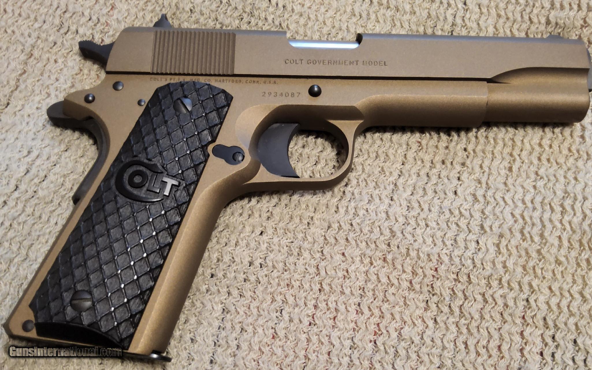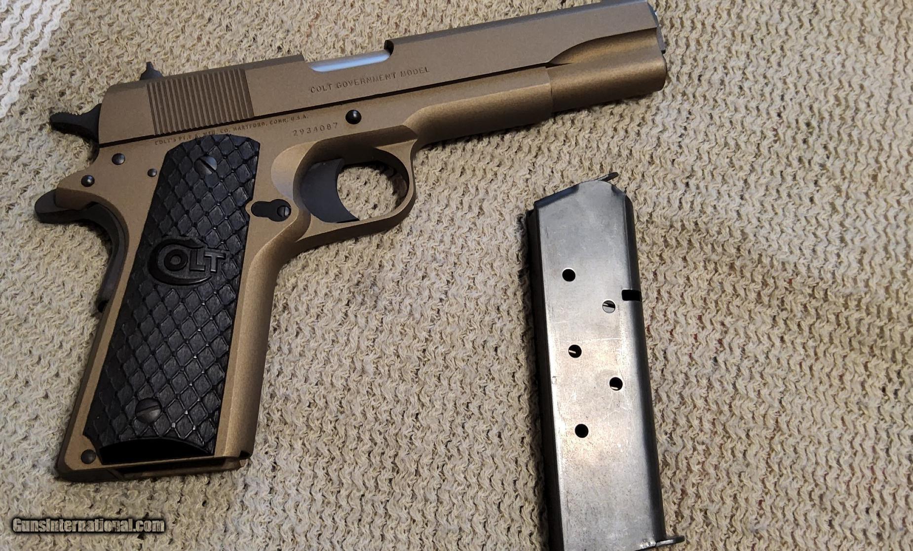 Description: **Price Reduced**Colt 1991A1 45ACP government model. Tan and black with 1 Mag. See pictures for more details. Please add $75 for shipping and insurance. SOLD Handgun Caliber: .45 ACP (.45 Auto) Manufacturer: Colt Model: 1991A1 Condition: Excellent Metal Condition: Excellent Bore Condition: Excellent |