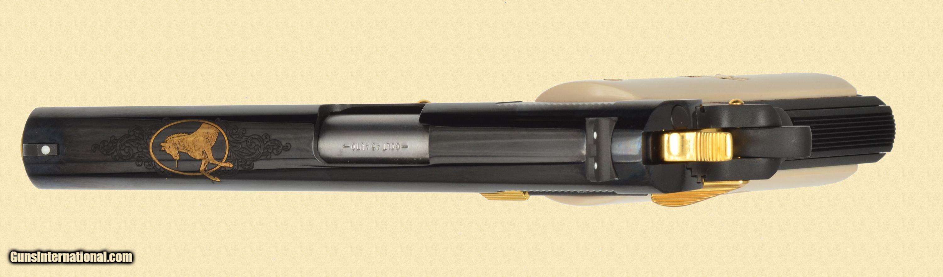 Description: 45 ACP; 100% blue, mint bore, mint grips, 5'' barrel, Lew-Horton custom, FEDERAL FIREARMS LICENSE (FFL): is required on all shipments of modern guns. We must wait for a copy from your dealer before we can ship to them. We will also ship C&R eligible firearms to Curio and Relic (C&R) license holders. We accept your signed, legible FFL and C&R licenses via fax at 309/ 342-5730 (always on), email at FFLsimpsonltd or through the mail at Simpson Ltd; 140 S Seminary St; Galesburg, IL 61401. Pre-1898 firearms and non-firearms items are exempt from licensing requirements. All items shipped to an Illinois address will be charged 8.75% sales tax. NOTE: Because of recent shipping restrictions and charges placed on us by UPS and FedEx (handguns must ship via next day or 2nd day air and they have added a $10 surcharge for parcels over 48”. Our return policy lasts a maximum of 3 days from the time you receive your item. If 3 days have passed since you received your purchase, and we have not been contacted by you, unfortunately, we can’t offer you a refund or exchange. If you are not happy with your purchase, please contact us by phone and/or email to arrange for a return. Items must be shipped back to us to arrive with 7 days of notification of return. SOLD Serial Number: GV201258 |