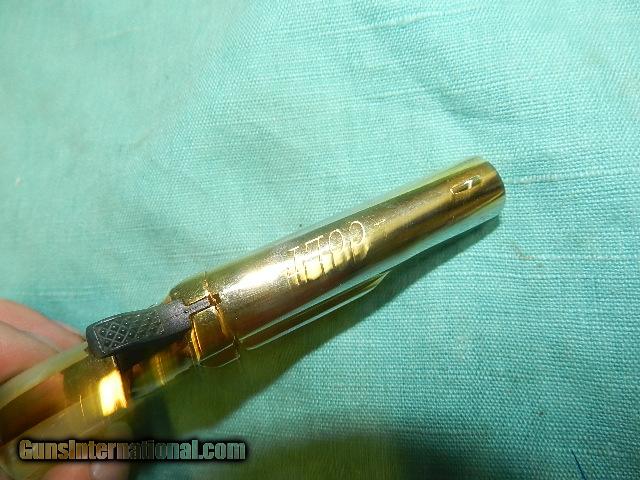 Description: Colt .22 short derringer with a black finished barrel, and a gold plated frame. HasMOP faux grips, and hammer locks back and fires, but can't open the barrel. Looks about un-fired. To buy a gun from me you must get a direct email for me, with details, and shipping cost. We don’t have asite .I prefer money orders or a check. Item ships when funds come in. If you can only pay with a card let me know. I’m sorry I don’t list my phone number, did that for 30 days, never again.. I can’t talk on the phone all day…who will ship the guns? I’m just one person, and it’s very busy here! I do a brisk volume! I hope you like my wide selection of unusual guns, knives and gun parts. Shipping price determined by zip code. I try to keep the prices affordable, which means I make less money than most dealers. You won’t get altitude sickness with my prices! I consistently have the best selection of older guns If you attempt to buy, you must still contact us for details, buying doesn't end the sale, it just sends an email telling us you want to buy this gun. A phone call won’t secure a sale! Not home many times, the first buyer by email buys the gun !Thissite does not close down a sale when you do a BUY! I can get six buys in an hour, first buyer to email gets the guns, others are in second place! Best to send another email . Sometimes not home to get calls. Some guns are required shipment to a gun dealer near you for a transfer to you when it arrives. With the widest selection of older guns at great prices, We don’t have a store, and sell on the internet only. SOLD |
