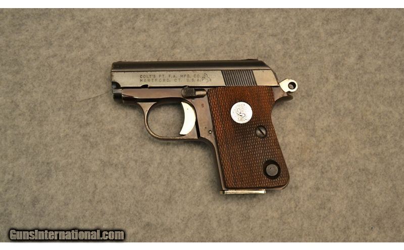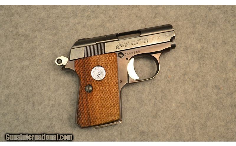 Description: Colt 25 Automatic pistol in .25 ACP in good condition. Note: Prior owner's 3 initials engraved on right side of slide near muzzle. .25 ACP SOLD Metal Condition: "Good condition, some wear. Prior owner's 3 initials engraved on right side of slide near muzzle. Wood Condition: Good Bore Condition: Good Barrels: 2 Weight: 13 Oz Sights: Fixed Item Location: christiana |