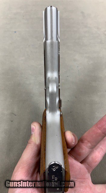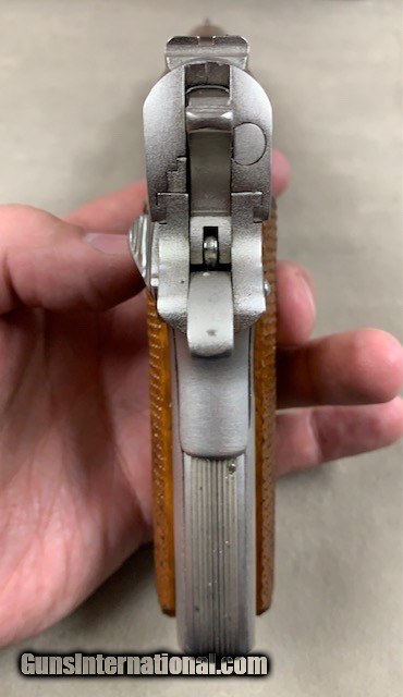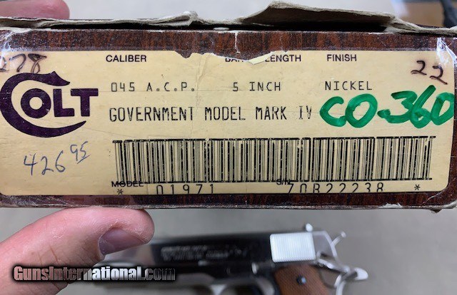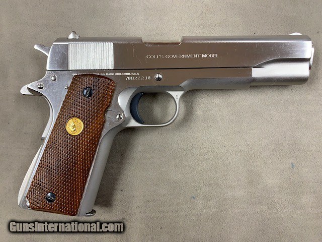 Description: This is a mint unfired Colt Gov't Model .45 acp in Bright Nickel, the Mark IV 70 Series that is so desireable, and even with the original box (correct label) and styrofoam insert, manual, etc. Outer carton a bit worse for wear but present. These Hi Polish Series 70 guns are next to impossible to find and I see them advertised for a lot more. This gun is mint and cannot be improved upon. SOLD Handgun Caliber: .45 ACP (.45 Auto) |