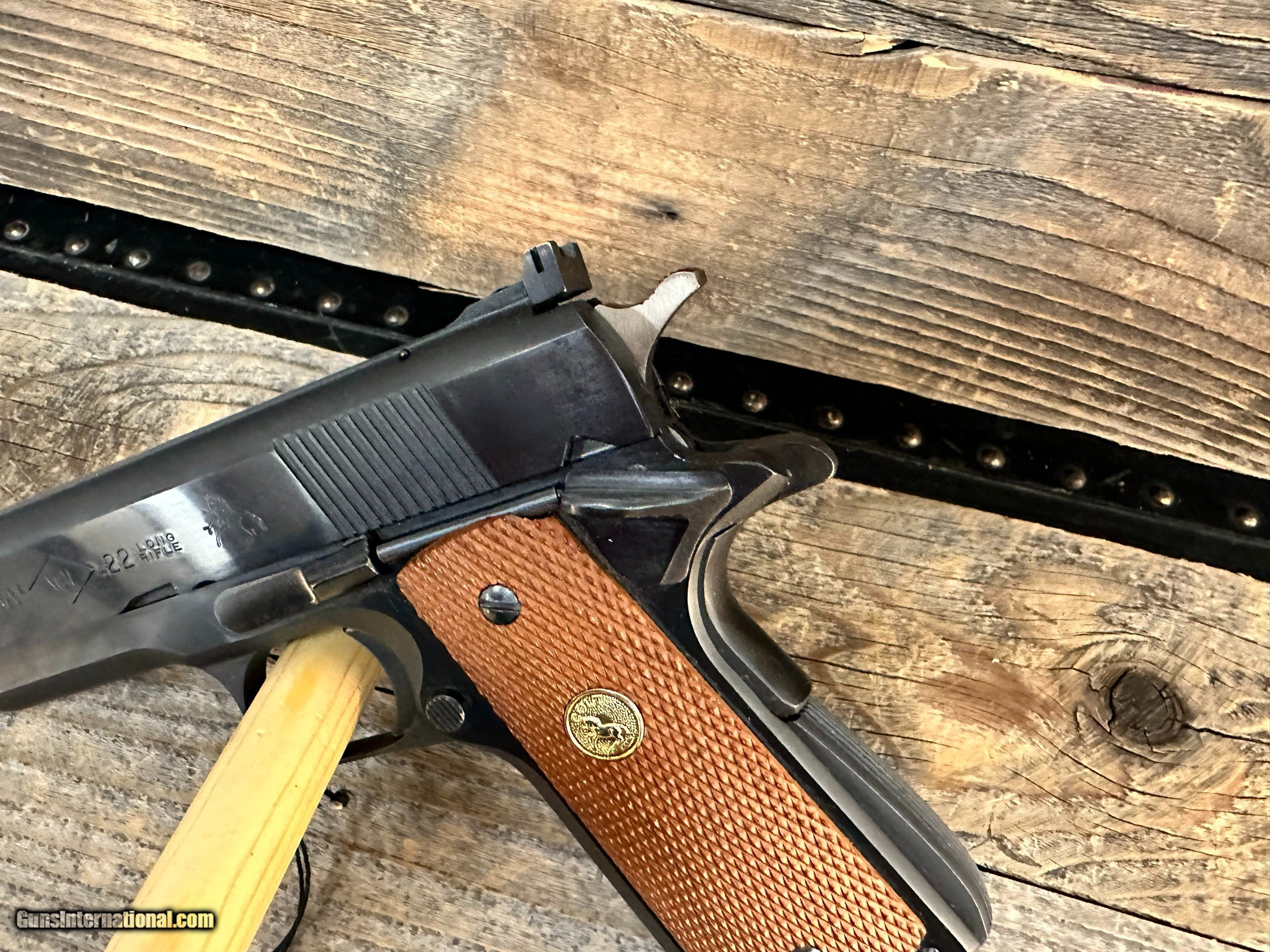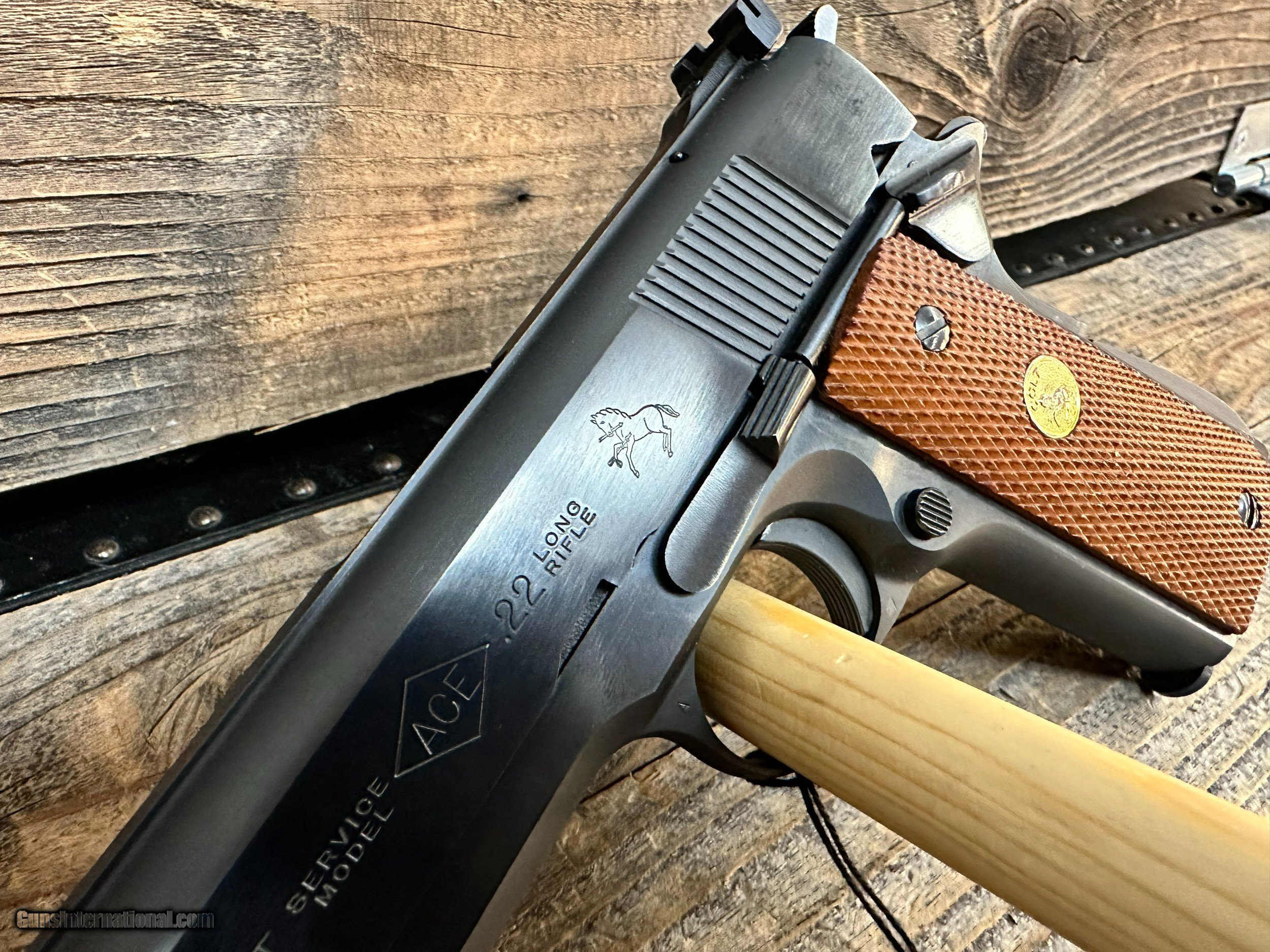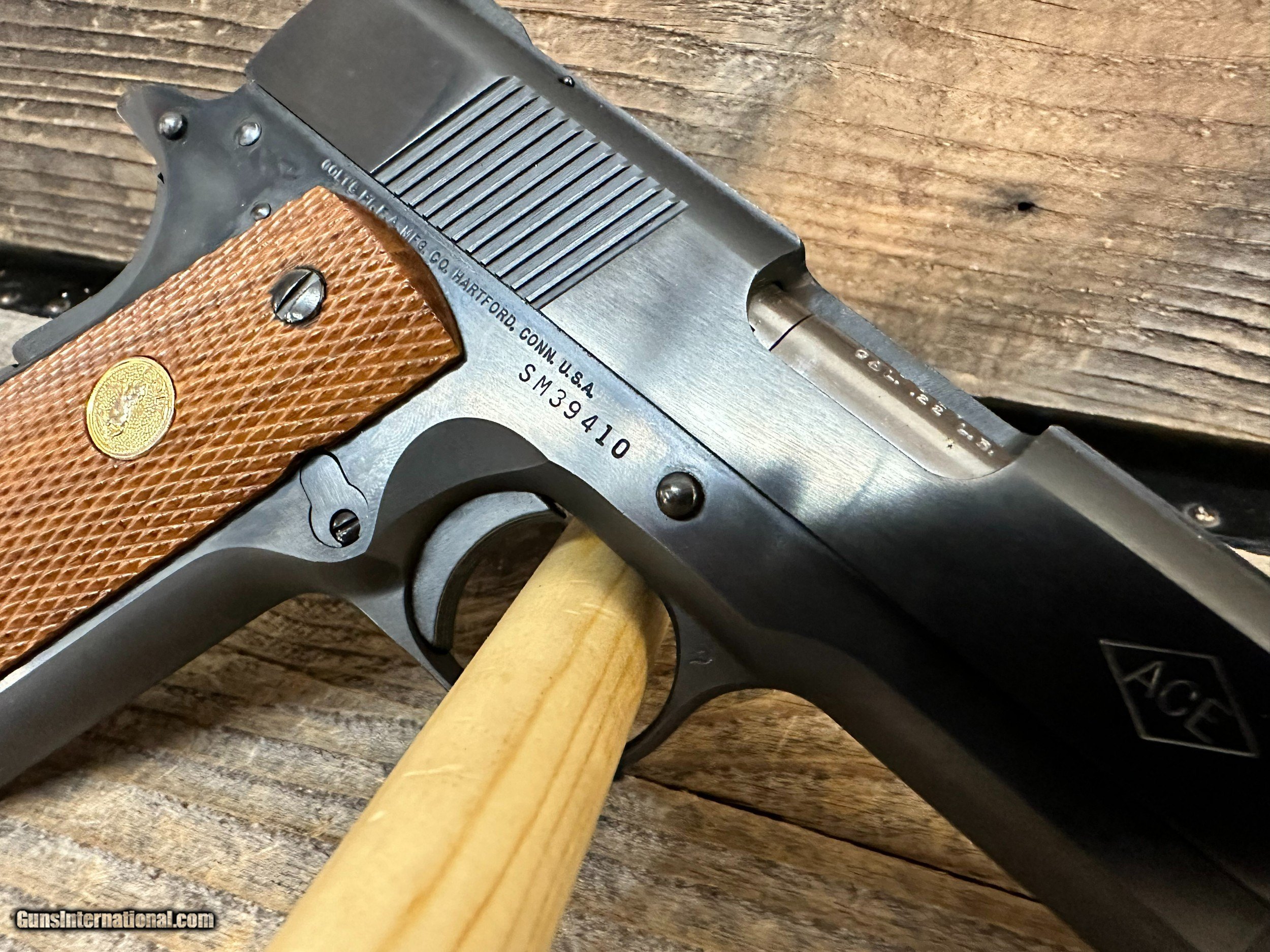 Description: Colt Ace 22 LR MFG 1981 While the Colt 1911 was chambered in the powerful .45 ACP cartridge, the externally similar Colt Ace was chambered for the far less powerful .22 LR cartridge. Accordingly, military, police, or civilian shooters could shoot the Ace without the recoil and expense of the 1911, but with similar ergonomics and sight picture. Shipping starts at $75 for long guns and $50 for handguns No sales or shipping to New York, New Jersey, California, Hawaii SOLD Handgun Caliber: .22 Long Rifle Manufacturer: Colt Model: Ace Serial Number: SM39410 Condition: Very Good Metal Condition: Very Good Wood Condition: Very Good Bore Condition: Very Good |