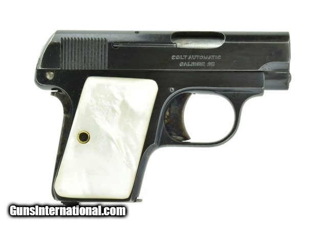Description: Colt Automatic .25 ACP caliber pistol. Pre-war pocket pistol made in 1920. Has about 95+% blue, with strong case colors on the trigger, safety and grip safety. Has beautiful pearl grips. Bore is very good.