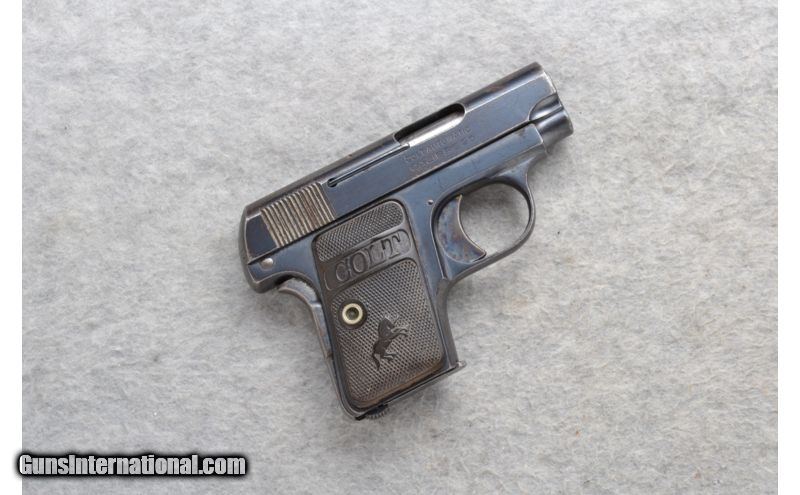 Description: This Colt Model Automatic is a .25 Auto Cal. semi-automatic pistol. It is very small, light and concealable. In overall fair condition it shows some age and use. It comes as is with one magazine. SOLD Manufacturer: S/N 3437XX Caliber Info: .25 Auto Chambers: Detachable Magazine. Metal Condition: Fair. Shows light wear, minor handling marks and minor freckling. Bore Condition: Very good. Barrels: 2 inches. Triggers: Solid. Stock: Diamond checkered hard black plastic with COLT and the Colt horse logo. Weight: 15 oz. Sights: Blade front. Integral notch rear. Item Location: Richfield, WI |